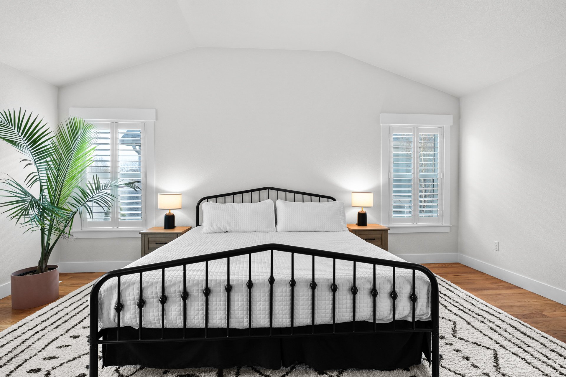 Upstairs, the primary suite offers vaulted ceilings, a walk-in closet, newly installed double-hung windows, and a full en suite bathroom with new lighting and new vanity mirrors.