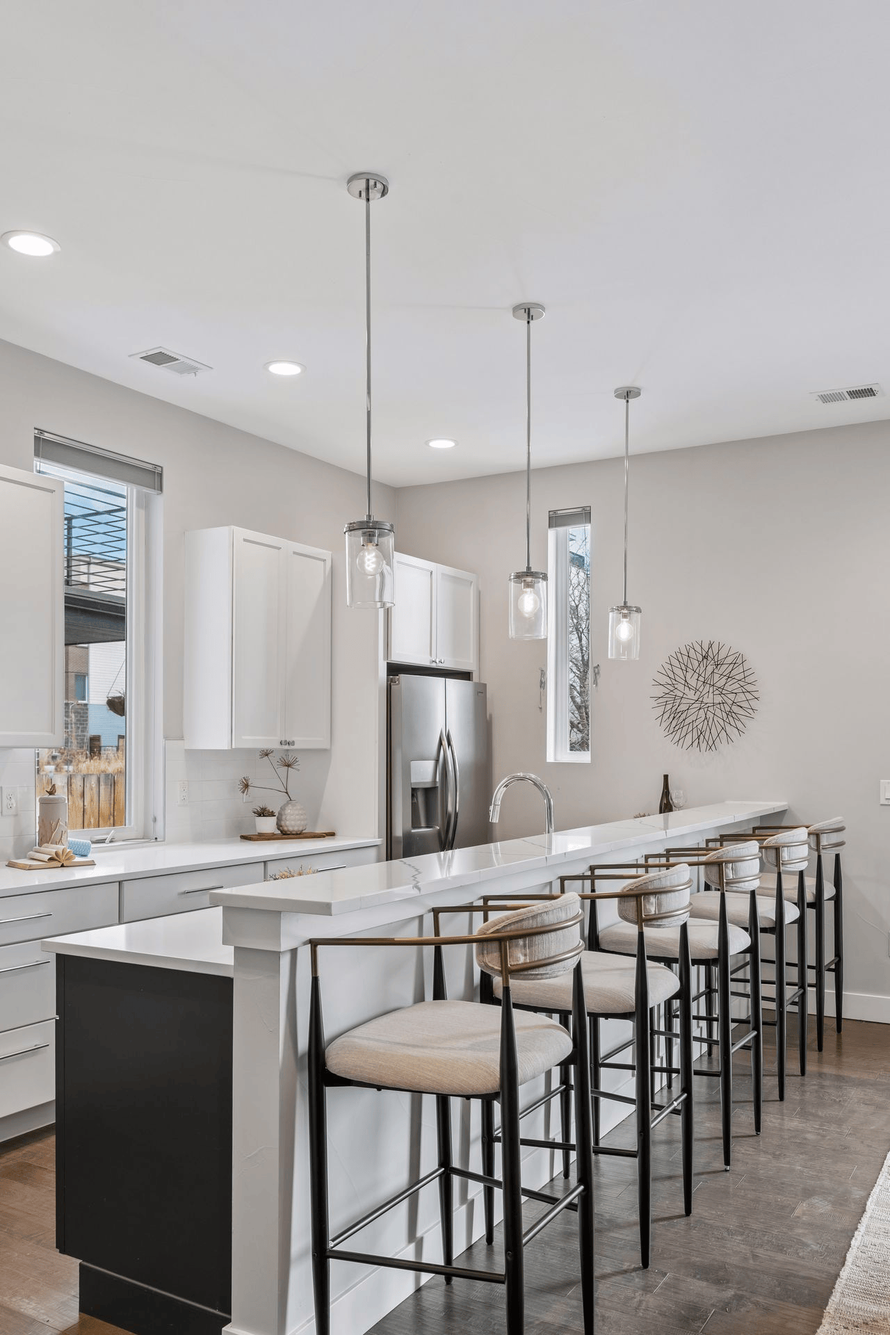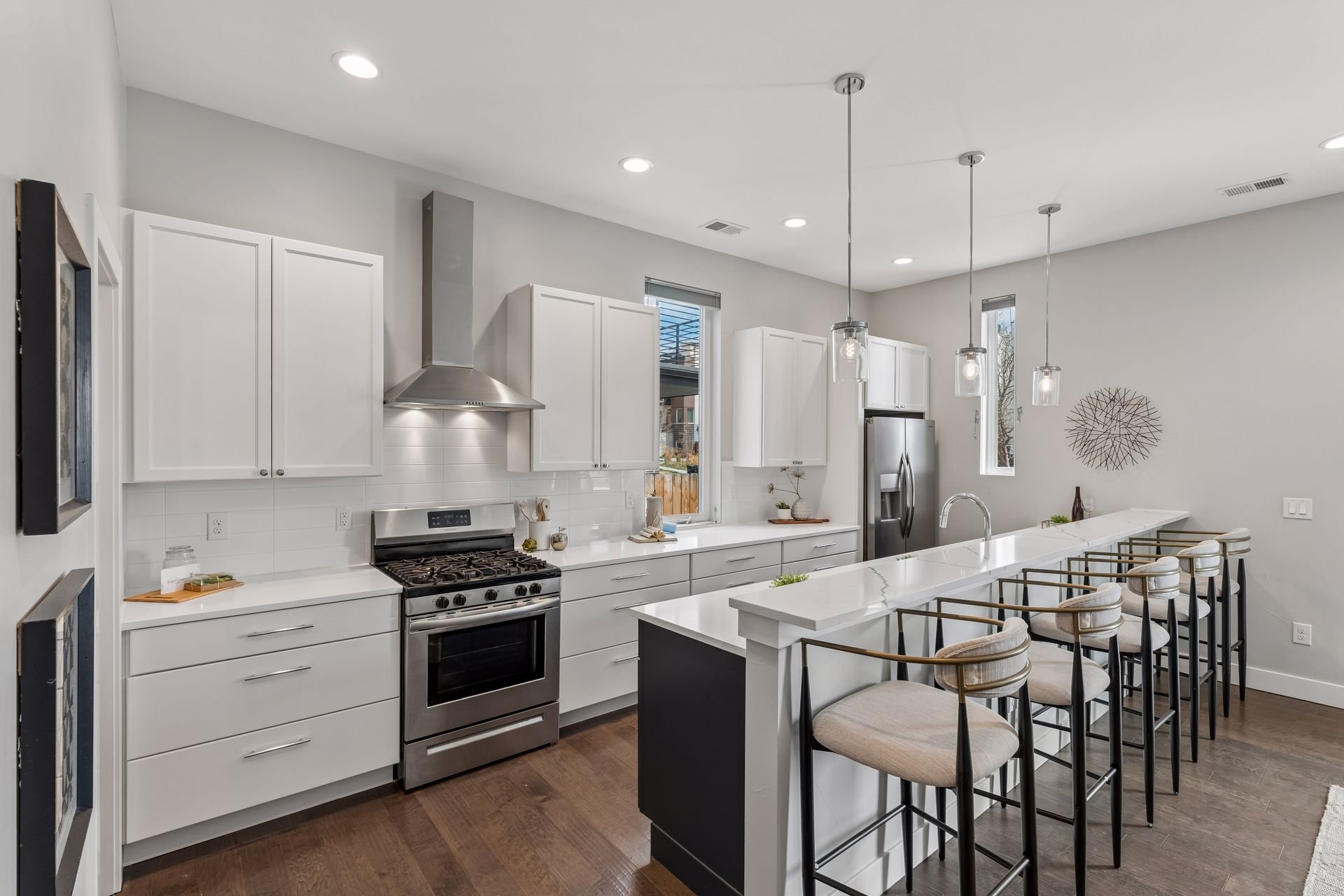 The main level features an open layout with dark hardwood floors, soaring 10-foot ceilings, a spacious living and dining area, a stunning kitchen equipped with quartz countertops, stainless steel appliances, and an oversized peninsula that comfortably seats five, a convenient powder room, and several tall windows that fill the space with natural light.