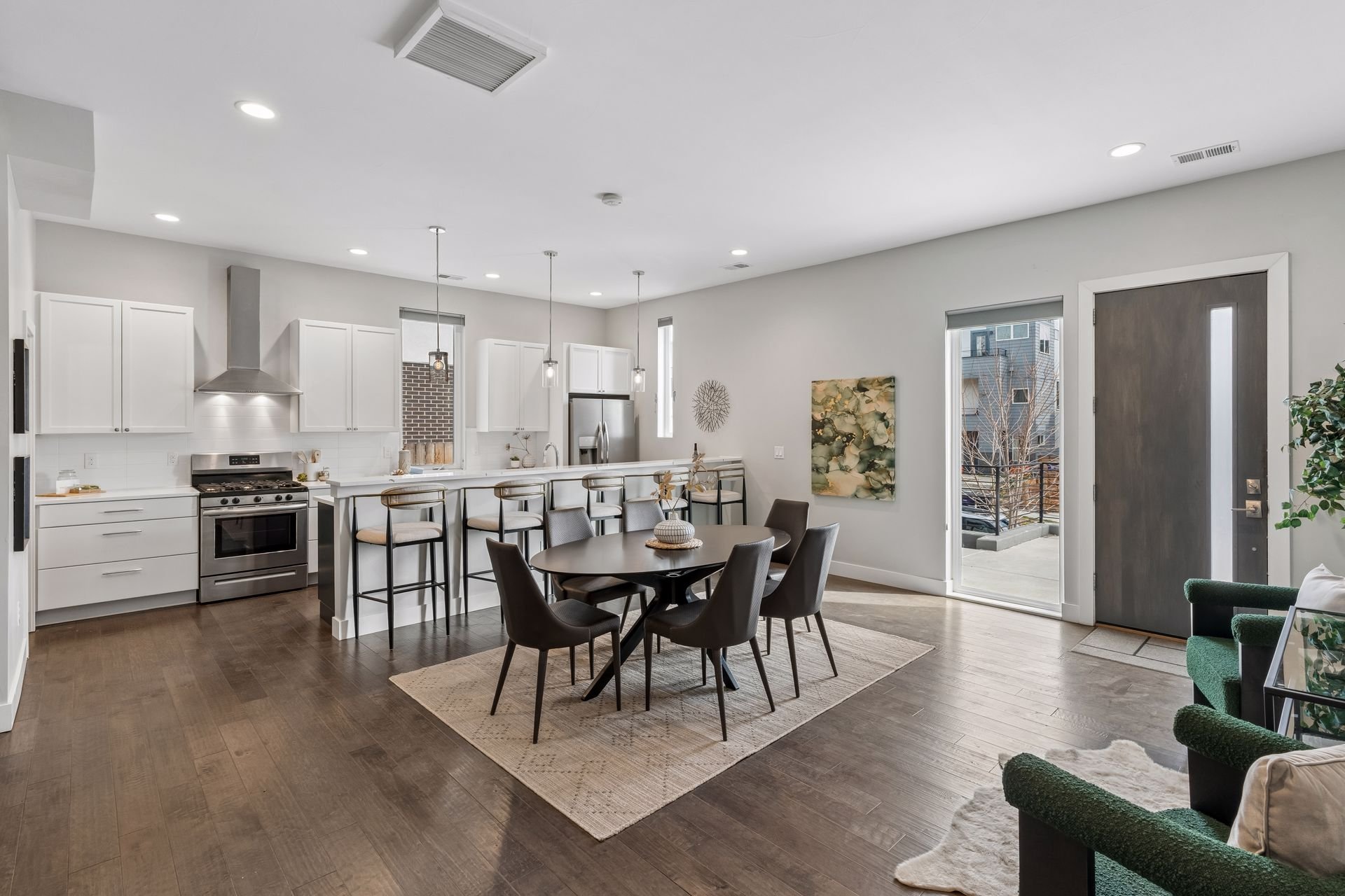 Positioned as the front unit on Perry Street, rather than tucked into an interior townhouse row, this contemporary home benefits from more natural light, a more open setting, and direct street access, in contrast to the more enclosed feel of most townhomes in the area.