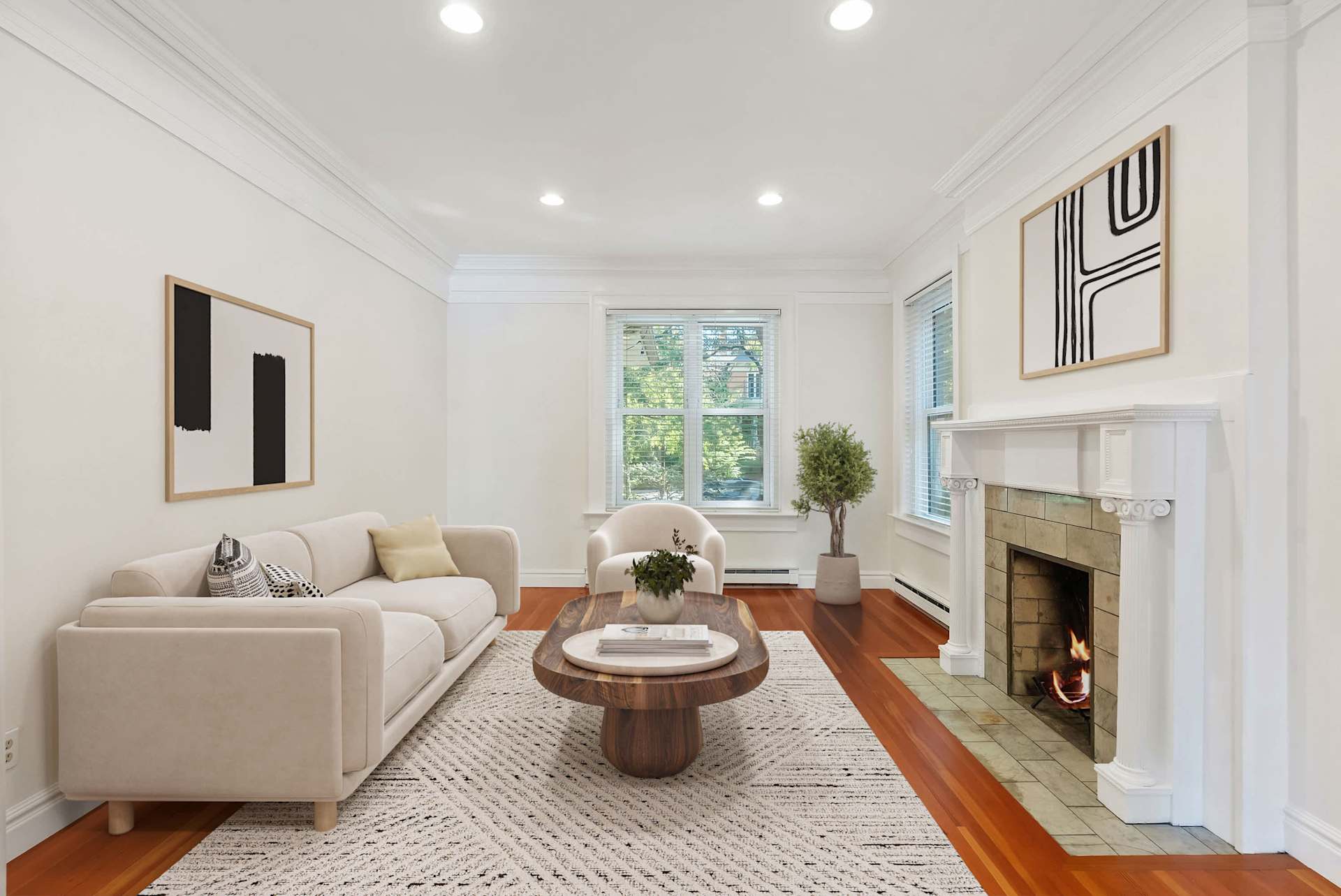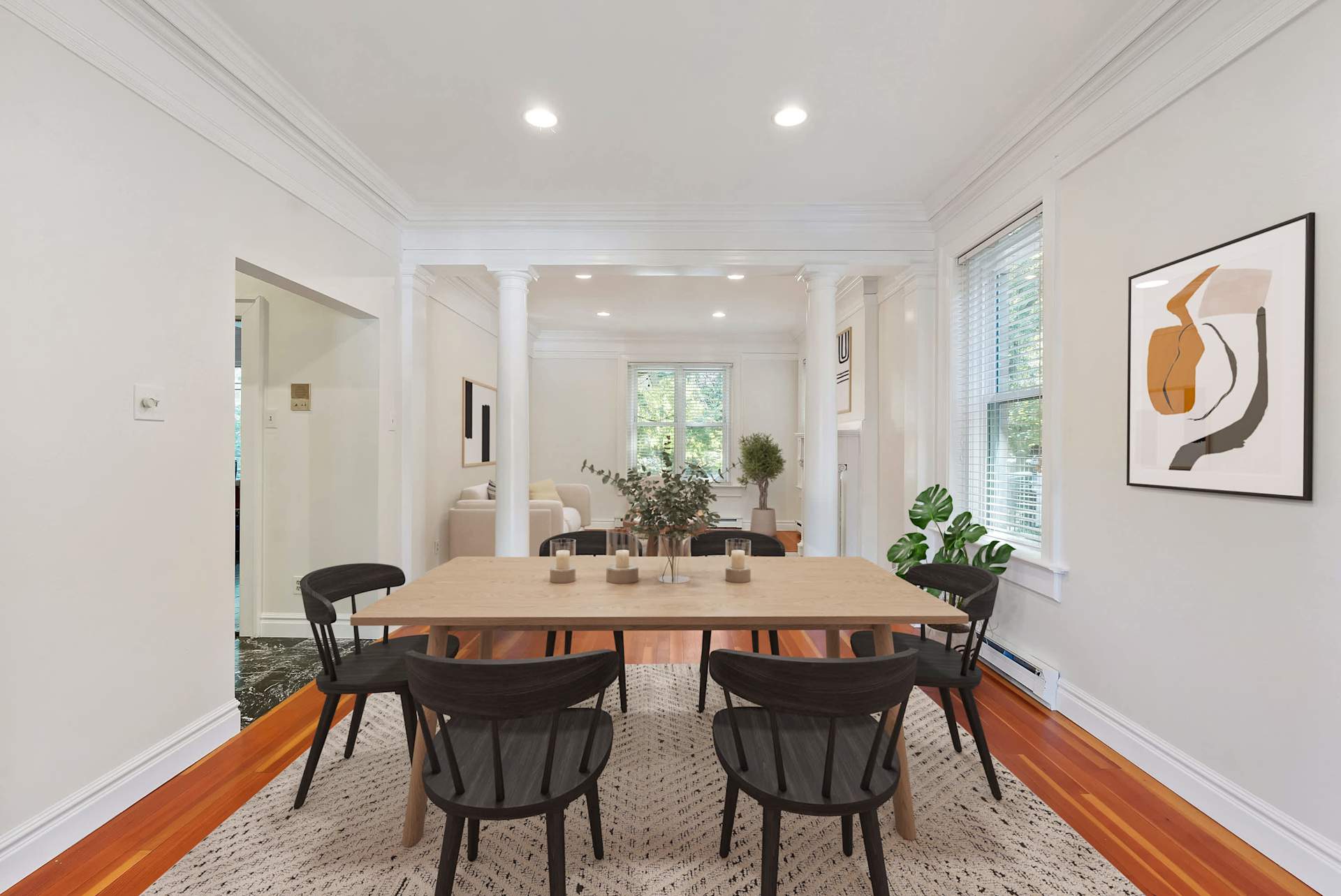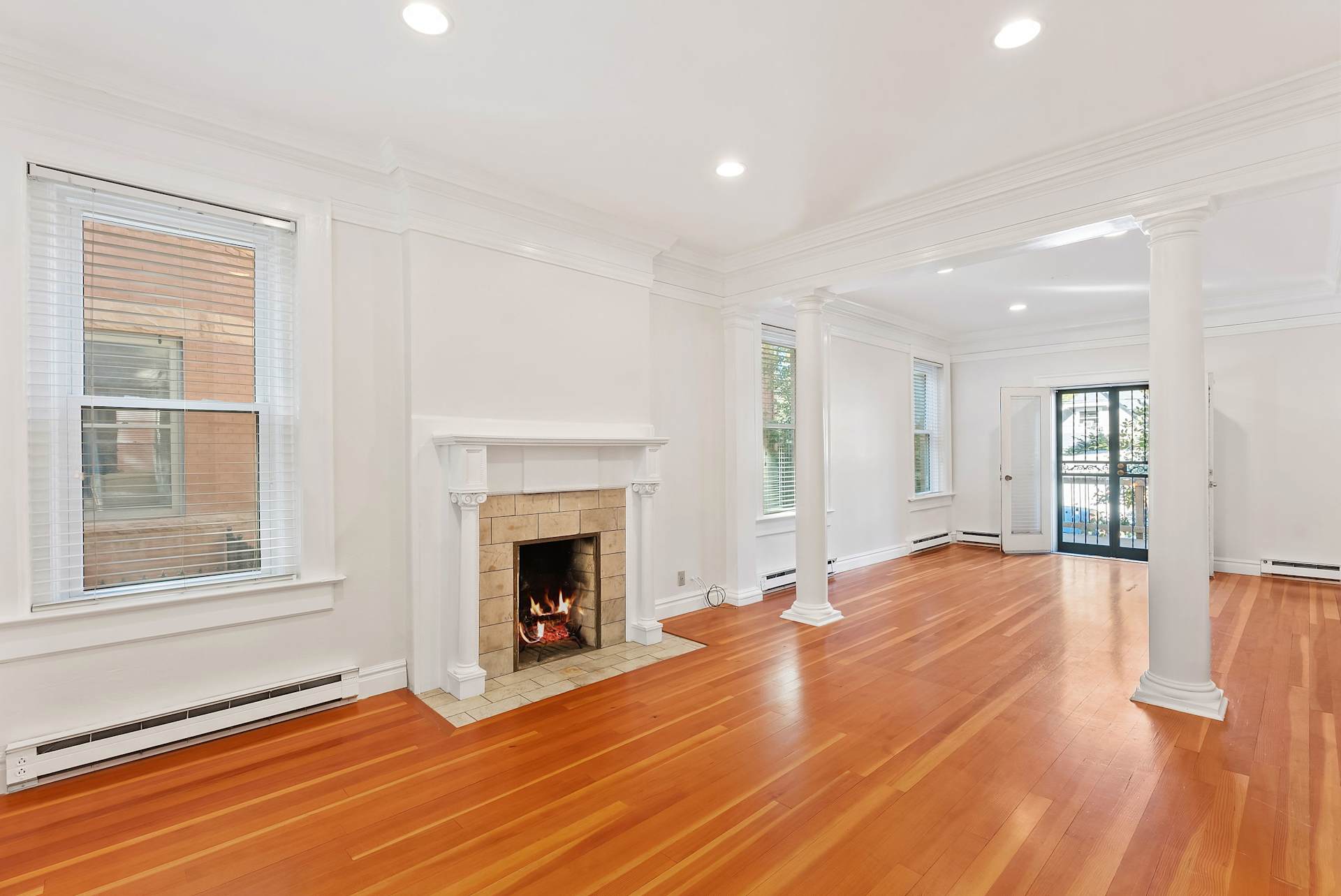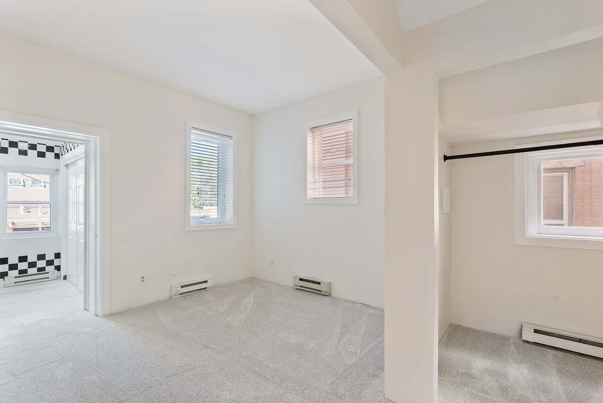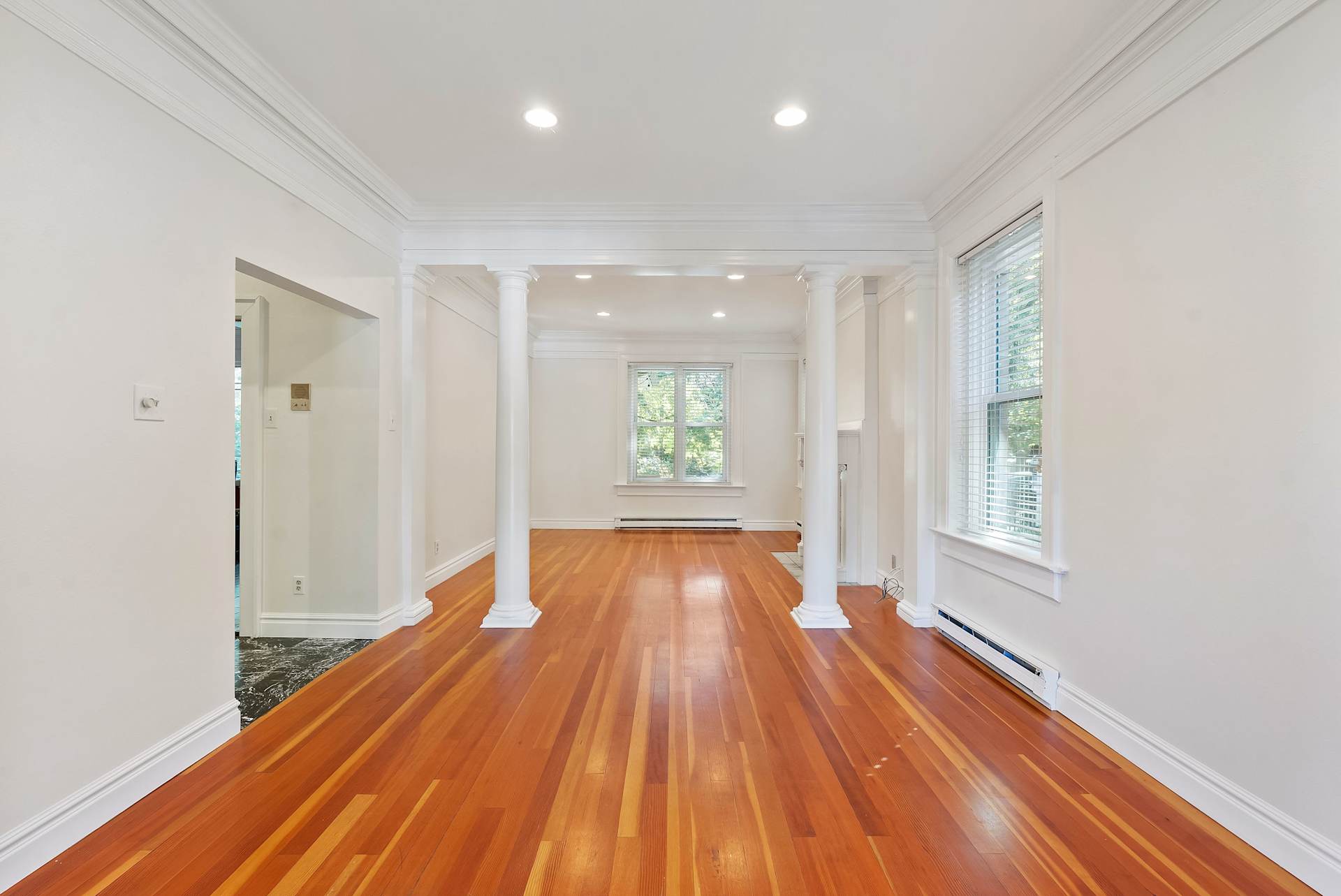 The first thing you'll see once stepping into the fenced in shared yard is the large covered porch. Inside the home a common area shared by two units greets you before heading into the main floor unit ahead.