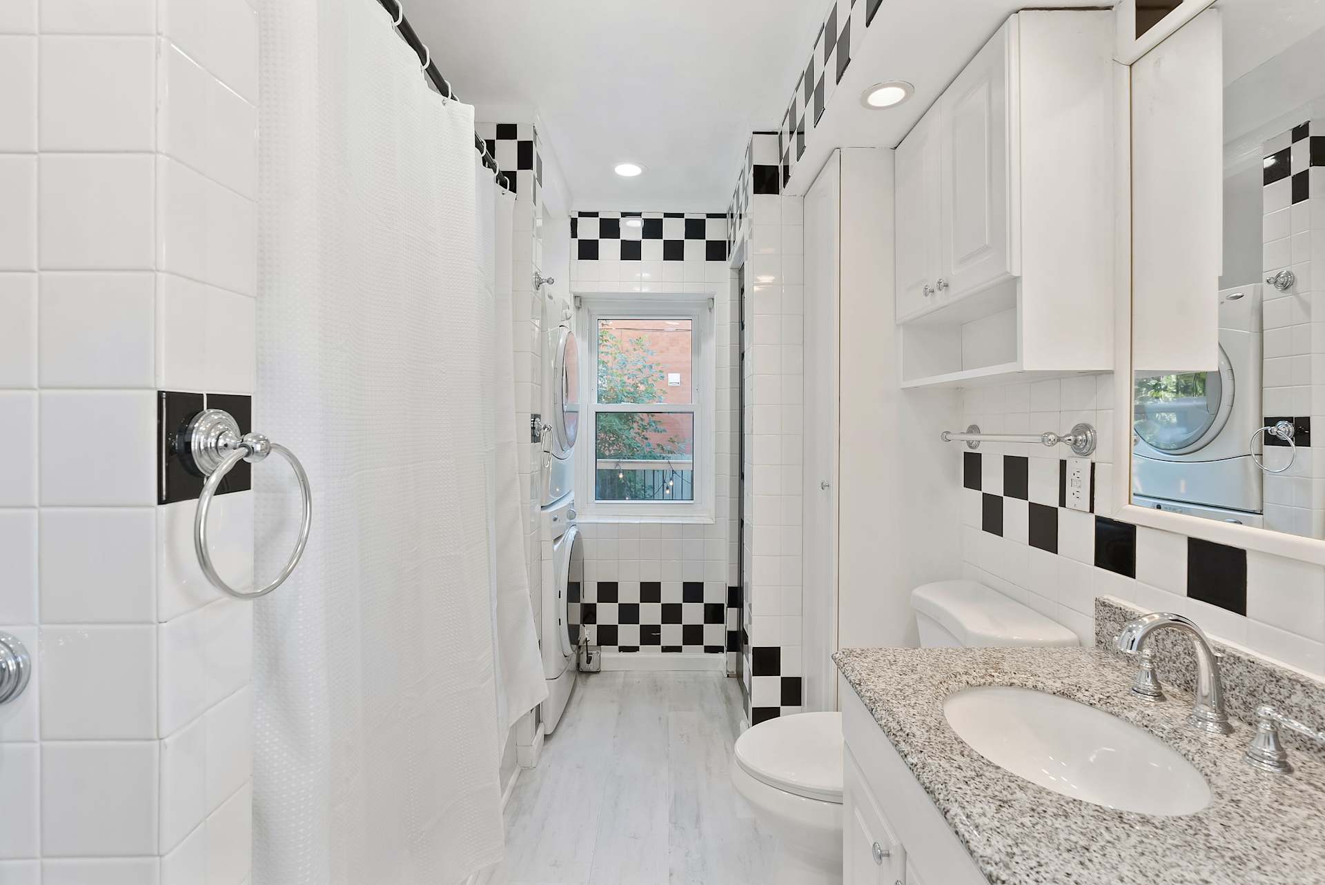 The bedroom boasts a large closet, and the bathroom has ample storage plus in-unit laundry.