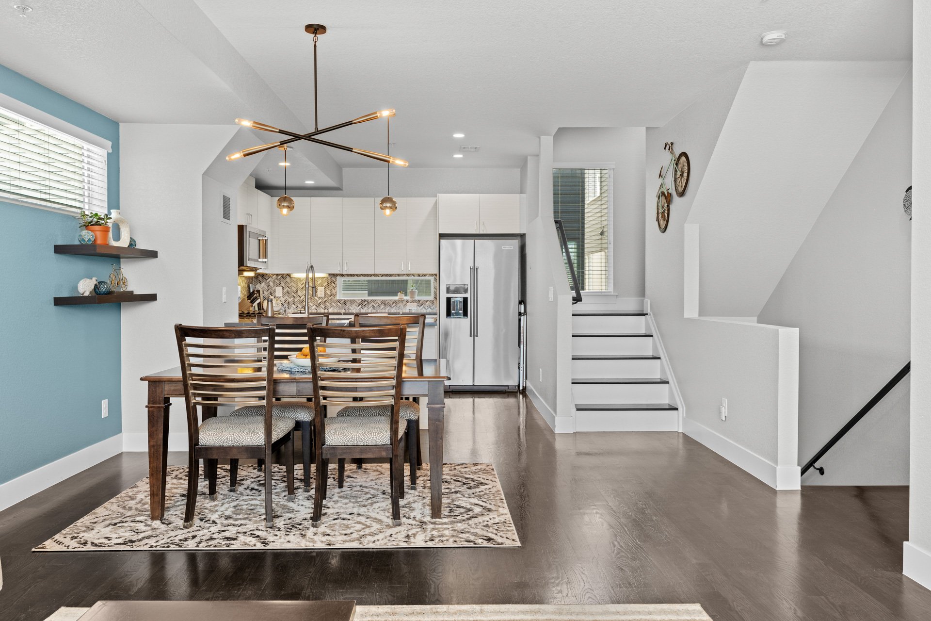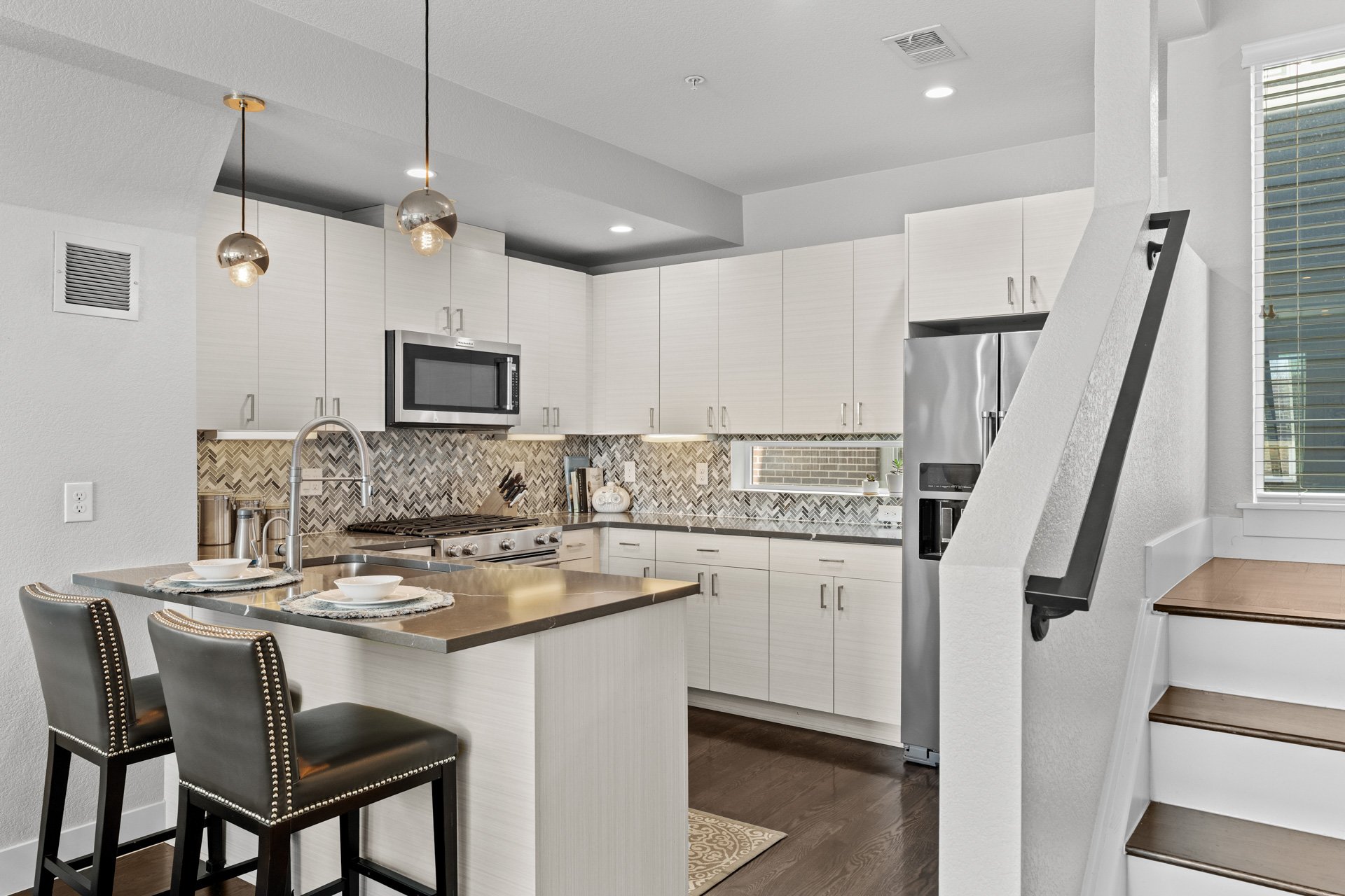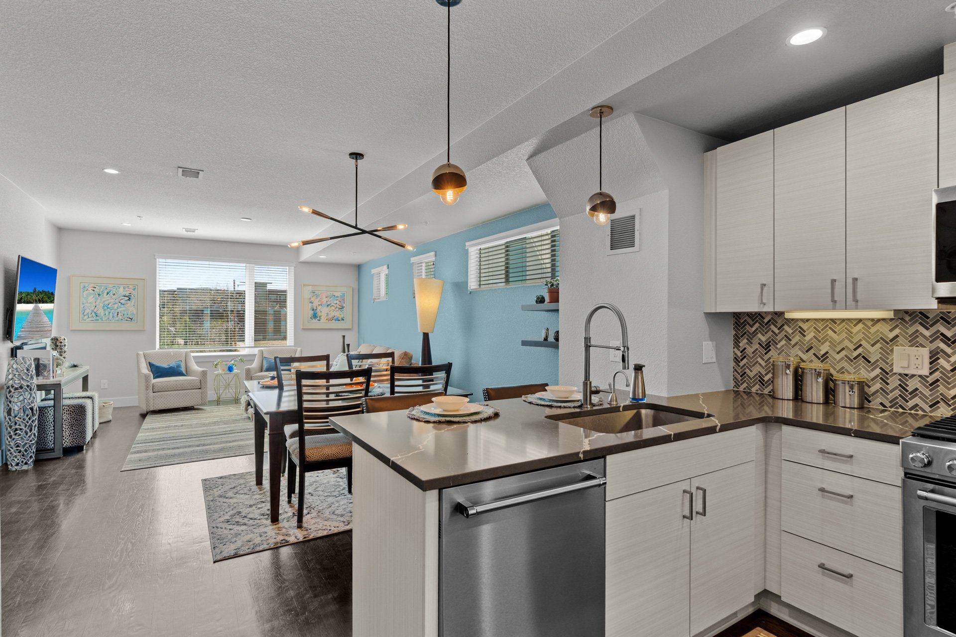 The kitchen features quartz countertops, stainless steel appliances, soft-close drawers, and opens to the dining and living areas.