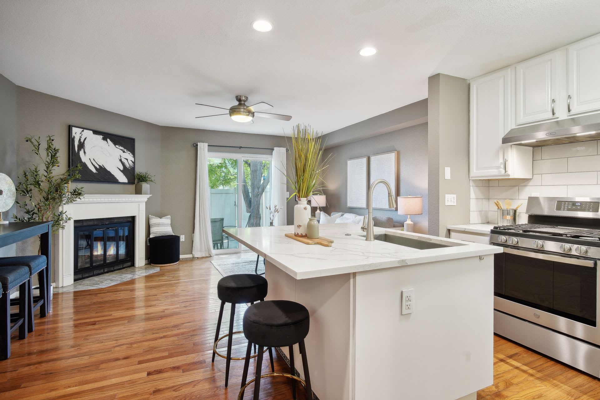 The main level features a gorgeously updated chef's kitchen with quartz countertops/stainless steel appliances/new gas range/new extra large sink/new ventilation/new subway tile/counter seating (stools included!), an open living room with a wood-burning fireplace, a powder room, multiple closets, and a sliding glass door to the large, private, and shady south-facing patio that backs to the greenbelt and features a raised garden bed!