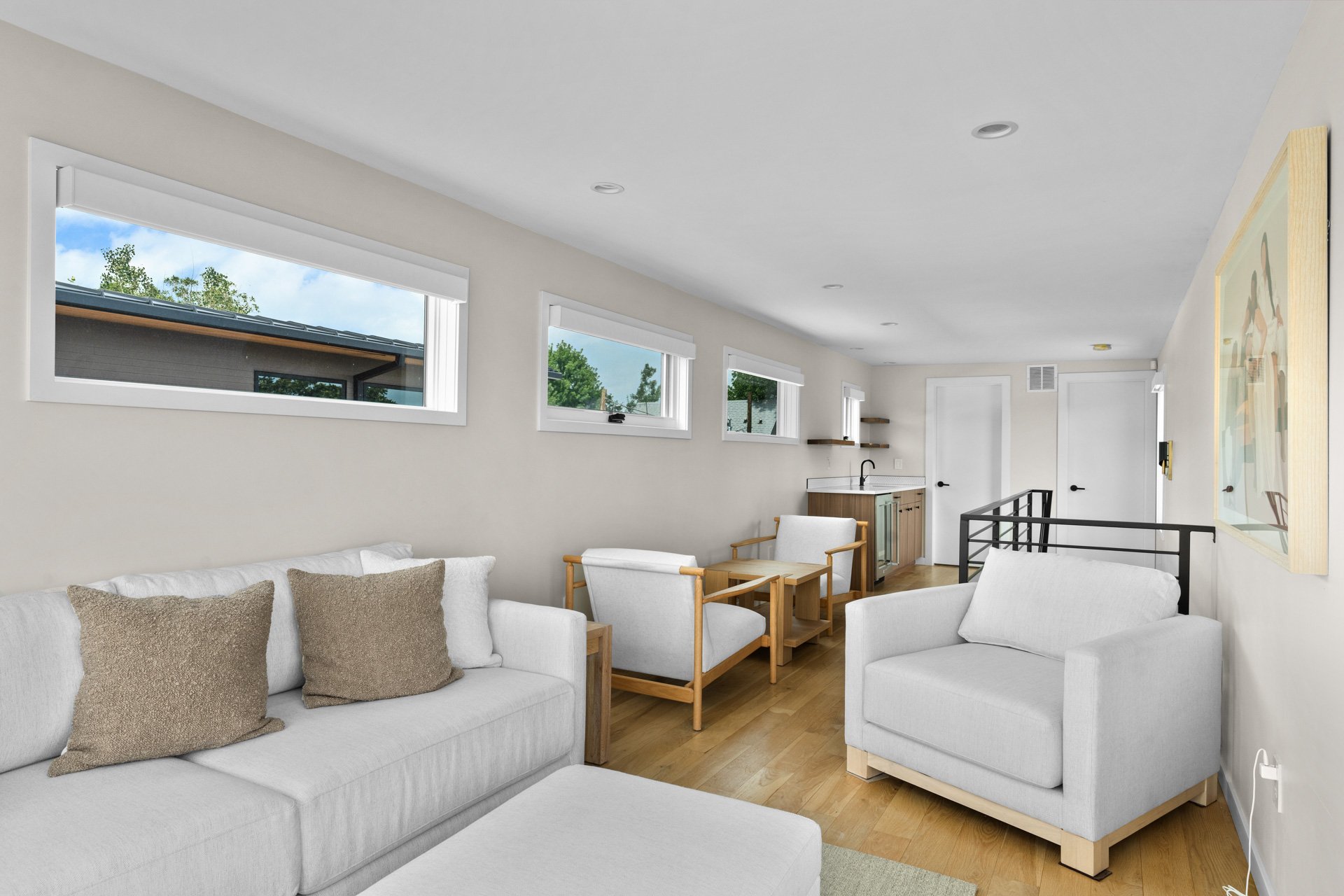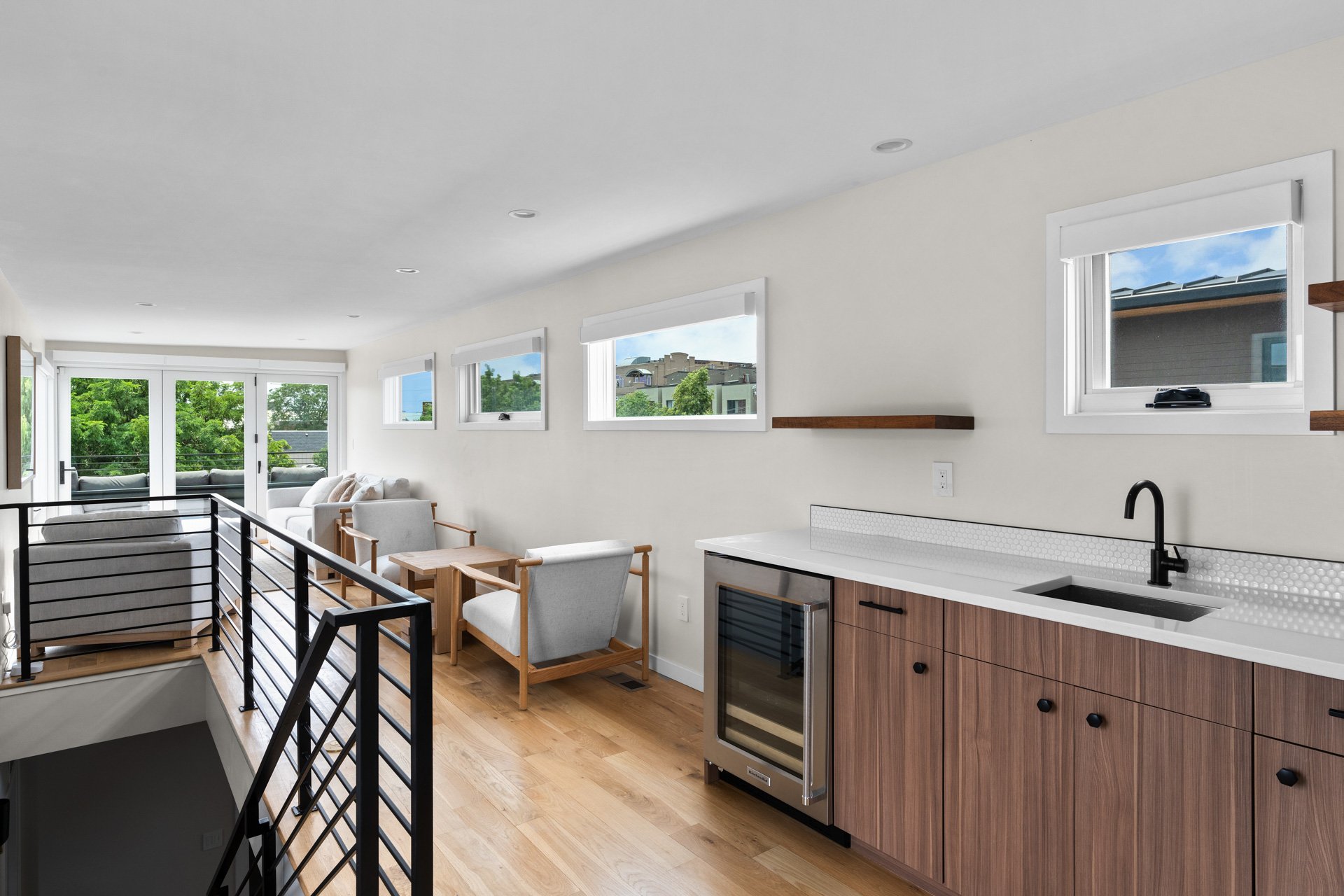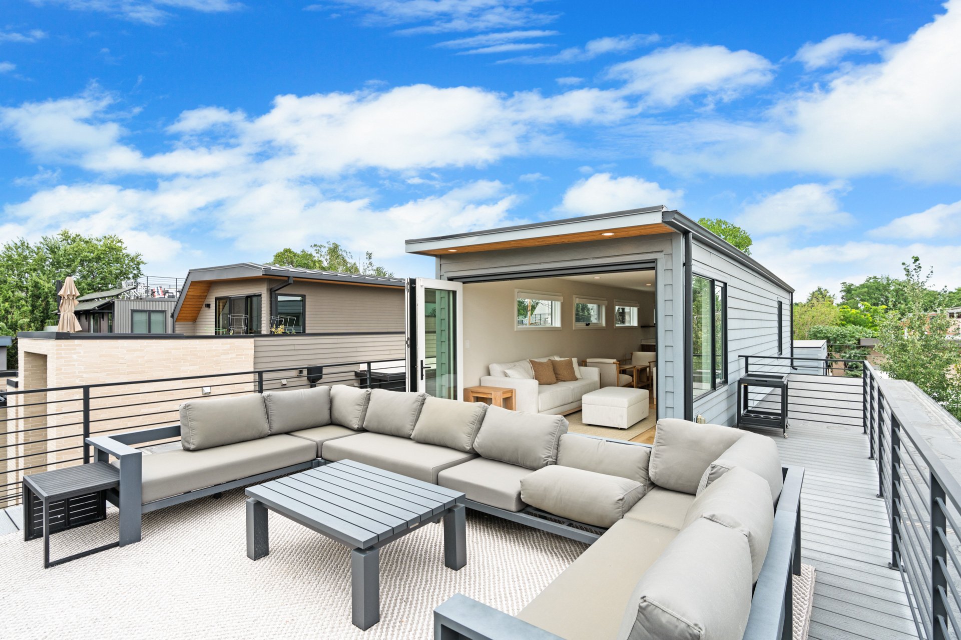 The upper level is an entertainer's dream with a wet bar, an indoor lounge, a powder room, and accordion doors leading to a sprawling rooftop deck (engineered for a hot tub) with stunning views.