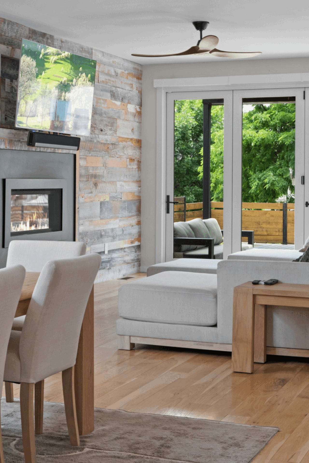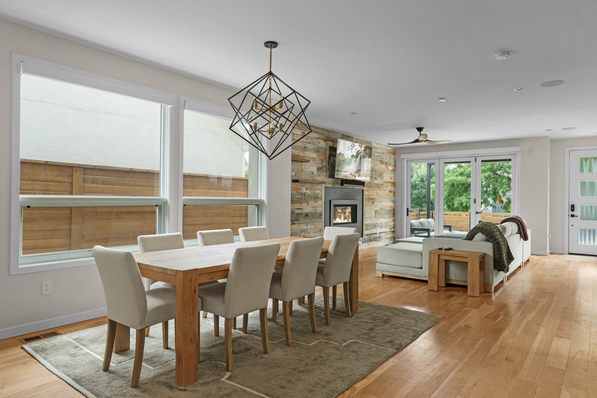 The adjacent dining room accommodates a large table and flows into the living room with a gas fireplace below the included flat-screen TV.