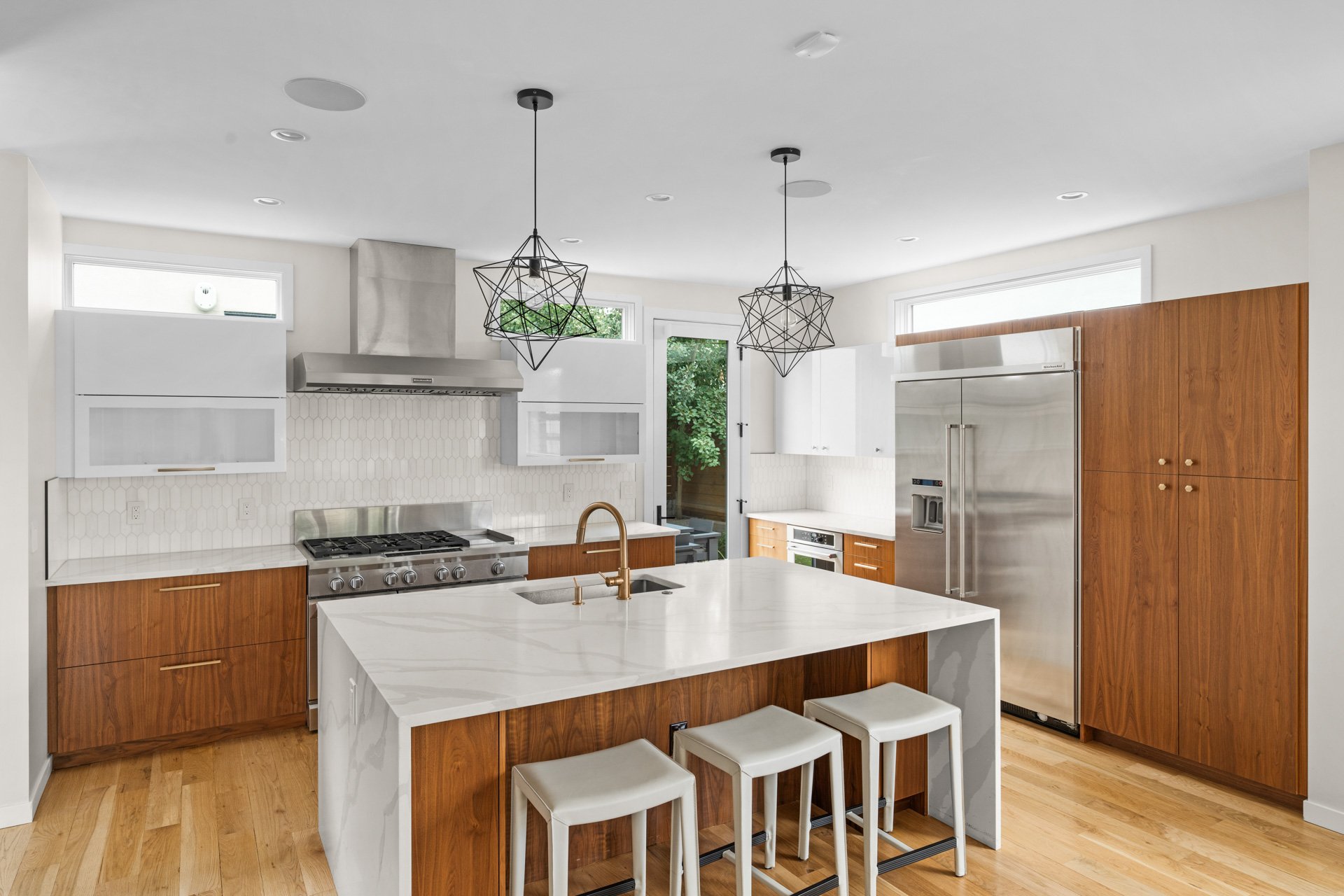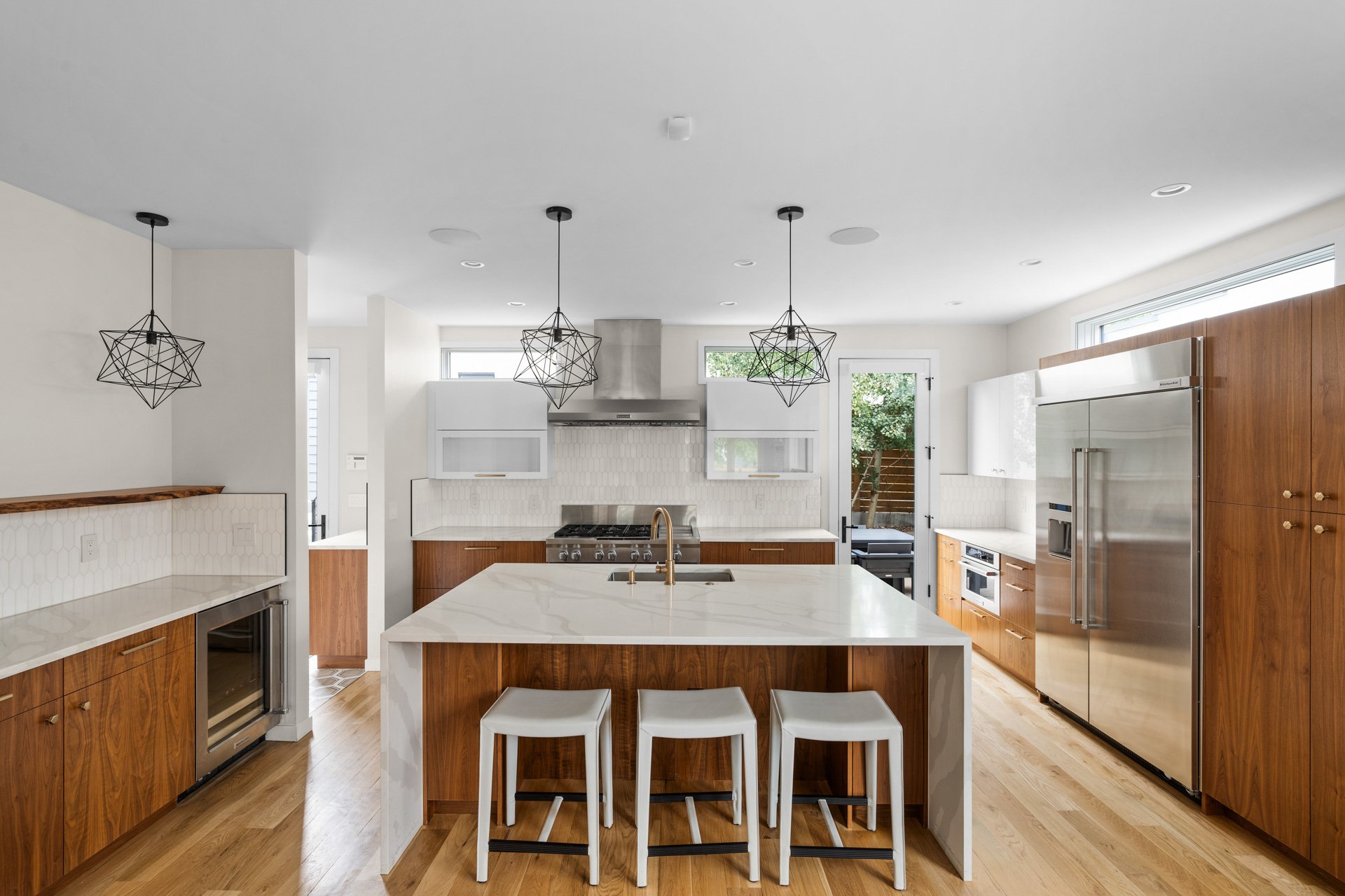 The main level features a functional open layout with a gourmet kitchen that anchors the home with its oversized waterfall quartz island, luxury stainless steel appliances, and walk-in pantry.