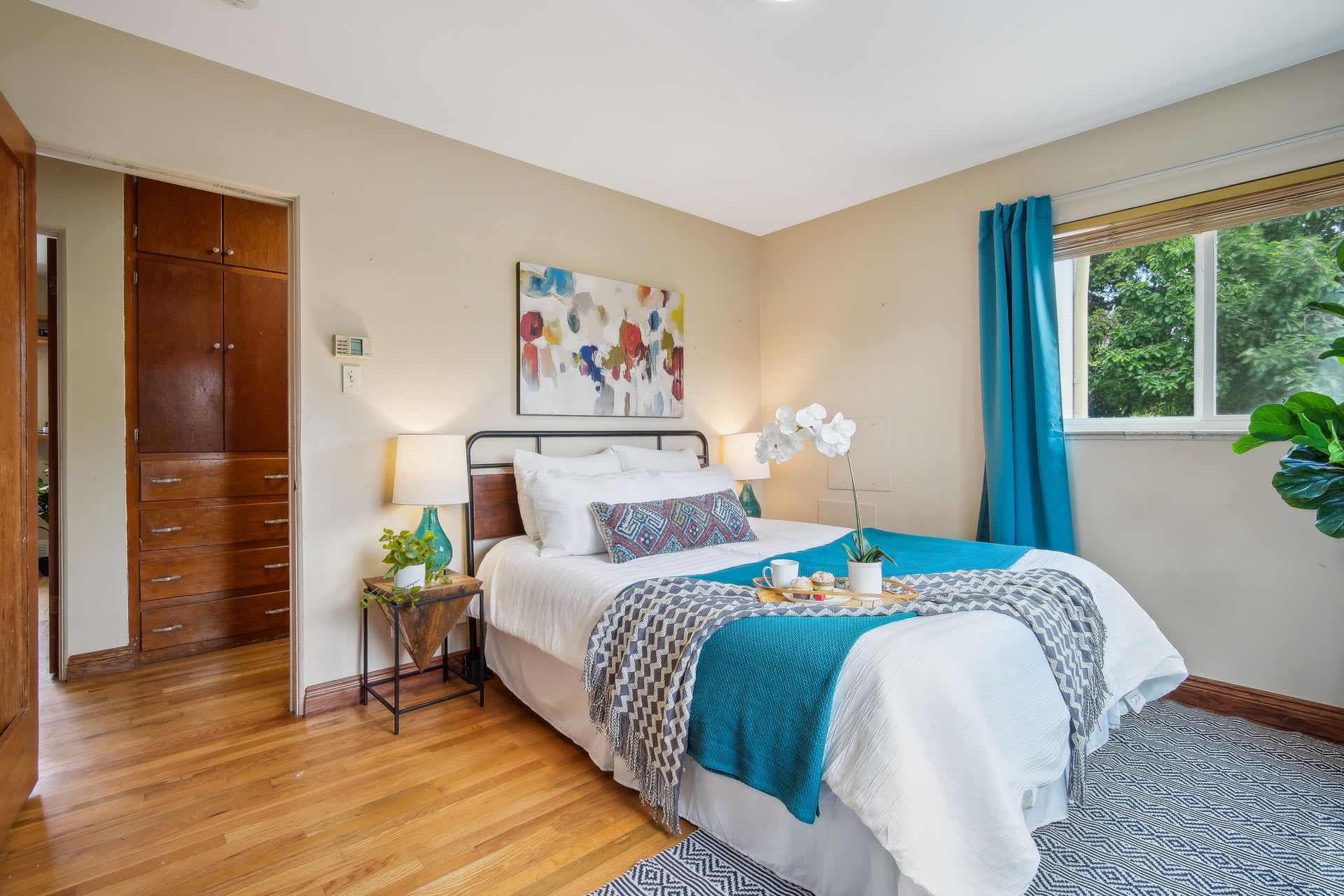 The main level of this home features a spacious southwest-facing living room, charming wood floors, an open kitchen with stainless steel appliances and barstool seating, a dining room directly off the kitchen, three upstairs bedrooms, and an updated full bathroom.