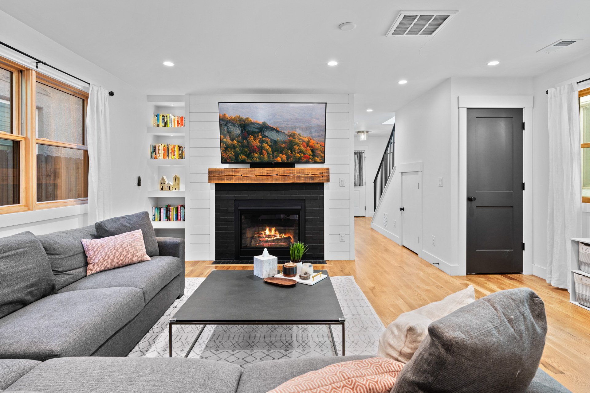 The main level of this completely unique residence features a bright office with glass French doors, a stylish powder room, an open-concept living and dining area with beautiful built-ins and a fabulous gas fireplace.