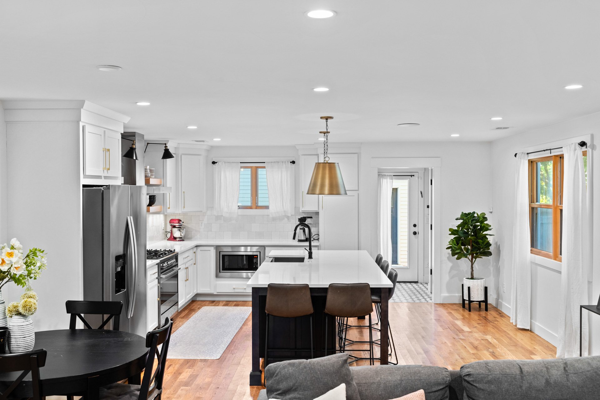 The gorgeous chef's kitchen offers quartz countertops, stainless steel appliances, a gas range, a built-in microwave, open shelving, ample counter seating, and easy access to the dining room, living room, and mudroom.