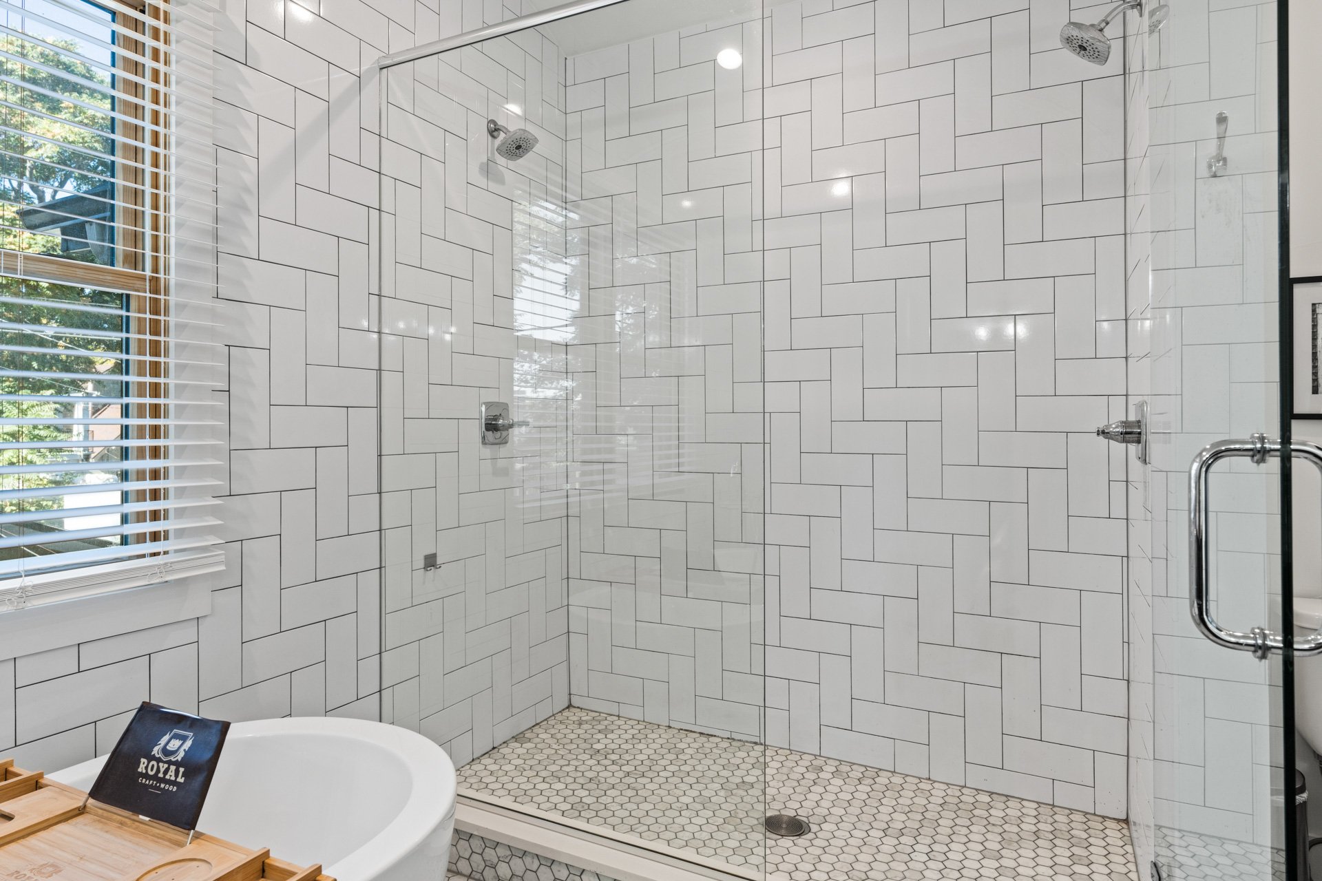On the second level, the show-stopping primary suite is filled with natural light with vaulted ceilings and features a spacious walk-in closet and a luxurious 5-piece en suite bathroom with a walk-in shower with dual shower heads, a standalone tub, and a contemporary double vanity.