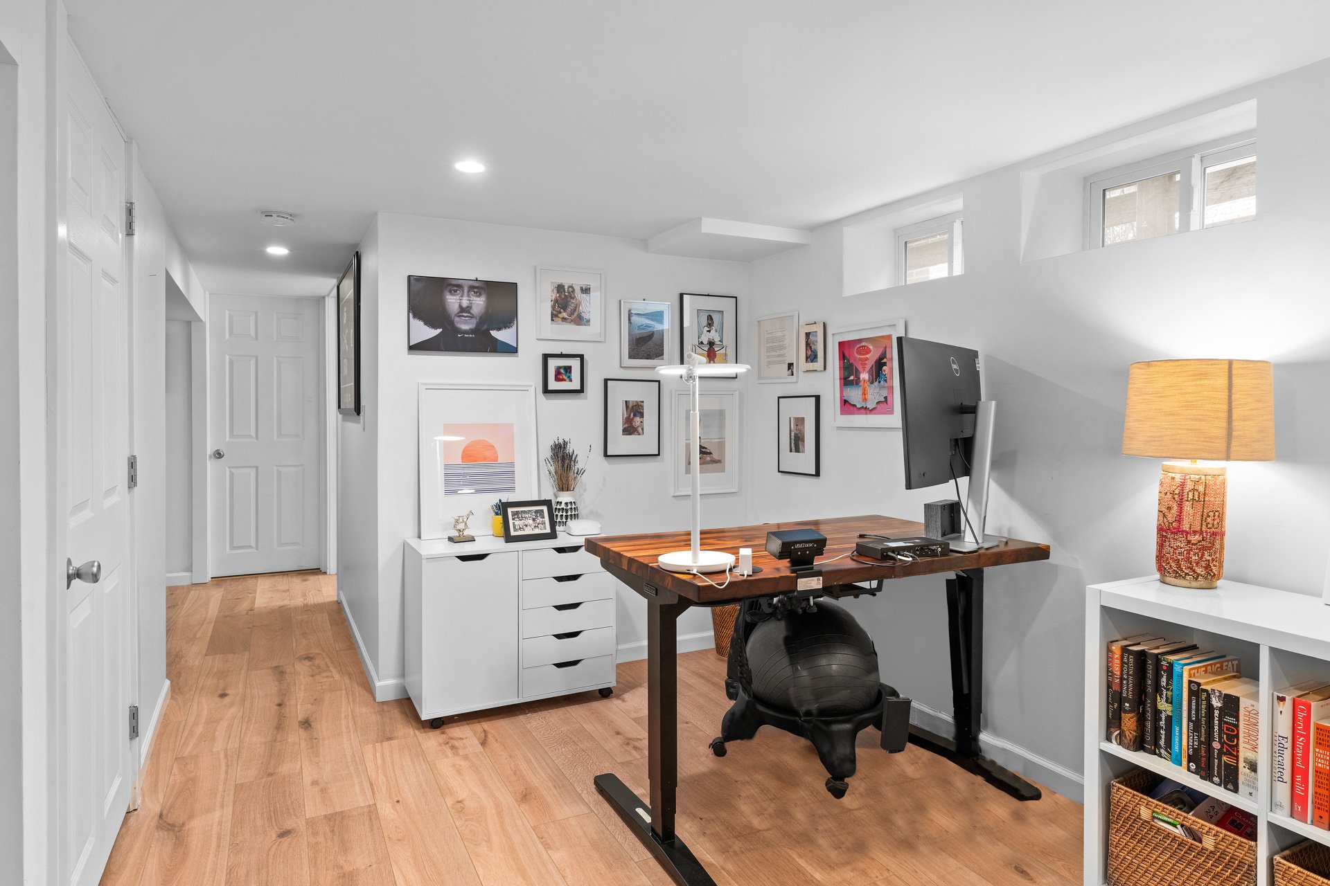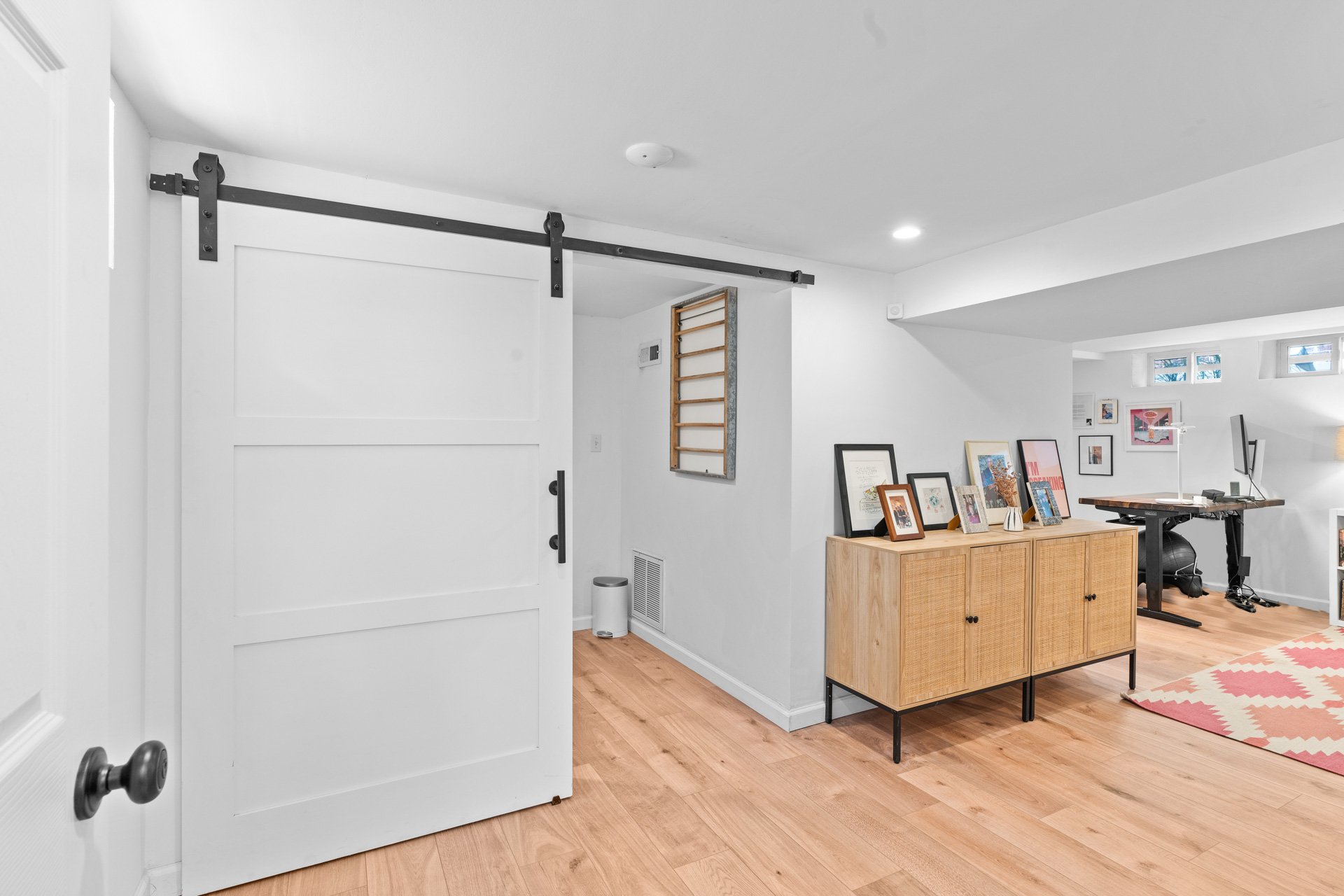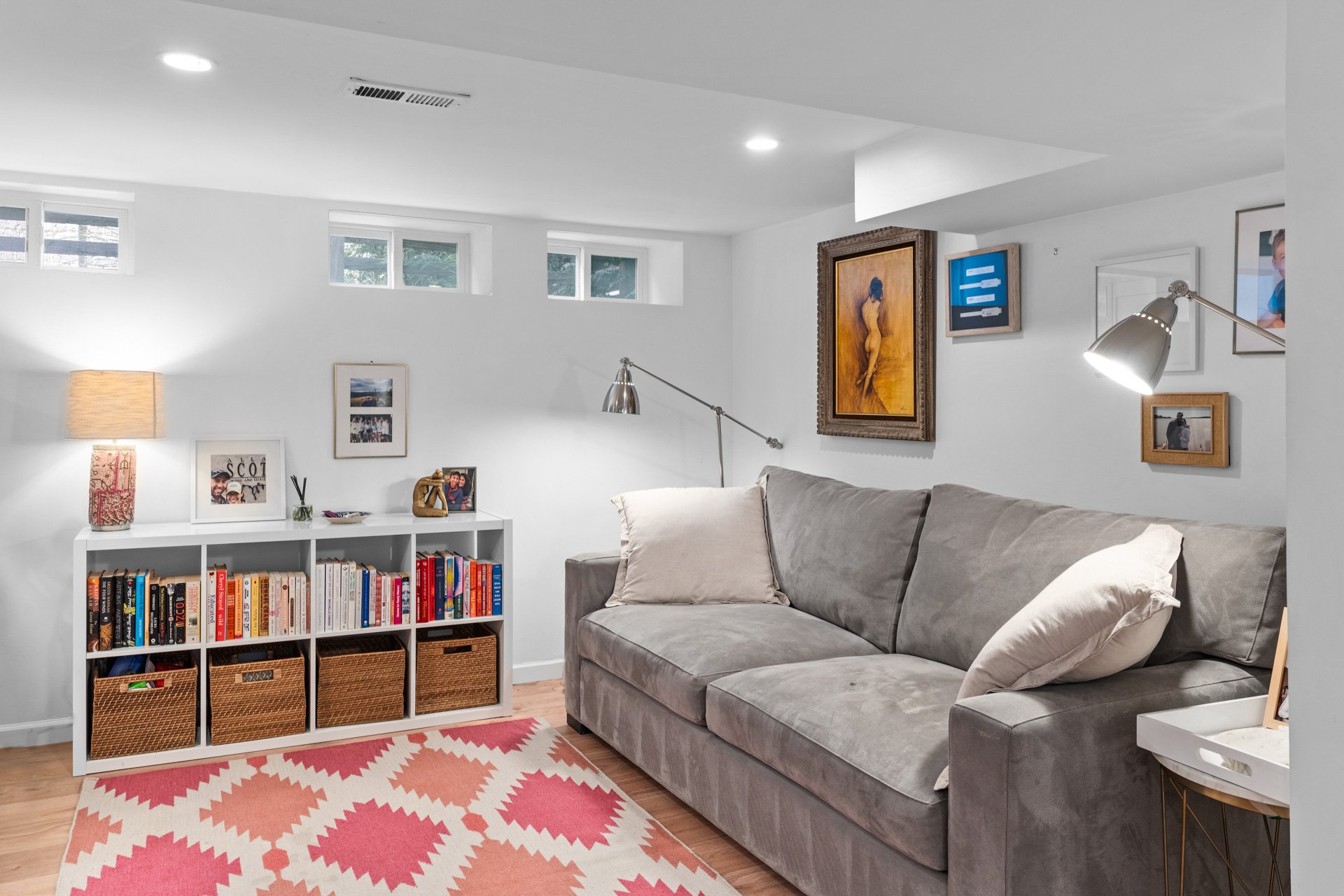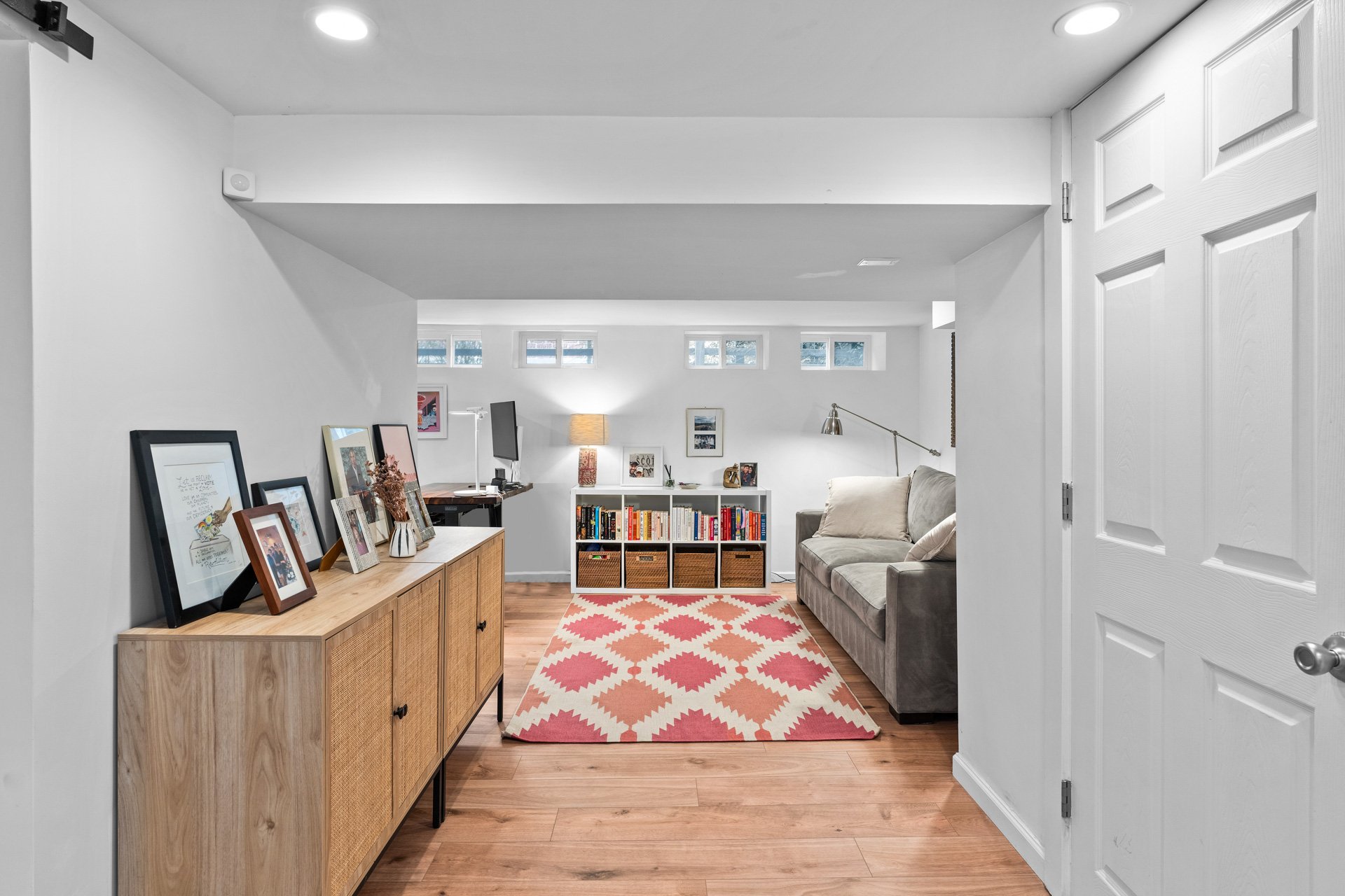 The basement offers additional finished living space (perfect for an additional living room or office space), a fourth conforming bedroom (comfortably fits a queen bed), a full bathroom, a large laundry room with a barn door (washer/dryer included), a storage room, and a mechanical room.