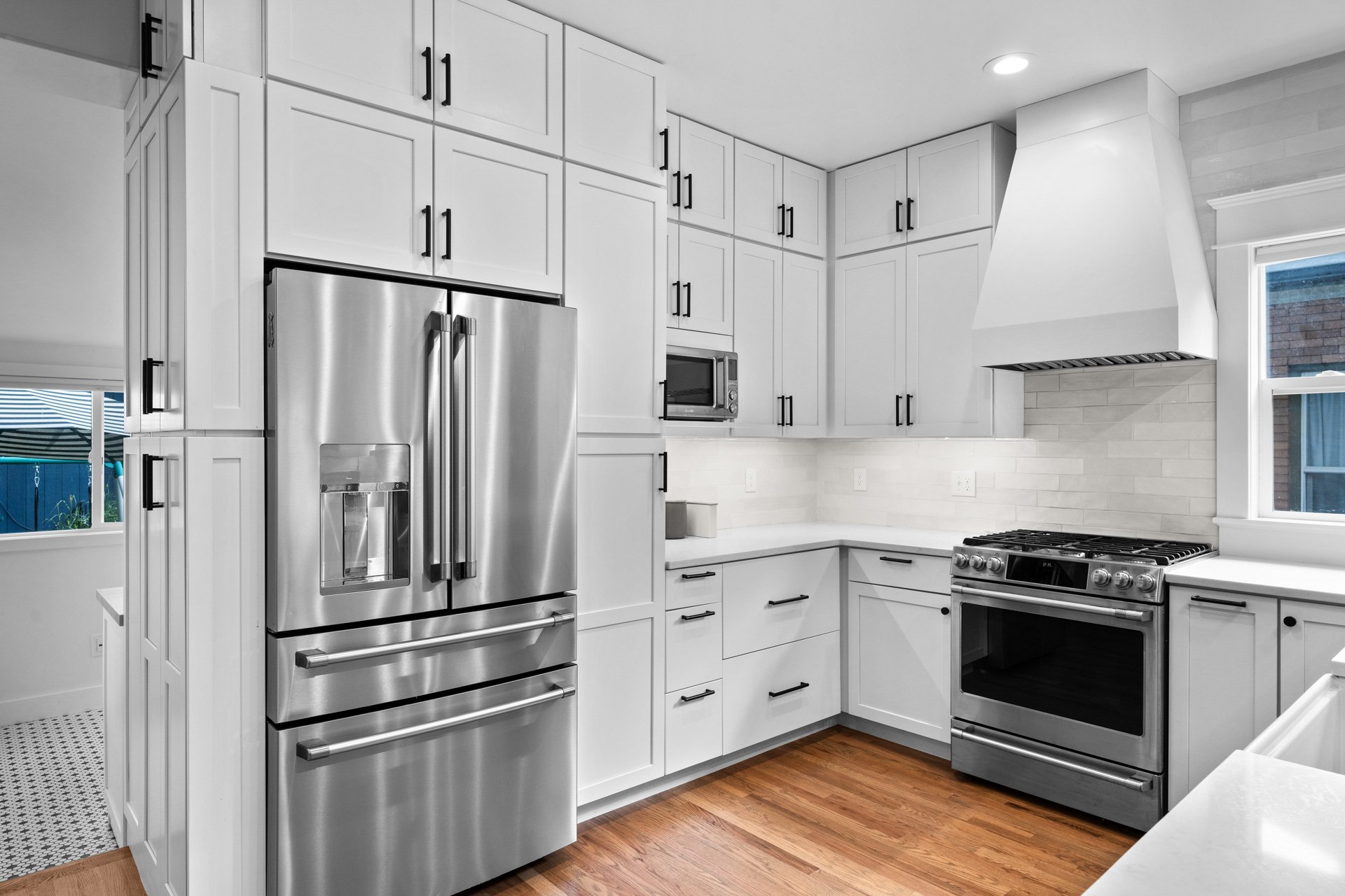 The amazing remodeled kitchen features quartz countertops, a farmhouse sink, stainless steel appliances, a gas range, and barstool seating.