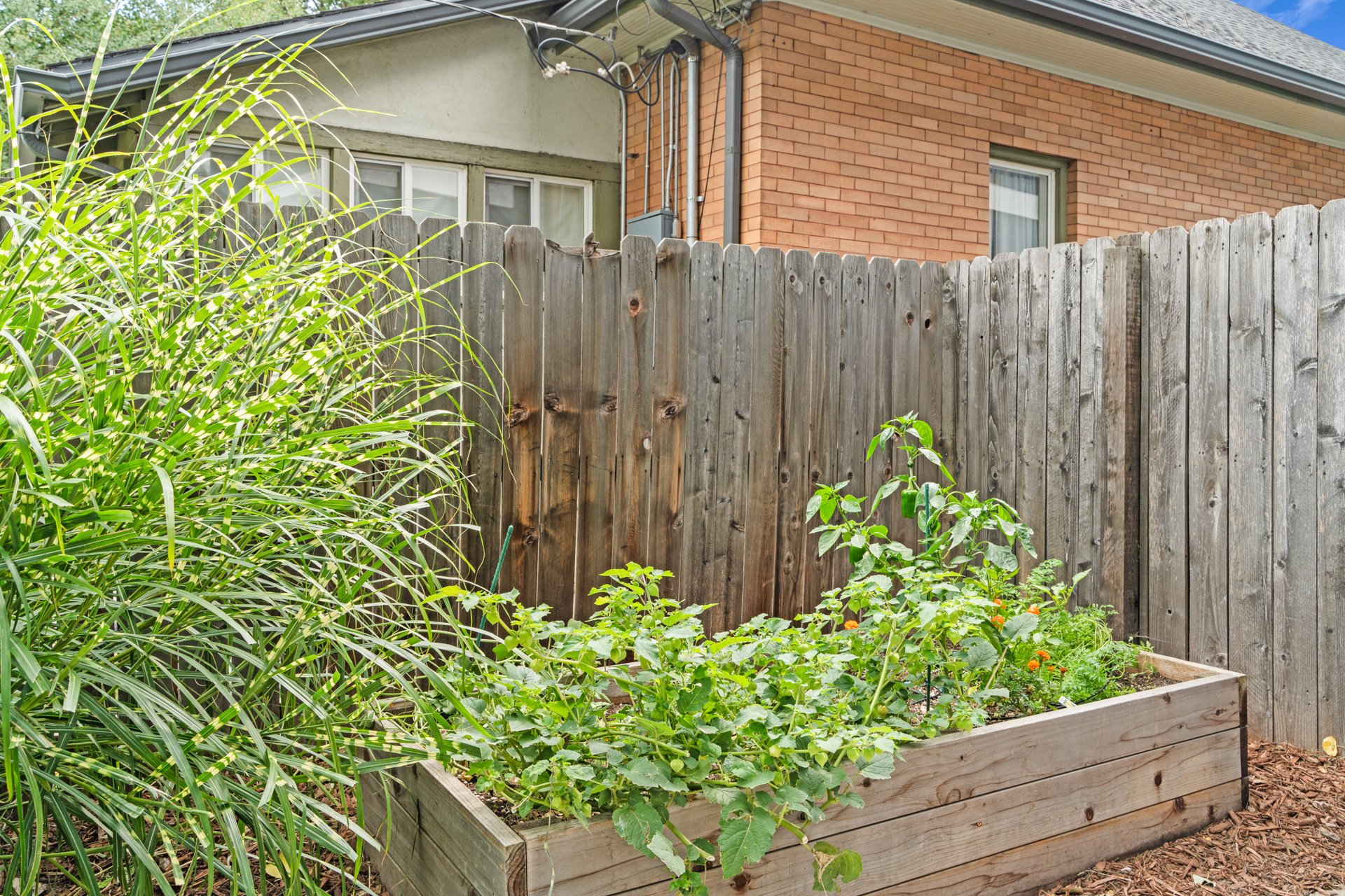 The fully fenced back and front yards feature a paver patio, raised garden bed, grass areas, and a covered porch, extending your functional living space outdoors.