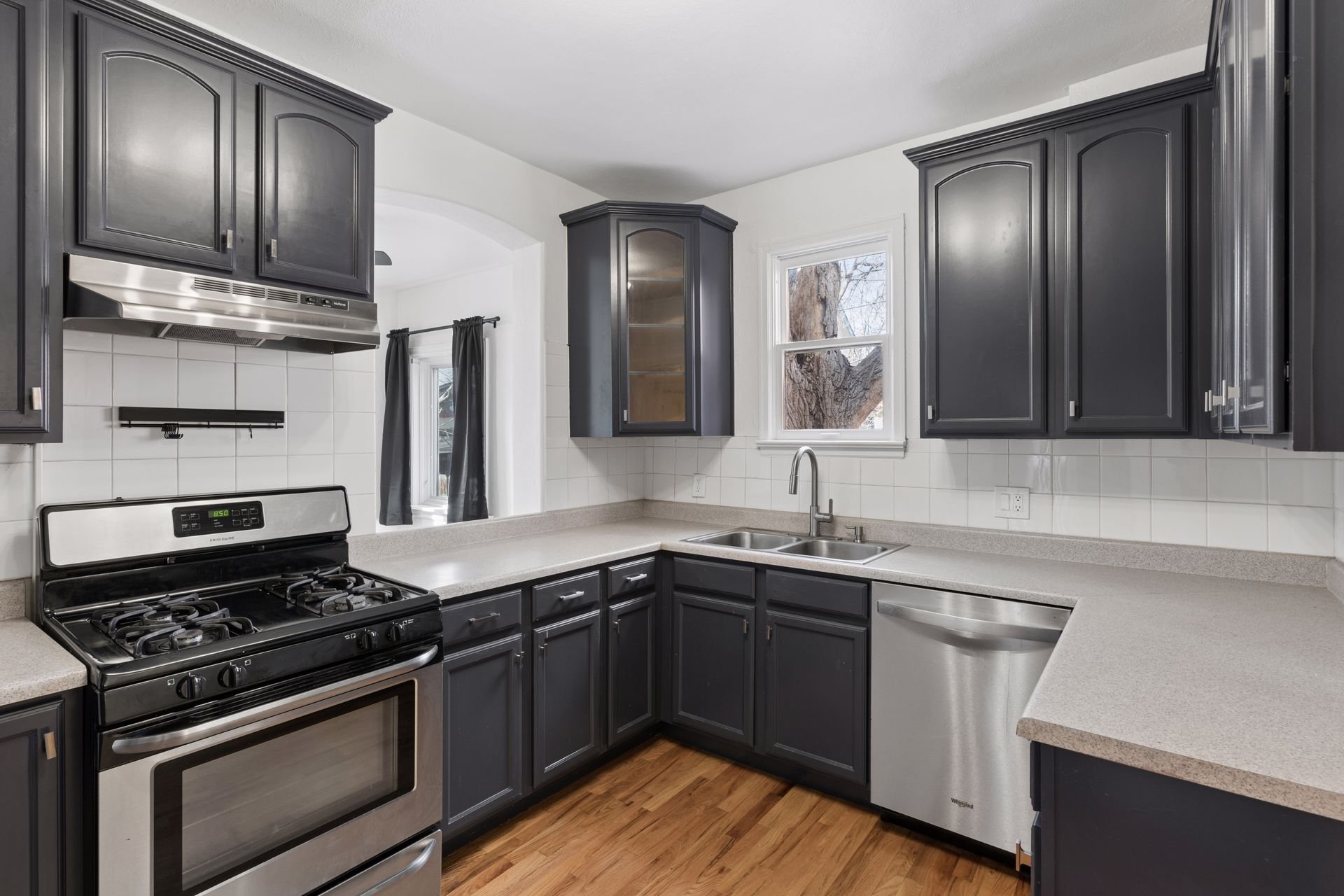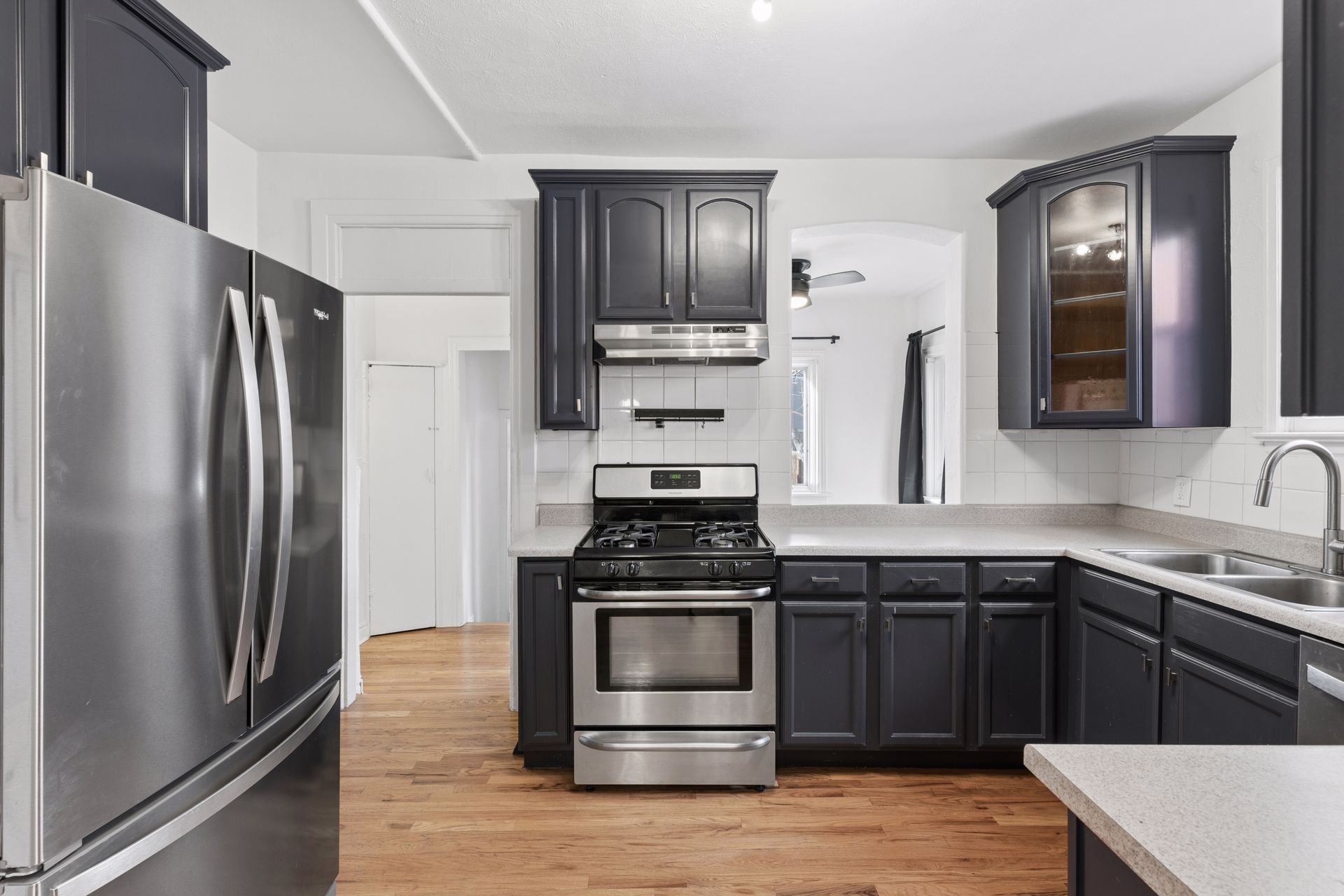 The recently refreshed kitchen features stainless steel appliances, ample prep space, contemporary hardware, and an abundance of natural light.