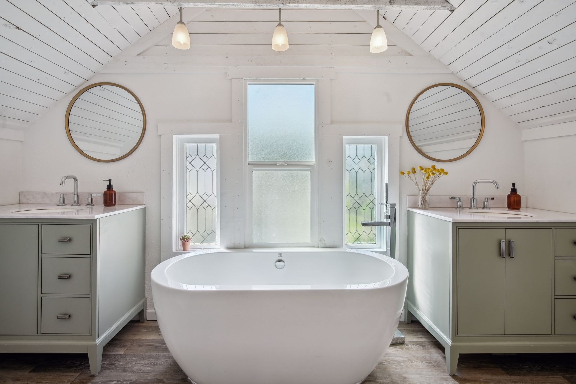 The second level of the home is a primary retreat with multiple closets, a luxurious primary bathroom with a standalone tub, shower, dual vanities, and beautiful fixtures.