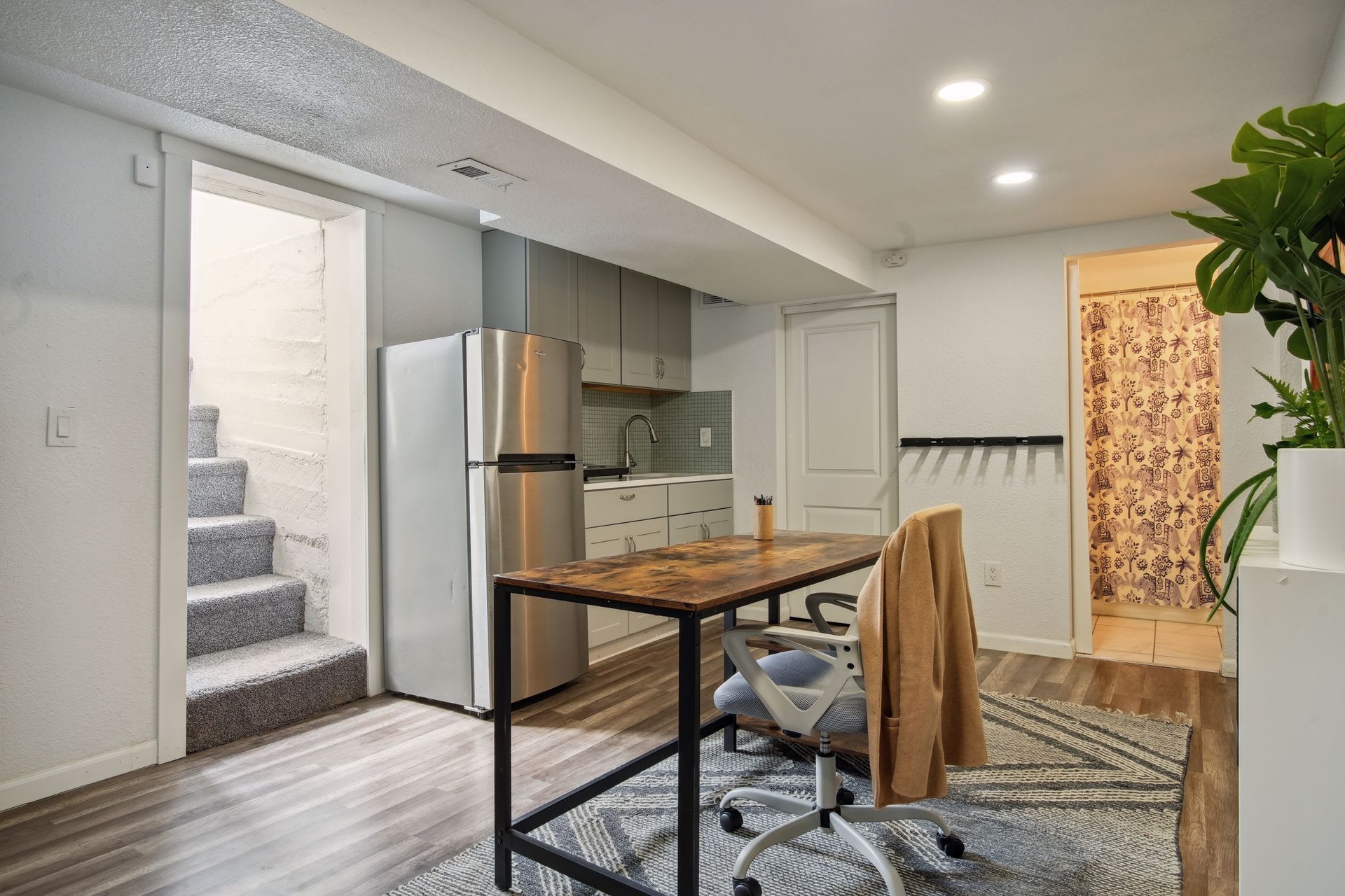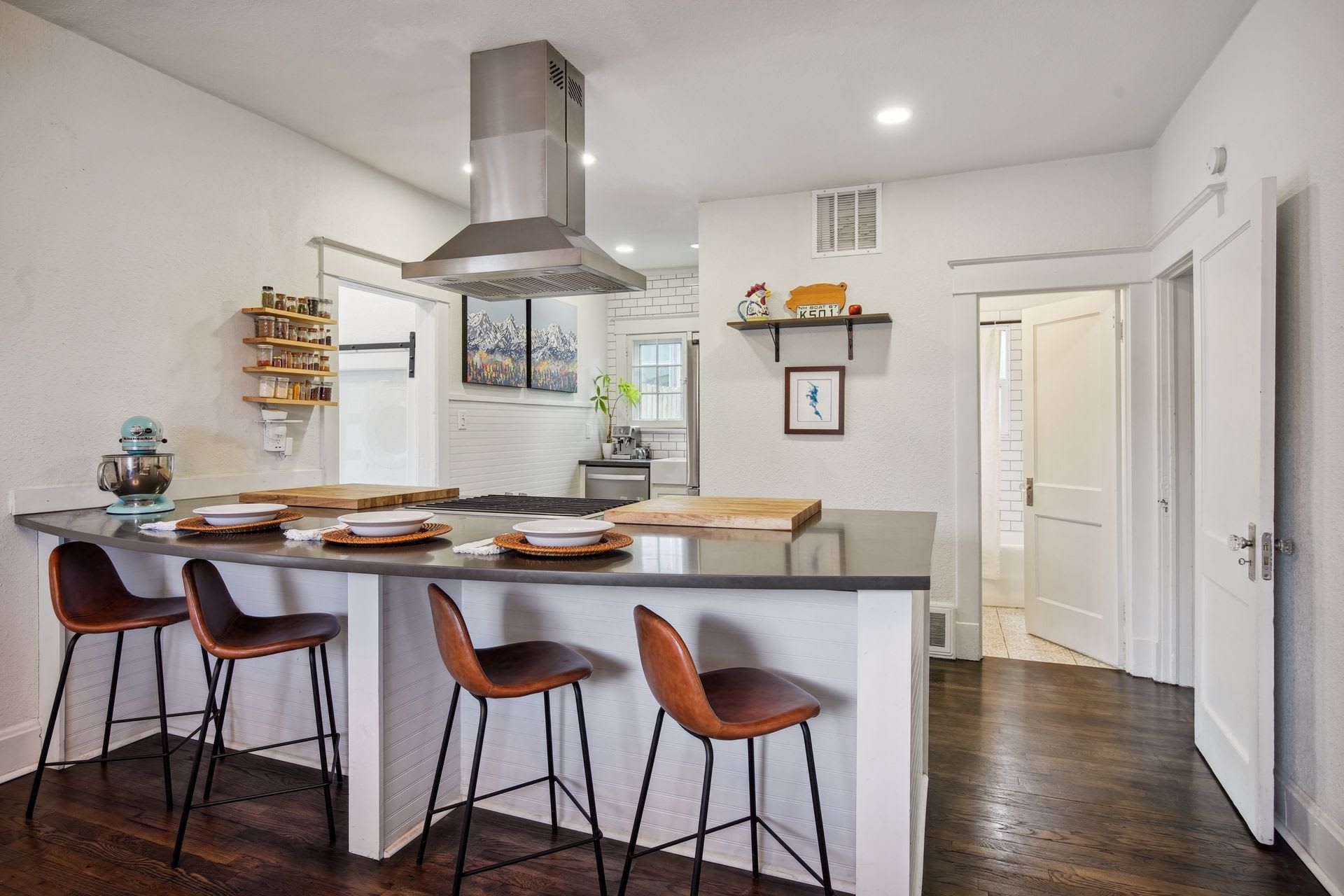 A large enclosed front patio welcomes you inside this completely one-of-a-kind home, where on the main level you'll also find a living room, dining room, updated open kitchen (featuring stainless steel appliances, a large island with bar stool seating, a bar fridge, subway tile, a farmhouse sink, and a walk-in pantry), a full bathroom, a bedroom (currently set up as an office), and laundry (one of two laundry locations in the home).