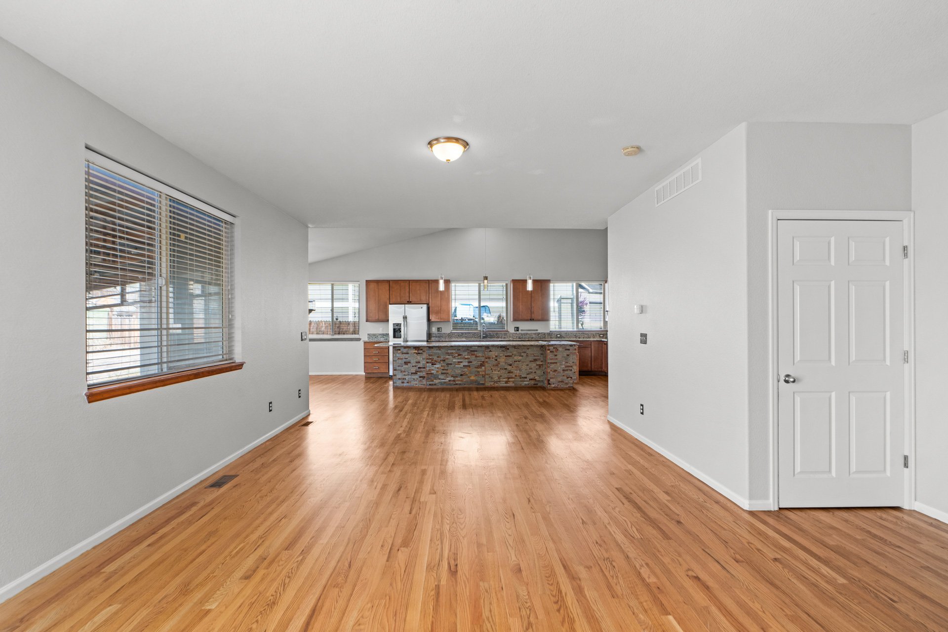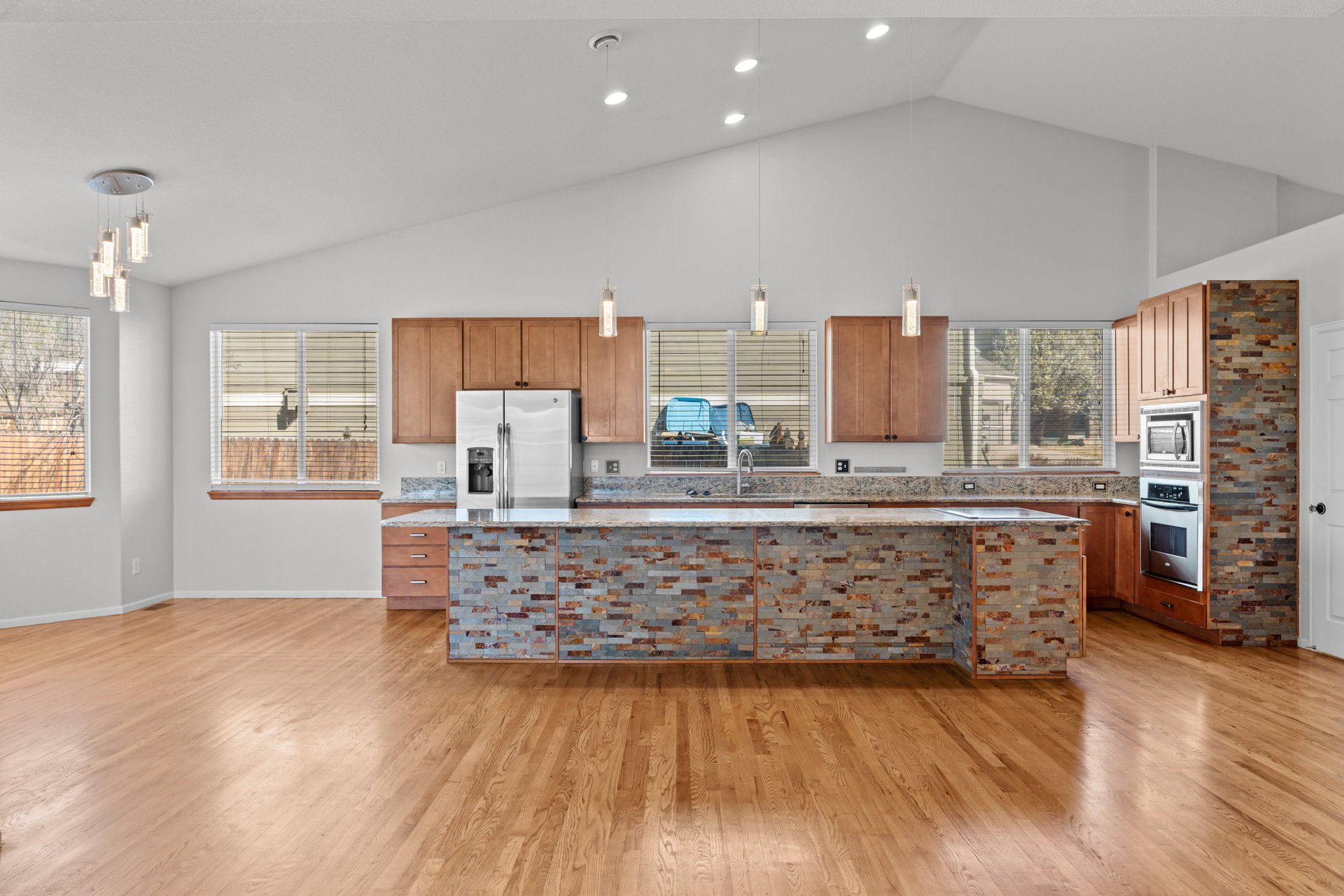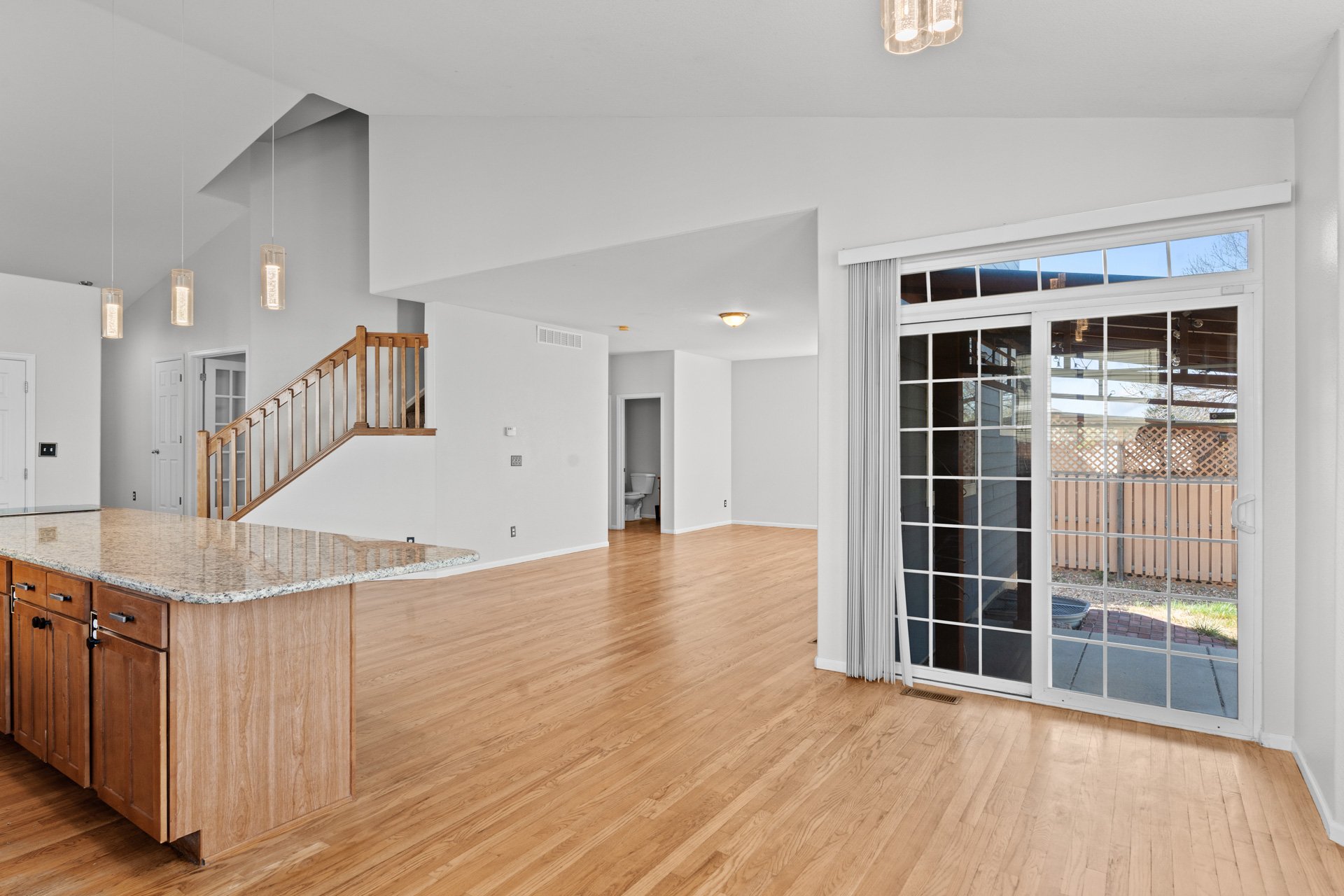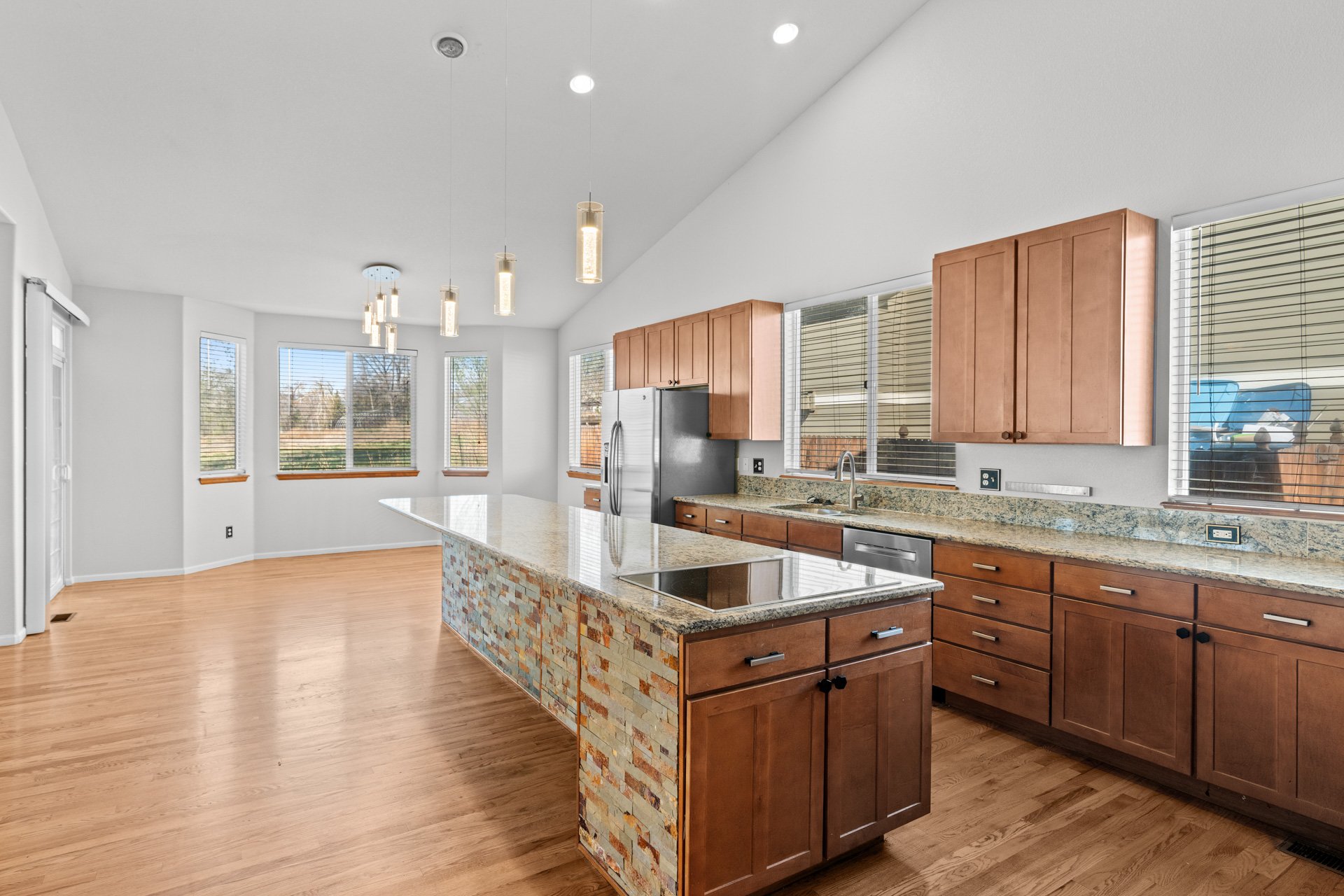 The expansive open-concept living area beckons you into the heart of the home and includes a large kitchen with an induction cooktop, stainless steel appliances, a walk-in pantry, and granite countertops, a dining area with hardwood floors, and a family room with ample space in which to relax.