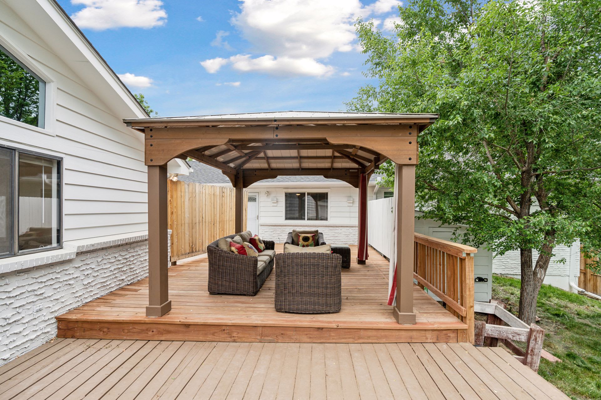 The back yard of the main residence features a lovely deck and pergola--great for entertaining while offering tons of privacy, and there is a separate private patio for the ADU!