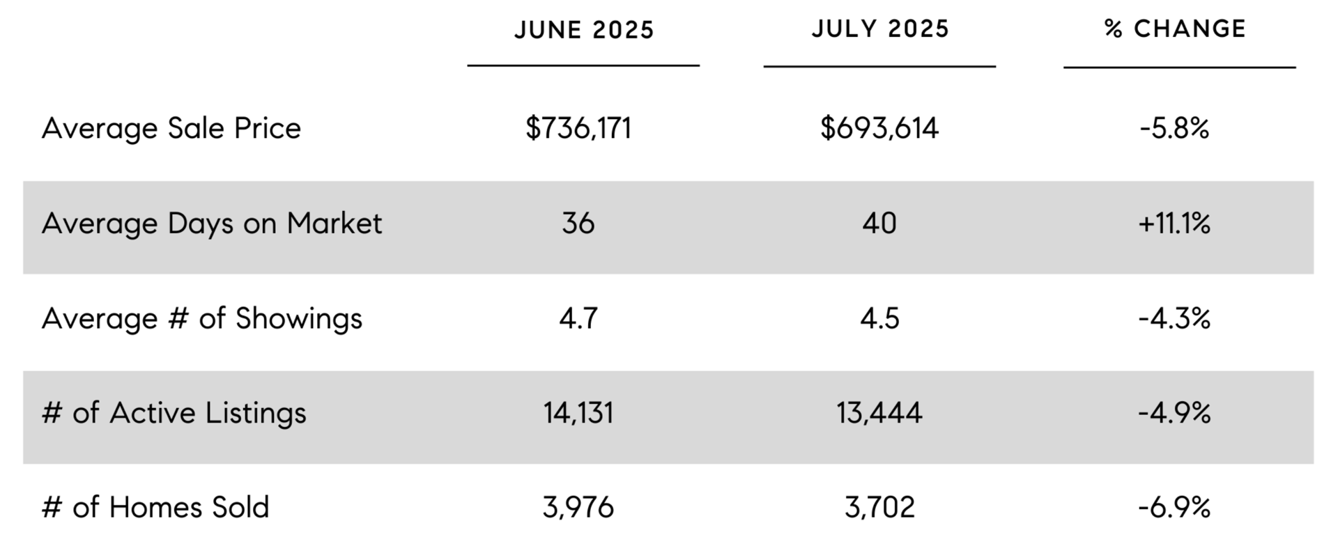 Source: REColorado and ShowingTime, residential, all property types, July 2024 vs. July 2025, June 2025 vs. July 2025 [accessed 08/06/2025].