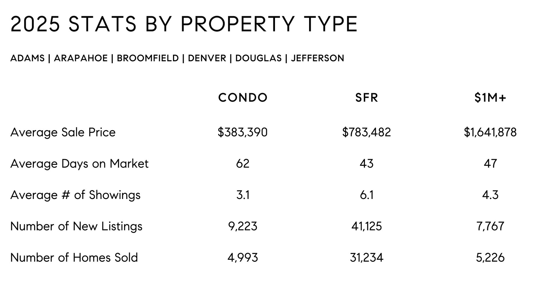 Source: REColorado and ShowingTime, residential - all property types, closed 01/01/2025-12/31/2025, counties: Adams, Arapahoe, Broomfield, Denver, Douglas, Jefferson (accessed 01/06/2026). Average agent data calculated using 30,328 REColorado members (information provided by REColorado on 07/02/2025).
