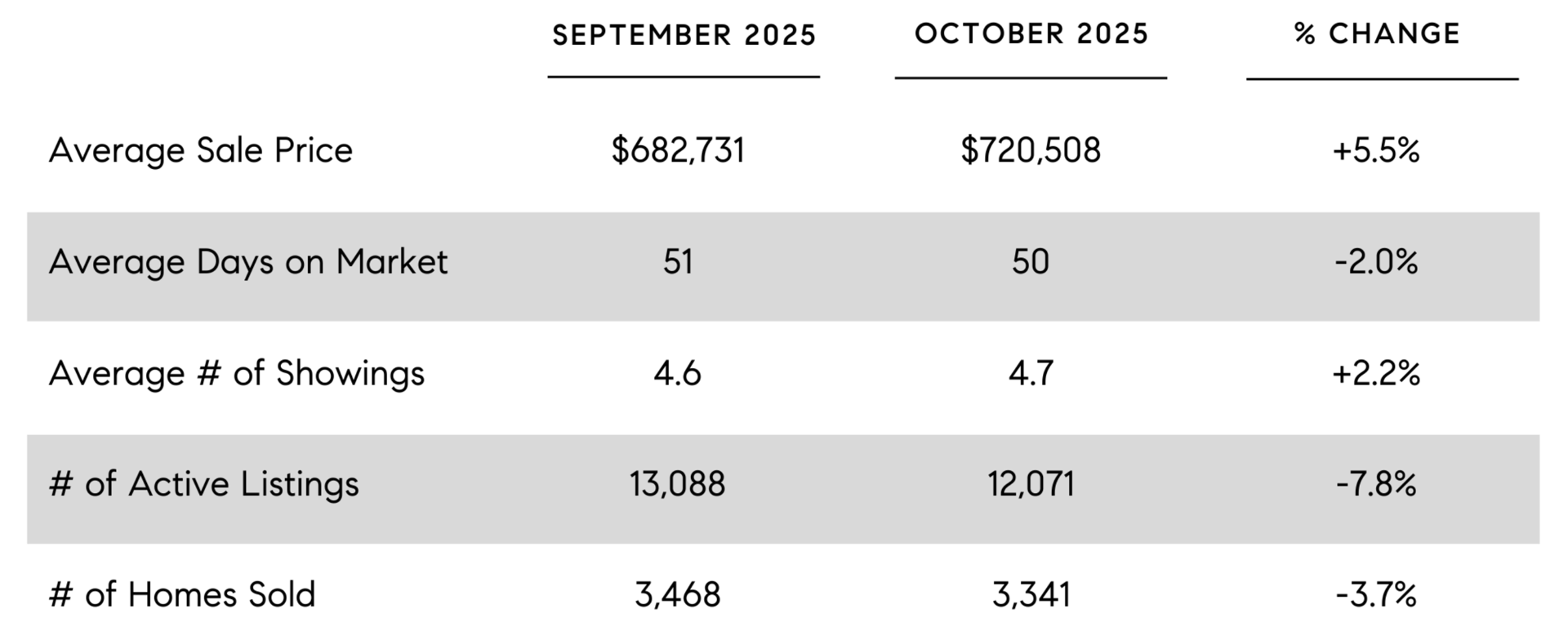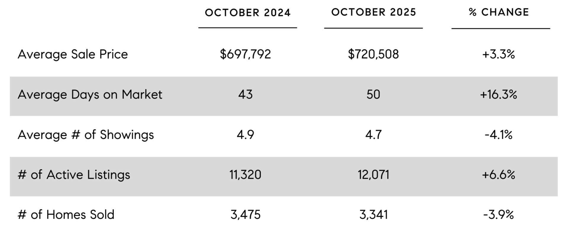 This is the time of year when the market tends to slow down and showings per listing, the total number of active listings, average sale prices, and the quantity of total sales all tend to decline between now and the new year. This is typically a great time to be a buyer, accordingly, as you usually have less competition and can often get a property for below the asking price with taken care of during the inspection negotiations than in the spring and summer months. Having said that, with interest rates dropping and the stock market at/near record highs, the housing market actually picked up a bit of steam in the last 30 days with month-over-month increases in average sale prices and showings per listing, and a slight decline in average days on market.