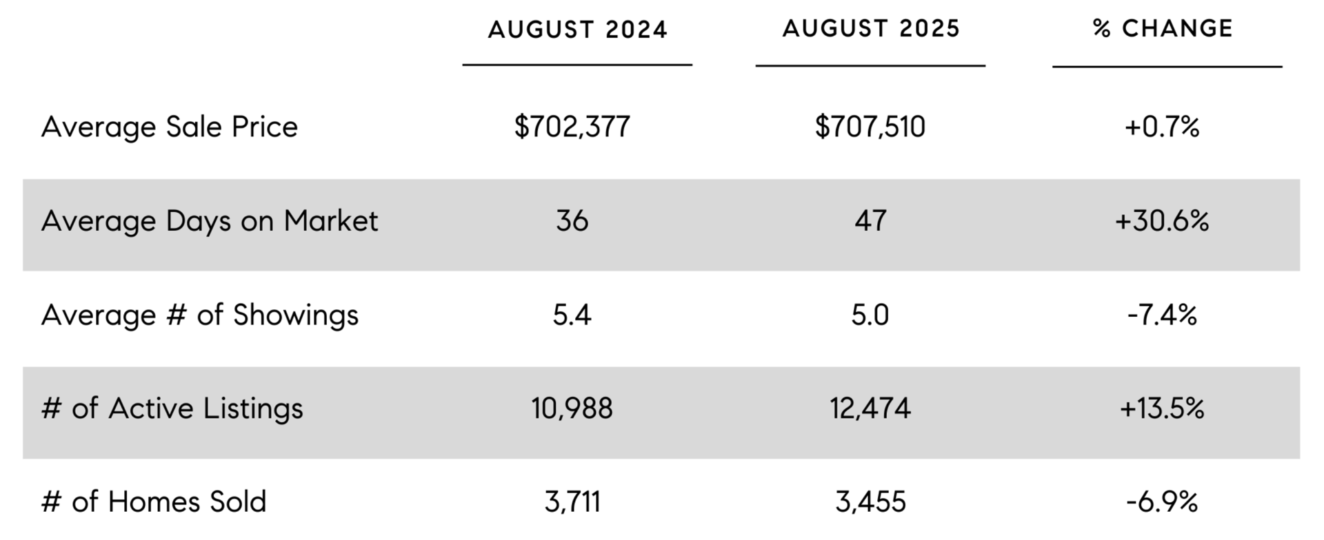 Source: REColorado and ShowingTime, residential, all property types, August 2024 vs. August 2025, July 2025 vs. August 2025 [accessed 09/02/2025].