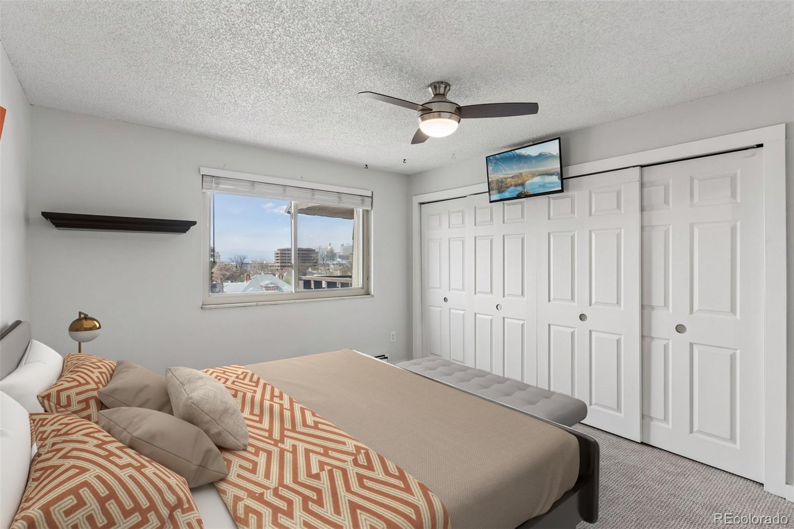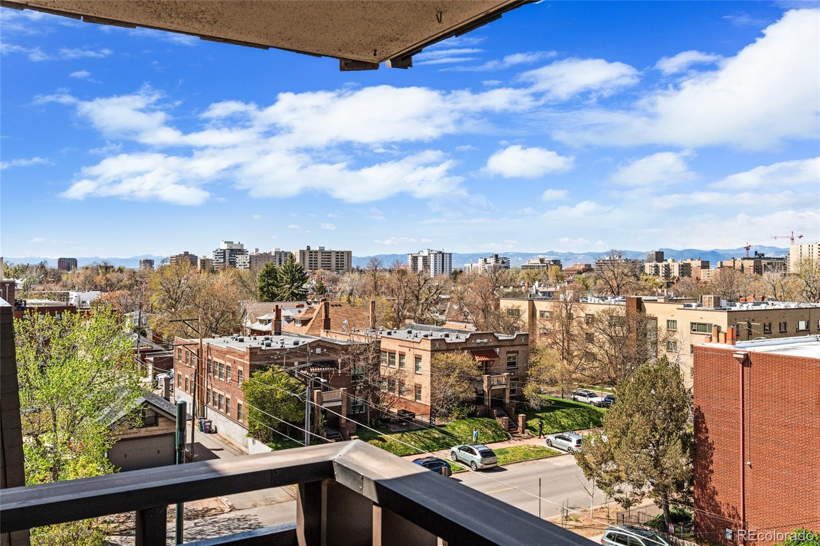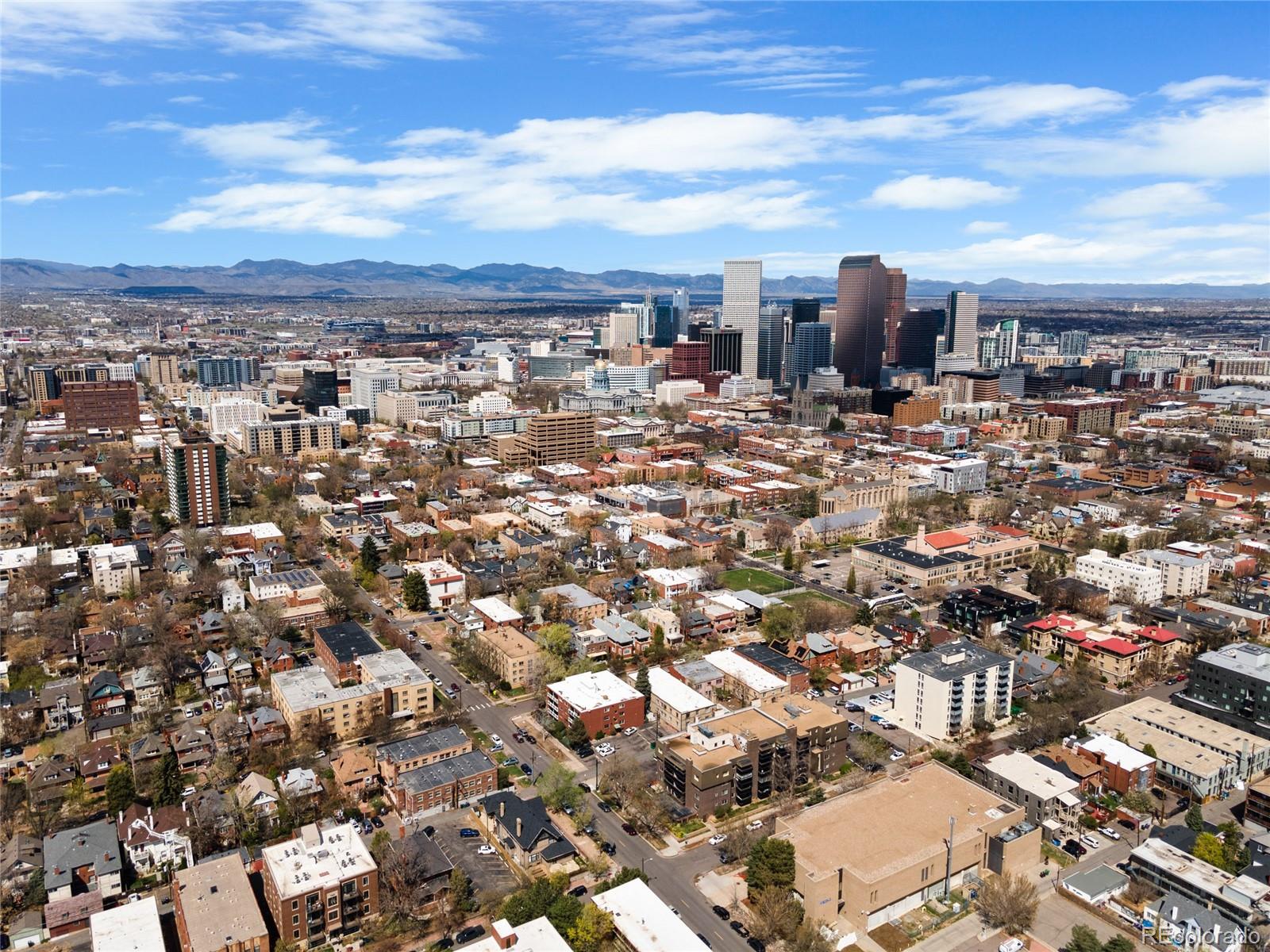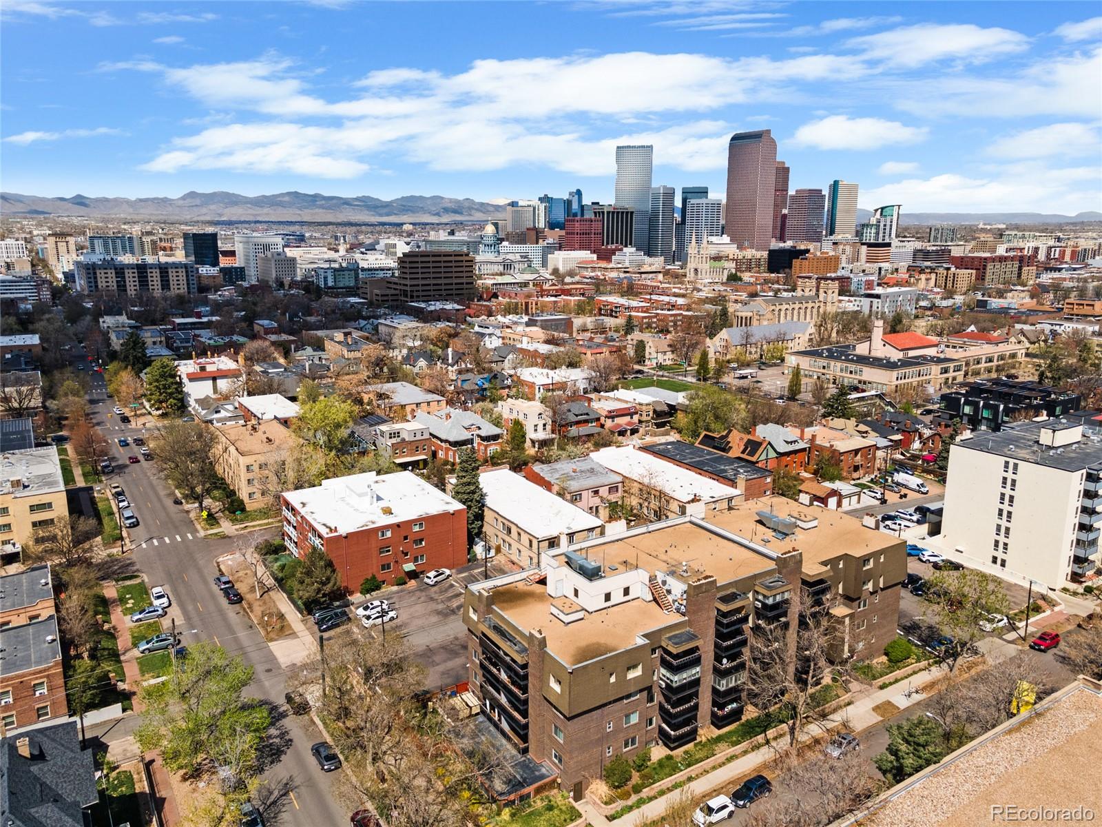 This rare top-floor corner condominium offers unobstructed views of the mountains, downtown Denver, and the Capitol dome, along with dedicated parking, a pool, and a fitness area, within a well-maintained building with low HOA dues, all in the heart of Capitol Hill. Located mere blocks to fantastic restaurants and coffee shops (Potager, Locales, Ritual Social House, Corner Beet, and Table 6 to name just a few), grocery stores (Whole Foods, King Soopers, Trader Joe's, and Safeway), Cheesman Park, Denver Botanic Gardens, the Cherry Creek Trail, and downtown Denver. Inside, the inviting open layout of the main living area is bright and functional, with a seamless flow between the kitchen, dining area, and living room. The updated kitchen features granite countertops, stainless steel appliances (all less than six years old), ample prep space, and opens directly to the dining area. Anchored by a wood-burning fireplace, the living room leads to a private balcony offering spectacular mountain and skyline views. The bedroom is generously sized with brand new carpet and oriented to take advantage of the same unobstructed quintessential Denver vistas, while the bathroom is well-designed with a luxurious walk-in shower and two standalone vanities. A built-in desk area provides a dedicated work-from-home space without sacrificing space. Each level of the building has its own laundry, and this unit comes with its own dedicated parking space--an extra valuable asset in Capitol Hill! Building amenities include an indoor pool, fitness area, club room (great for hosting events with its own updated kitchen), a shared outdoor area with a community grill and deck, and more. Best of all, the dues are incredibly low in this self-managed HOA! Quick possession available. Buyer to verify all information.
