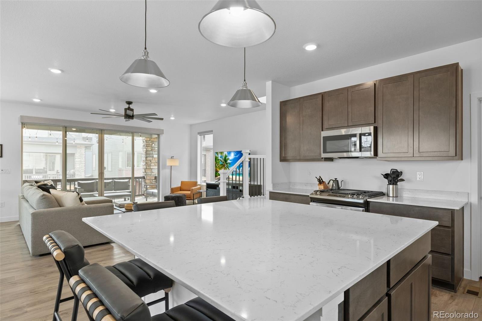 The home enjoys a very open layout perfect for entertaining. You will love cooking in the chef's kitchen featuring a huge island, quarts countertops and stainless steel appliances. The main living area connects seamlessly to the covered deck allowing indoor/outdoor living.