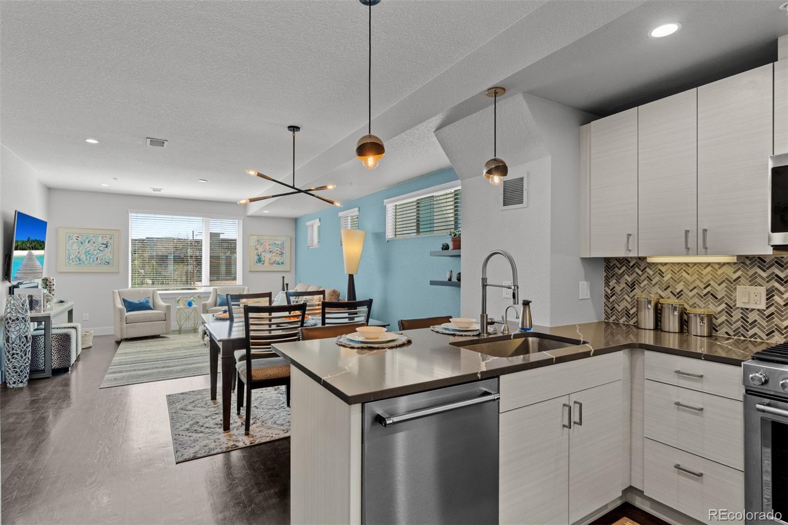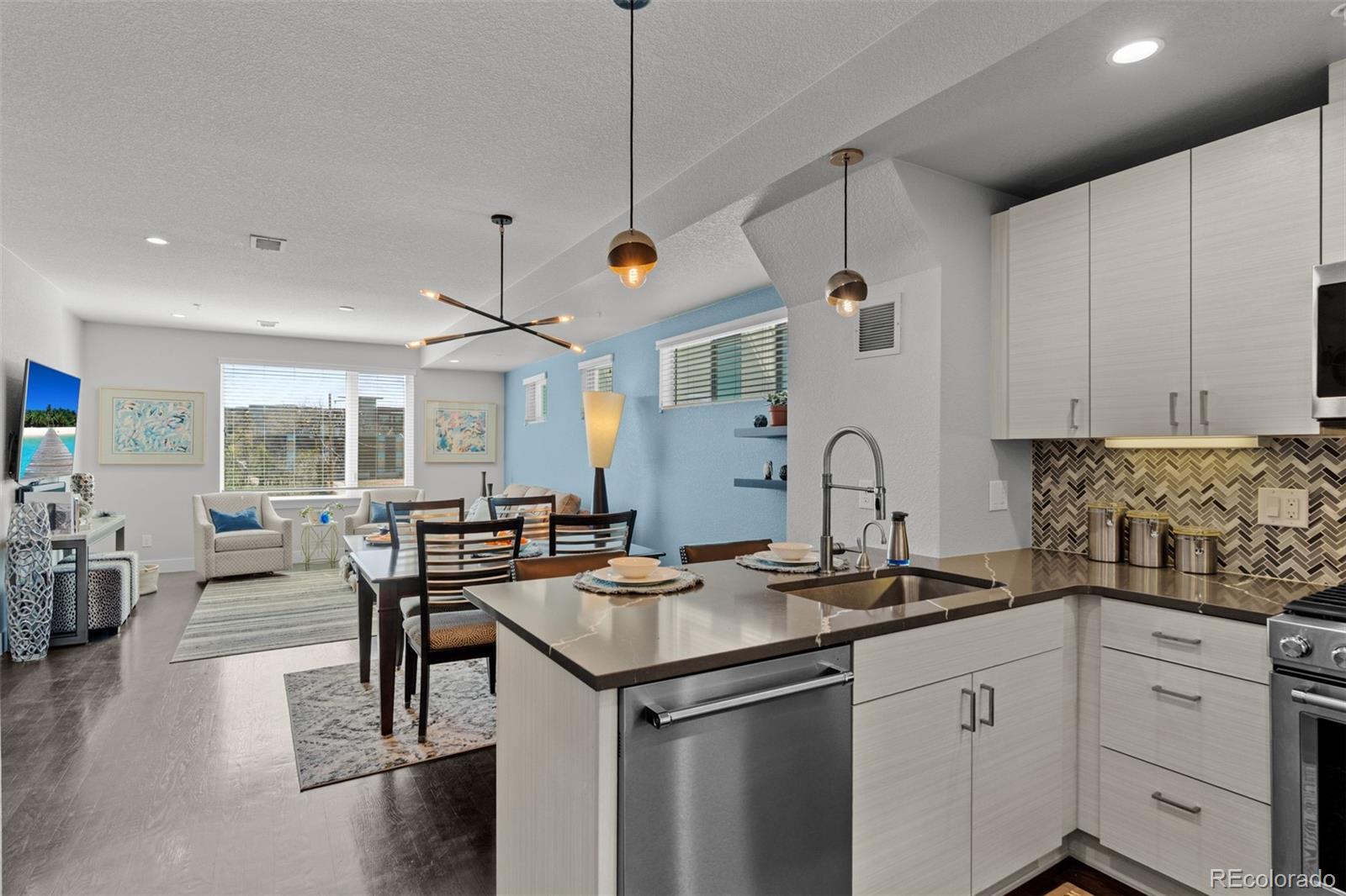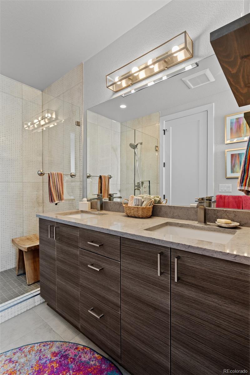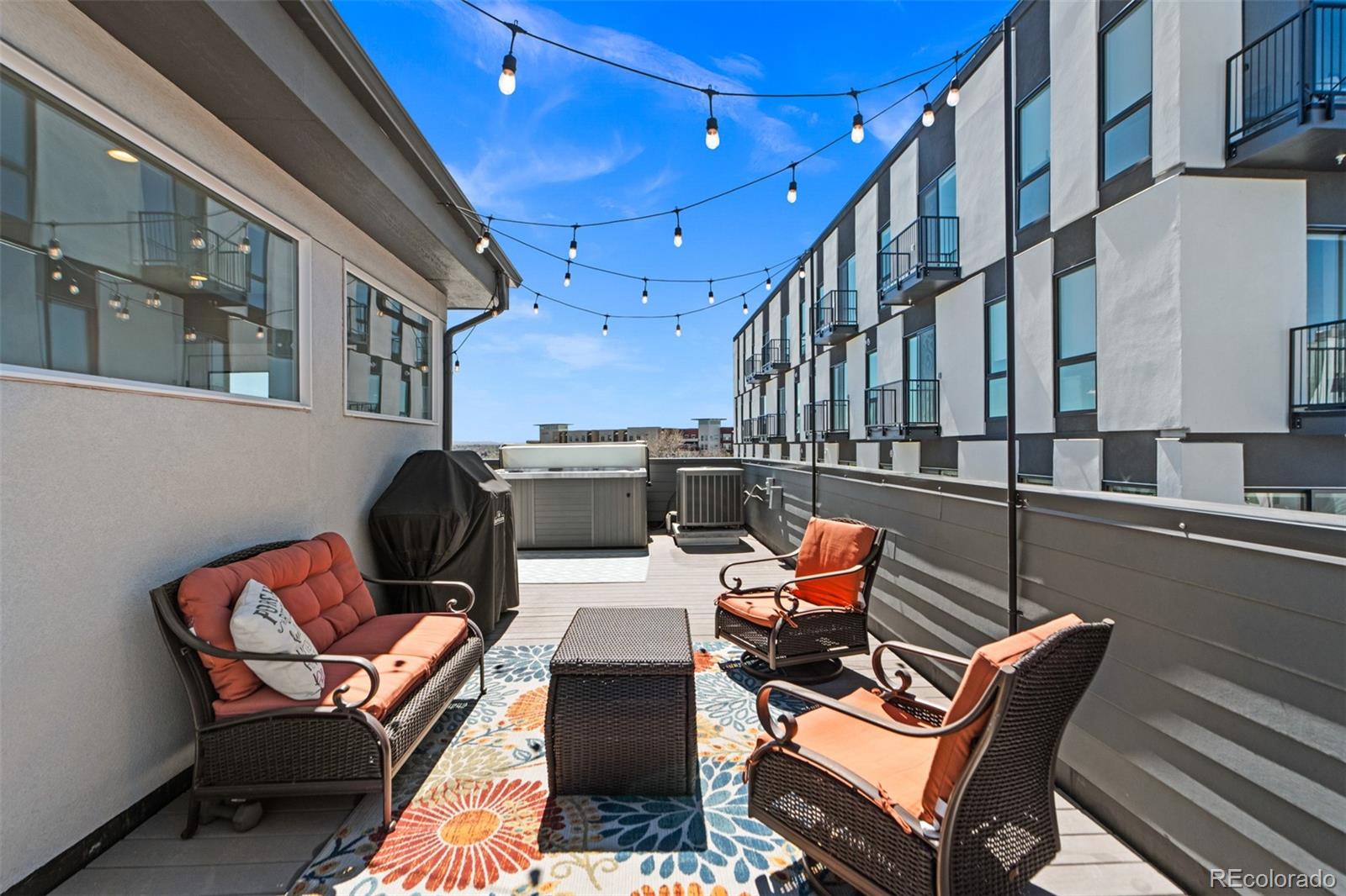 MUST SEE TO BELIEVE! From its rooftop deck with sweeping mountain and city views to its gorgeous interior, this Sloan's Lake townhome is absolutely exceptional and ready for its next owner! Step inside to a ground-level foyer with a powder room and direct access to the attached 2-car garage. Upstairs, the main living level is open and well-proportioned with high ceilings, hardwood floors, 8 ft. doors, and a large south-facing window that fills the space with natural light. The kitchen features quartz countertops, stainless steel appliances, soft-close drawers, and opens to the dining and living areas. A 2nd powder room is also located on this level. The upper level features 2 private bedroom suites: the primary bedroom includes a custom walk-in closet and en suite bathroom, and the 2nd bedroom also has its own full en suite bathroom. Laundry is conveniently located on the bedroom level (washer/dryer included). The rooftop deck is incredible--originally noted as having "the best views in the complex"--with mountain views to the west, uninterrupted views extending south across Denver, long sightlines, the ability to view sunrises and sunsets, and a sense of openness that is rare in this location. It features outdoor furniture (included), string lighting, a gas hookup for a grill, and is home to a high end custom Wind River hot tub (negotiable). Recent upgrades include a fully replaced central A/C system with a whole-house humidifier (2025), a smart thermostat, an Insinkerator instant hot faucet (2024), a MyQ garage door opener, Nest doorbell, WiFi extender, and a 240V dedicated circuit with 50A breaker for EV charging. Unlike most homes in the community, this unit also offers rare space for a 3rd guest vehicle to park in front of the garage. Excellent insulation and privacy from neighbors! Fantastic location between Sloan's Lake and Empower Field with easy access to downtown Denver, I-25, great restaurants/shops, and the light rail! Buyer to verify all information.