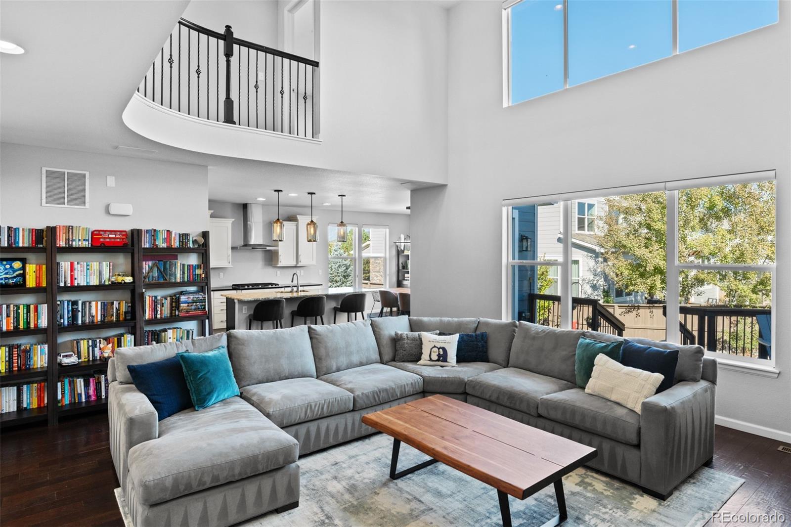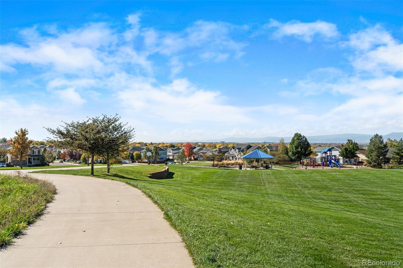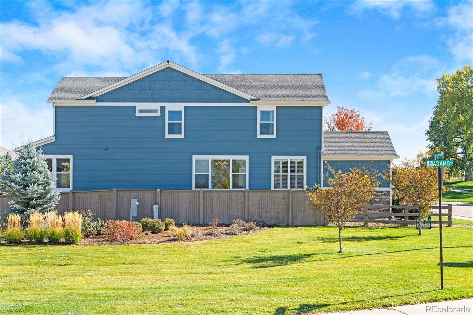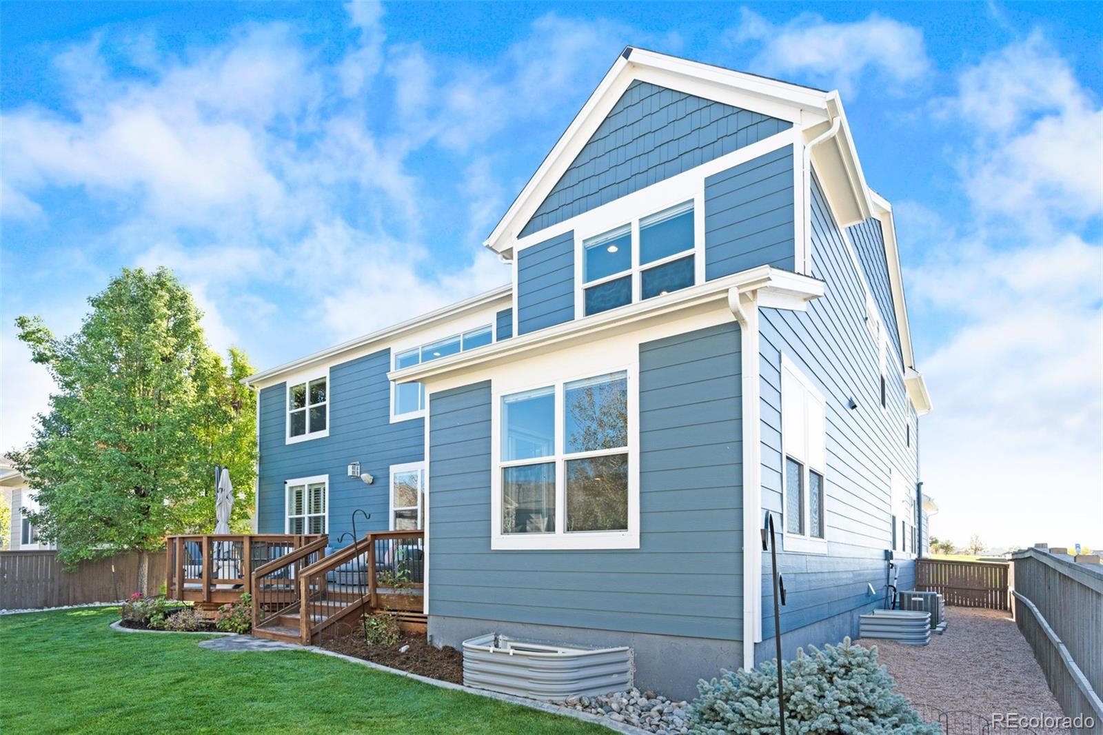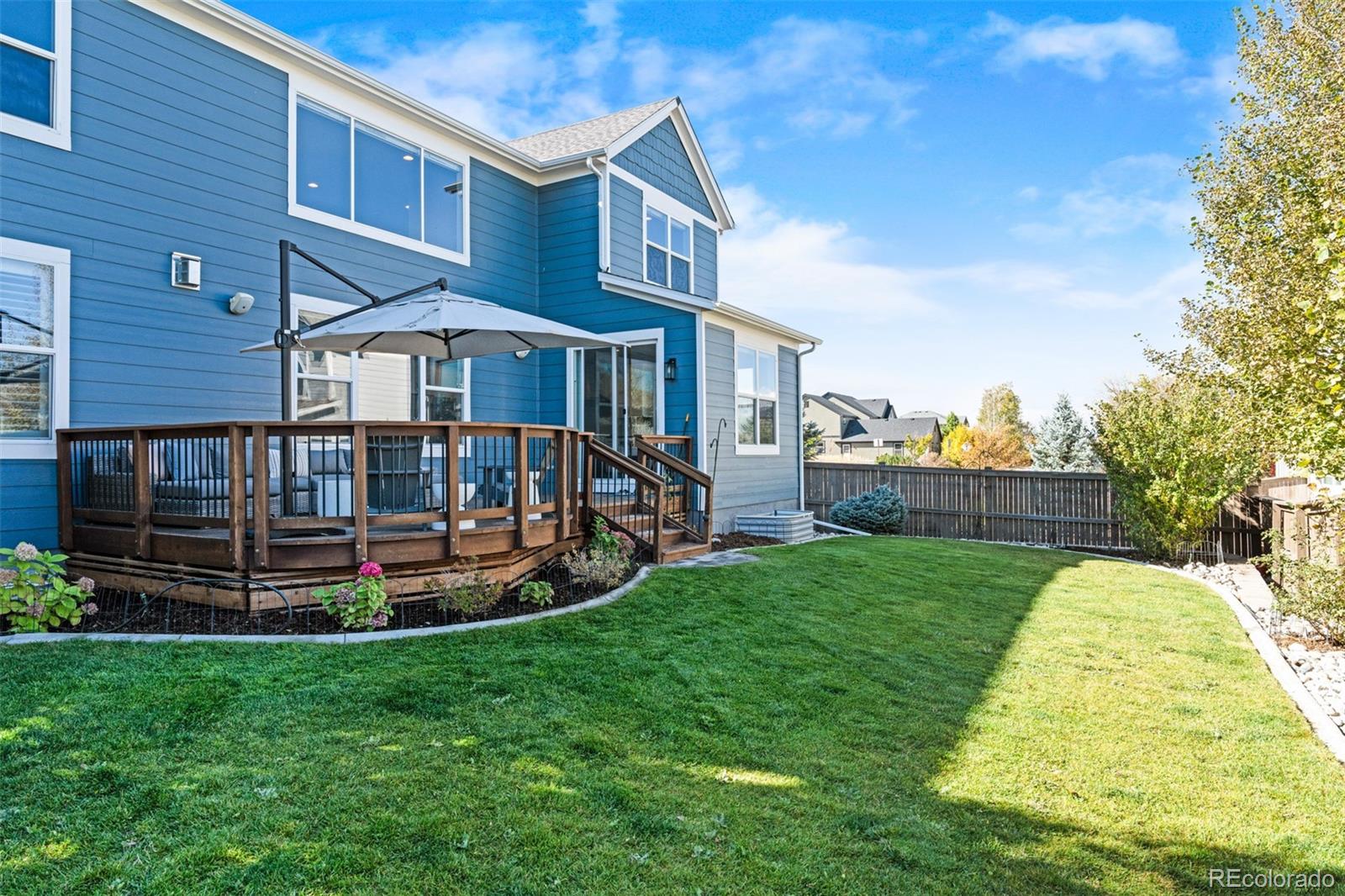This is your chance to own a stunning move-in-ready home with exceptional views directly across the street from a gorgeous park! The main level of this breathtaking residence is defined by its two-story ceilings, spectacular curved stairwell, ample natural light, mountain views, and fabulous chef's kitchen. The kitchen provides a double oven, quartz countertops, a touch screen smart refrigerator, a large granite island with counter seating, ample prep space, a built-in microwave, a butler's pantry, and a large walk-in pantry. The formal dining room offers easy access to the kitchen, and the casual dining space adjacent to the kitchen is bright and airy-overlooking the backyard and providing easy access to the deck and living room. The living room is light and bright with two stories of windows and a fireplace to keep you warm on cold winter days. A spacious guest bedroom with custom closets, a bathroom with a large walk-in shower, and a beautiful office are all also conveniently located on the main level. The second level is home to the primary suite with its huge custom walk-in closet and 5-piece en suite bathroom. Two additional bedrooms, a shared full bathroom, a laundry room (washer/dryer included), and a bonus loft room (perfect as another living room or a flex space) complete the second level. A large unfinished basement offers endless potential for additional functional living space and/or storage. Two attached garages with a total of three garage bays ensure that all of your vehicles and equipment stay dry on wet days! Outside, the rear deck is the perfect place for meals and entertaining, and the corner lot is exceptional with a bonus grass space to the west and a beautiful park across the street to the south with its trails, playground, and more! This amazing home offers easy access to Denver International Airport, downtown Denver, Boulder, and so much more. Don't miss the opportunity to make this incredible home your own! Buyer to verify all information.