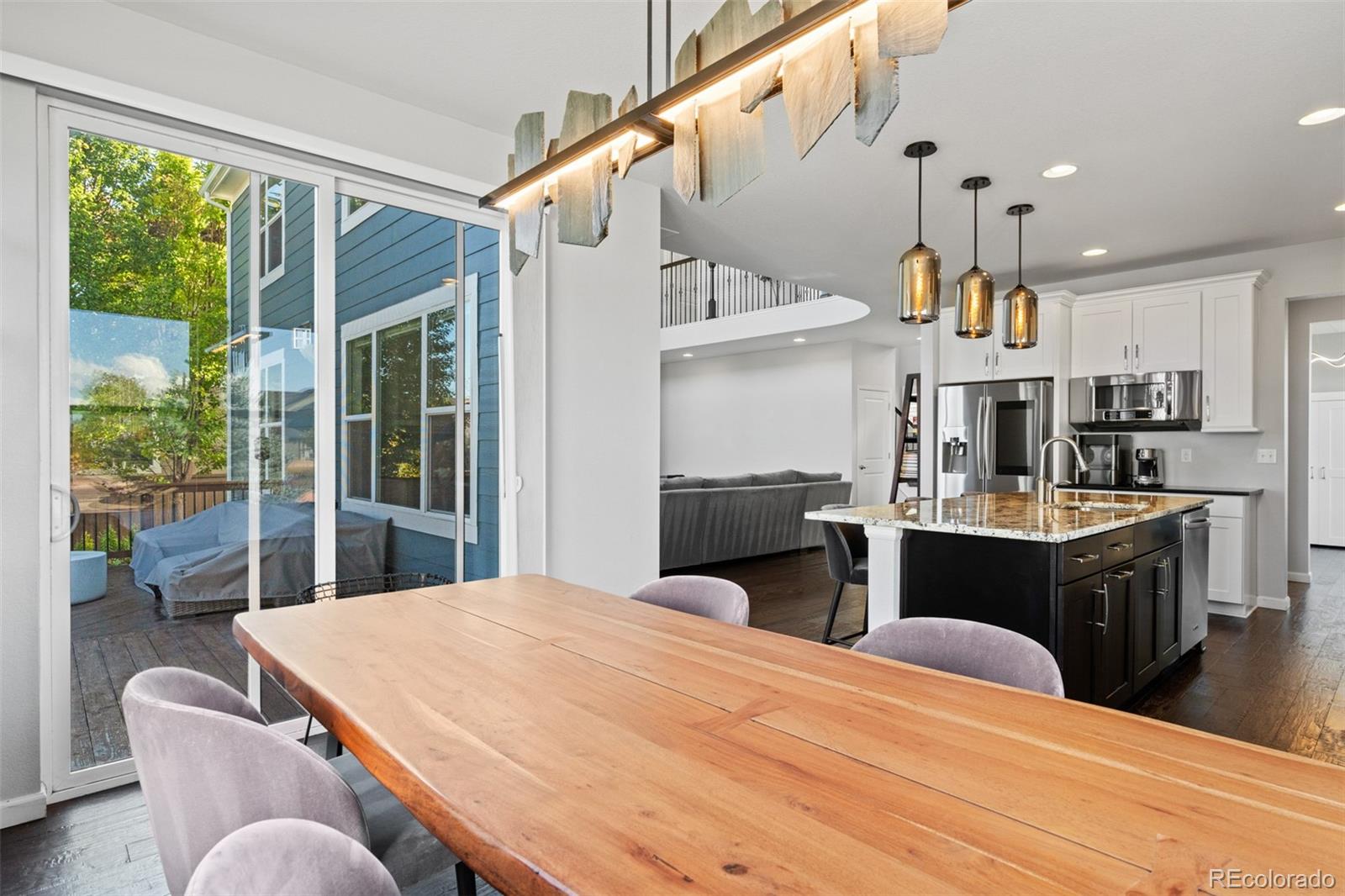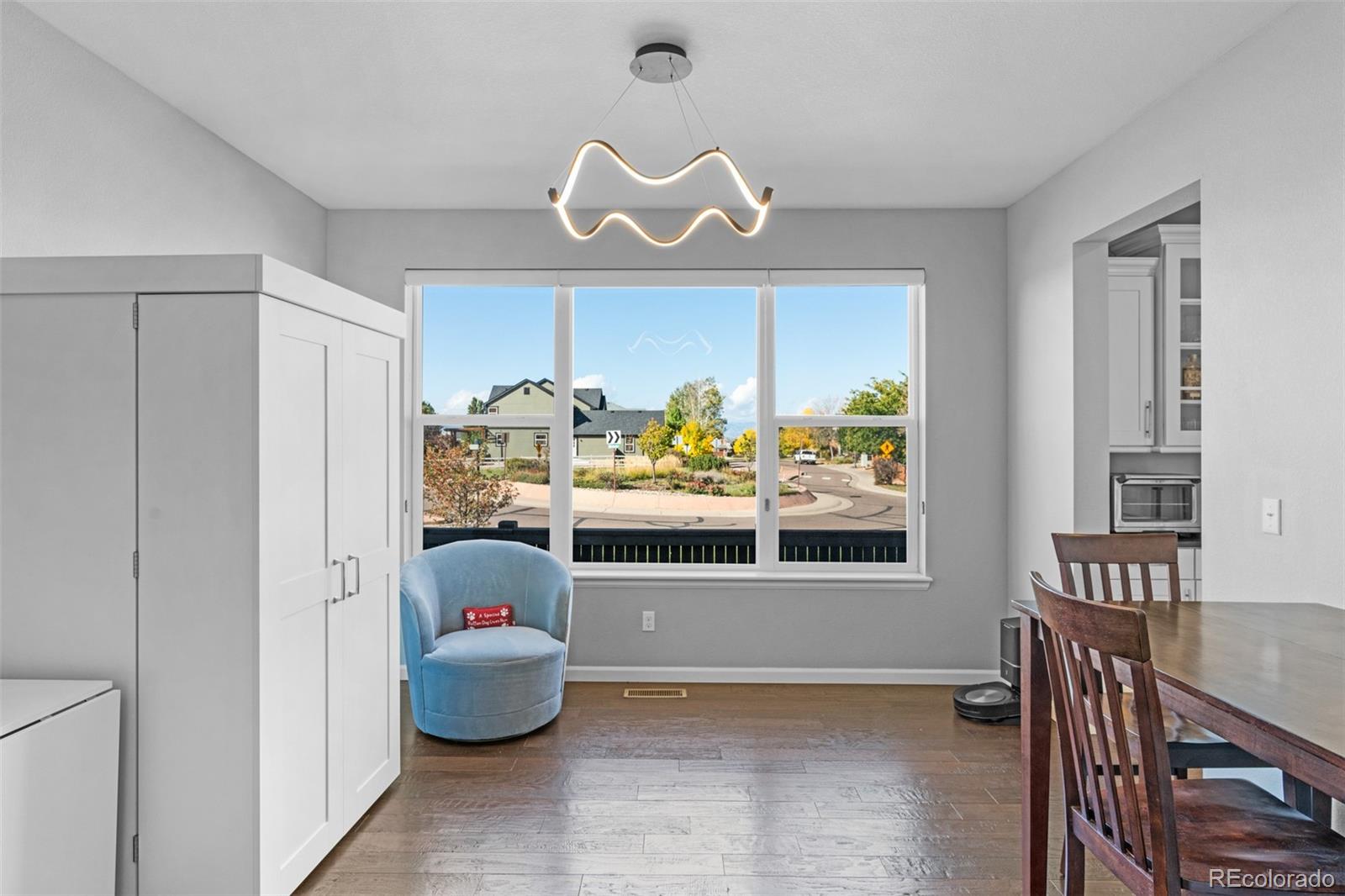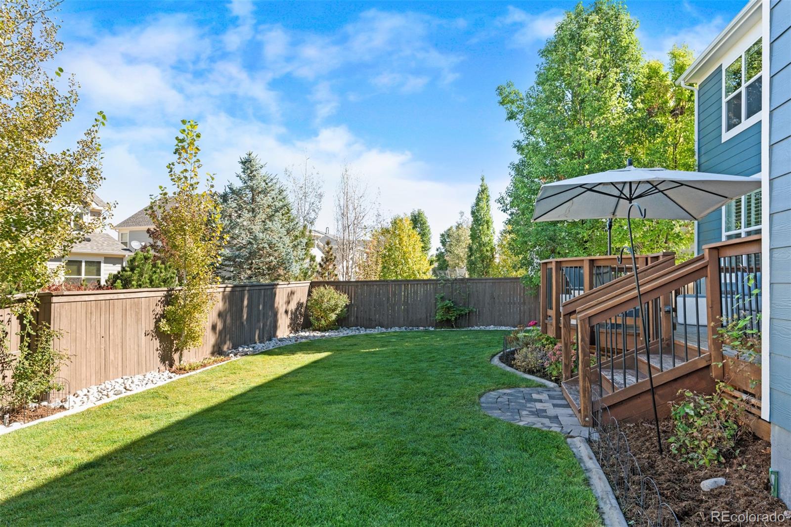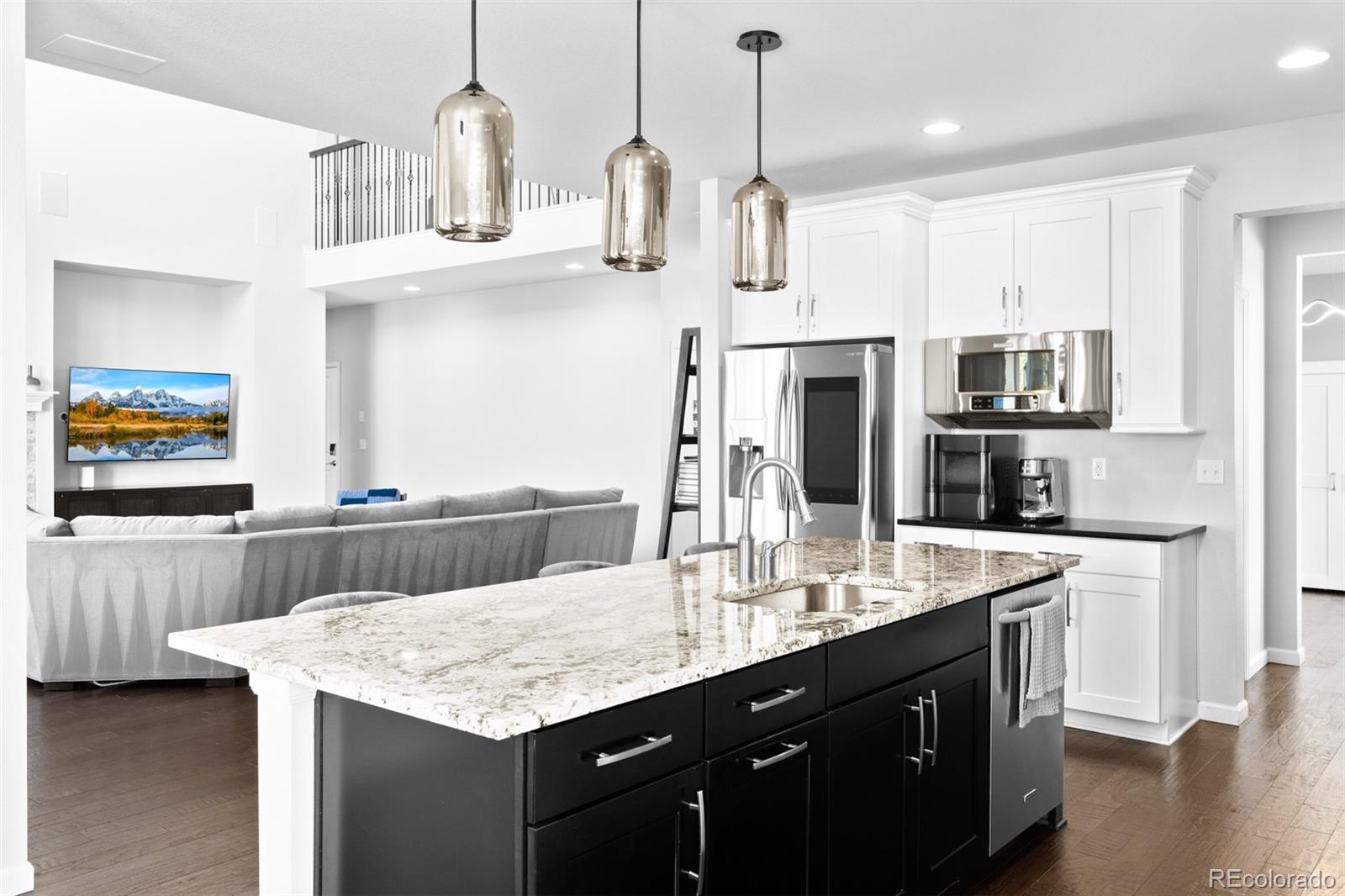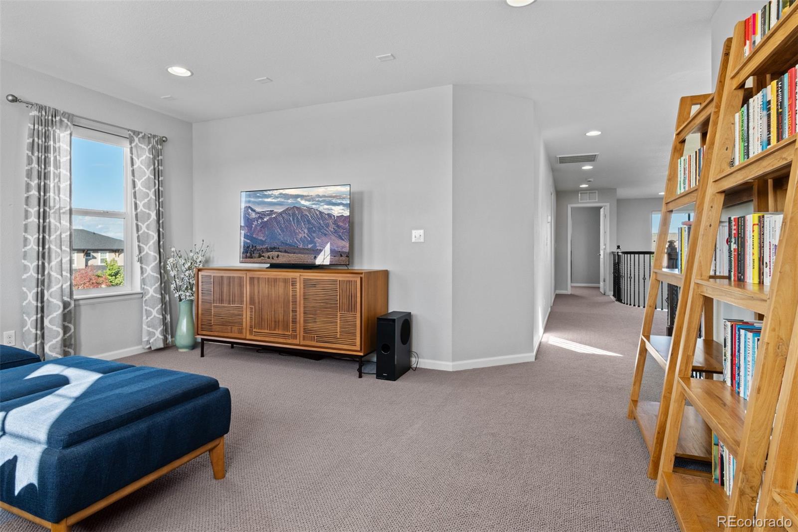 This is your chance to own a stunning move-in-ready home with exceptional views directly across the street from a gorgeous park! The main level of this breathtaking residence is defined by its two-story ceilings, spectacular curved stairwell, ample natural light, mountain views, and fabulous chef's kitchen. The kitchen provides a double oven, quartz countertops, a touch screen smart refrigerator, a large granite island with counter seating, ample prep space, a built-in microwave, a butler's pantry, and a large walk-in pantry. The formal dining room offers easy access to the kitchen, and the casual dining space adjacent to the kitchen is bright and airy-overlooking the backyard and providing easy access to the deck and living room. The living room is light and bright with two stories of windows and a fireplace to keep you warm on cold winter days. A spacious guest bedroom with custom closets, a bathroom with a large walk-in shower, and a beautiful office are all also conveniently located on the main level. The second level is home to the primary suite with its huge custom walk-in closet and 5-piece en suite bathroom. Two additional bedrooms, a shared full bathroom, a laundry room (washer/dryer included), and a bonus loft room (perfect as another living room or a flex space) complete the second level. A large unfinished basement offers endless potential for additional functional living space and/or storage. Two attached garages with a total of three garage bays ensure that all of your vehicles and equipment stay dry on wet days! Outside, the rear deck is the perfect place for meals and entertaining, and the corner lot is exceptional with a bonus grass space to the west and a beautiful park across the street to the south with its trails, playground, and more! This amazing home offers easy access to Denver International Airport, downtown Denver, Boulder, and so much more. Don't miss the opportunity to make this incredible home your own! Buyer to verify all information.