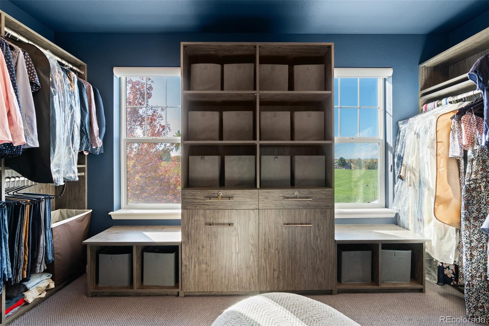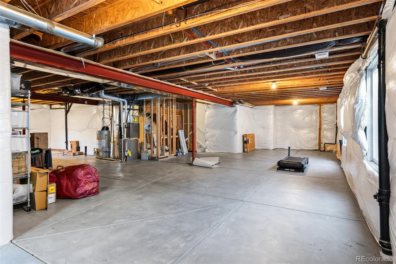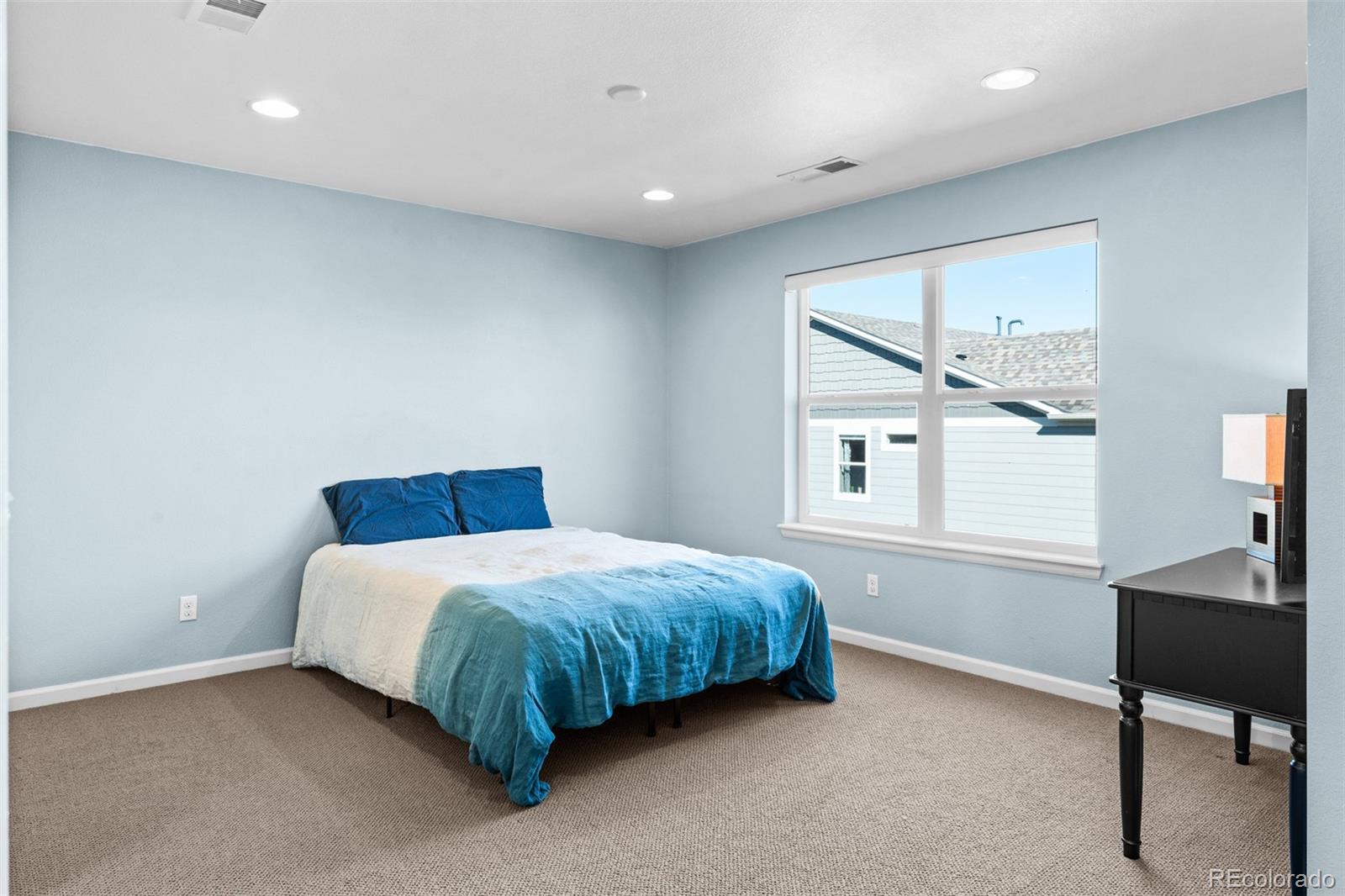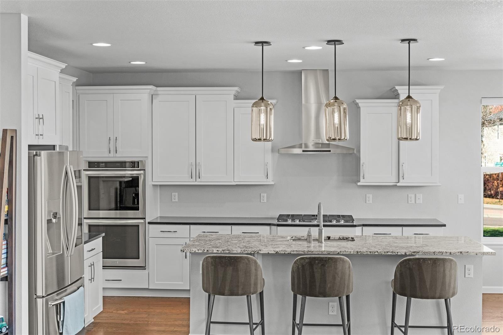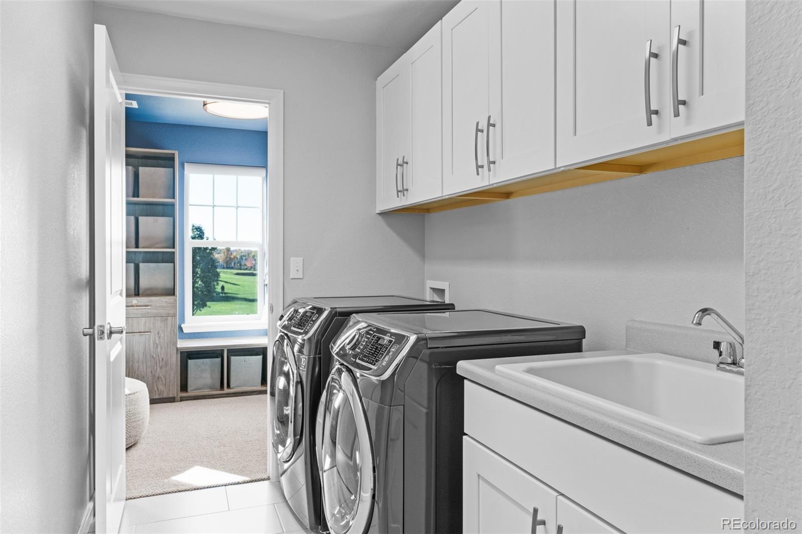 This is your chance to own a stunning move-in-ready home with exceptional views directly across the street from a gorgeous park! The main level of this breathtaking residence is defined by its two-story ceilings, spectacular curved stairwell, ample natural light, mountain views, and fabulous chef's kitchen. The kitchen provides a double oven, quartz countertops, a touch screen smart refrigerator, a large granite island with counter seating, ample prep space, a built-in microwave, a butler's pantry, and a large walk-in pantry. The formal dining room offers easy access to the kitchen, and the casual dining space adjacent to the kitchen is bright and airy-overlooking the backyard and providing easy access to the deck and living room. The living room is light and bright with two stories of windows and a fireplace to keep you warm on cold winter days. A spacious guest bedroom with custom closets, a bathroom with a large walk-in shower, and a beautiful office are all also conveniently located on the main level. The second level is home to the primary suite with its huge custom walk-in closet and 5-piece en suite bathroom. Two additional bedrooms, a shared full bathroom, a laundry room (washer/dryer included), and a bonus loft room (perfect as another living room or a flex space) complete the second level. A large unfinished basement offers endless potential for additional functional living space and/or storage. Two attached garages with a total of three garage bays ensure that all of your vehicles and equipment stay dry on wet days! Outside, the rear deck is the perfect place for meals and entertaining, and the corner lot is exceptional with a bonus grass space to the west and a beautiful park across the street to the south with its trails, playground, and more! This amazing home offers easy access to Denver International Airport, downtown Denver, Boulder, and so much more. Don't miss the opportunity to make this incredible home your own! Buyer to verify all information.