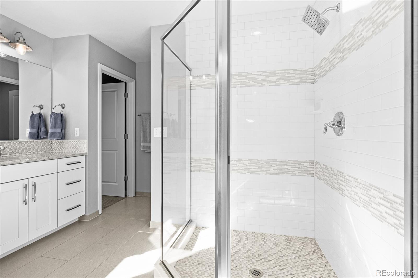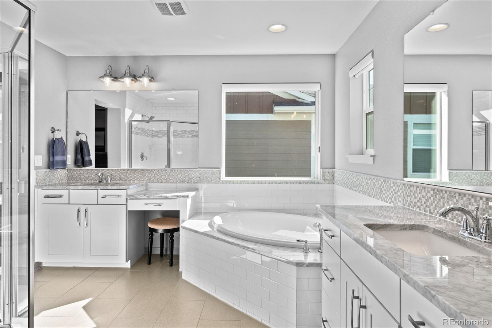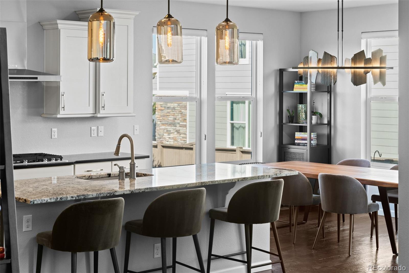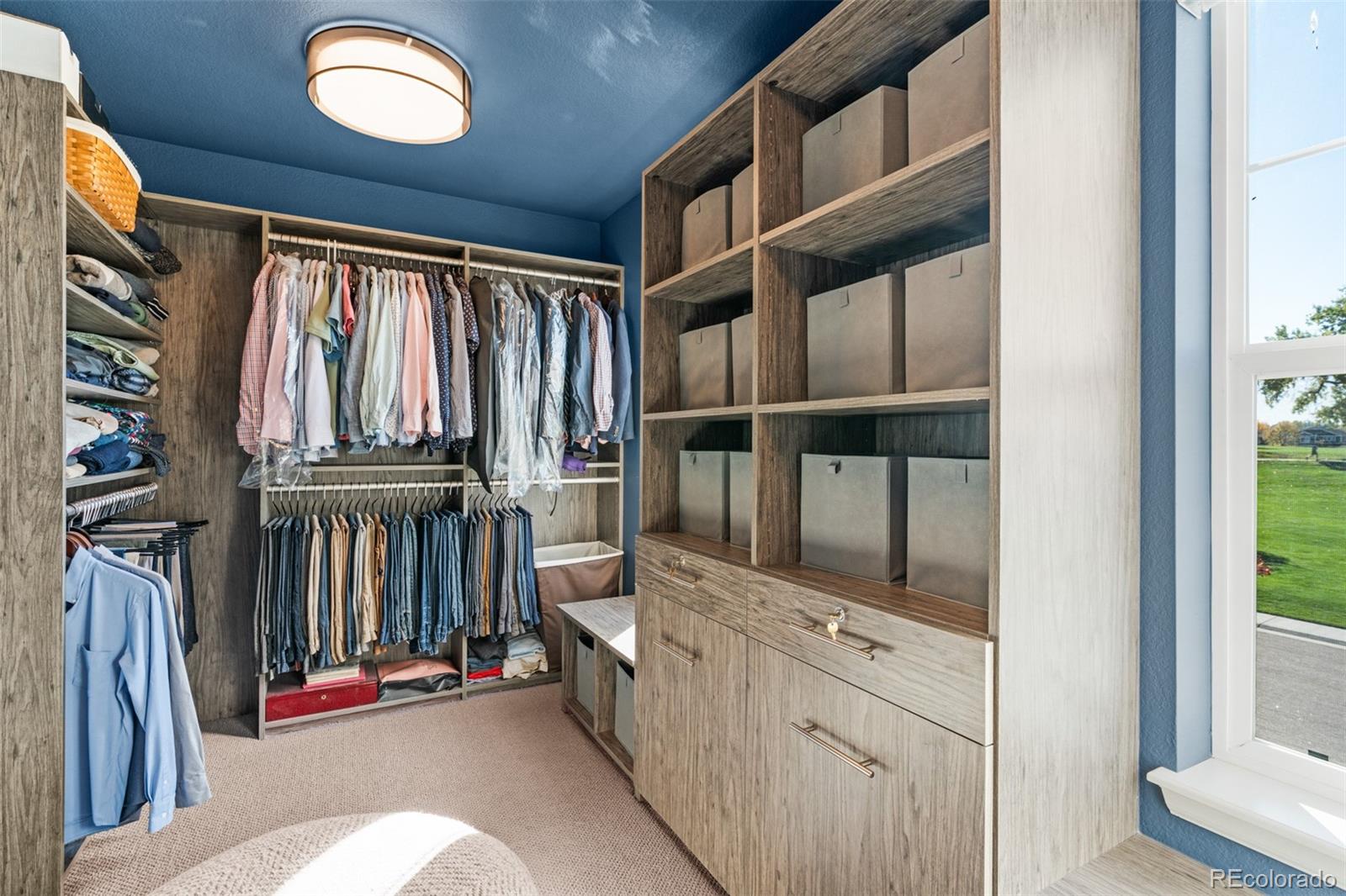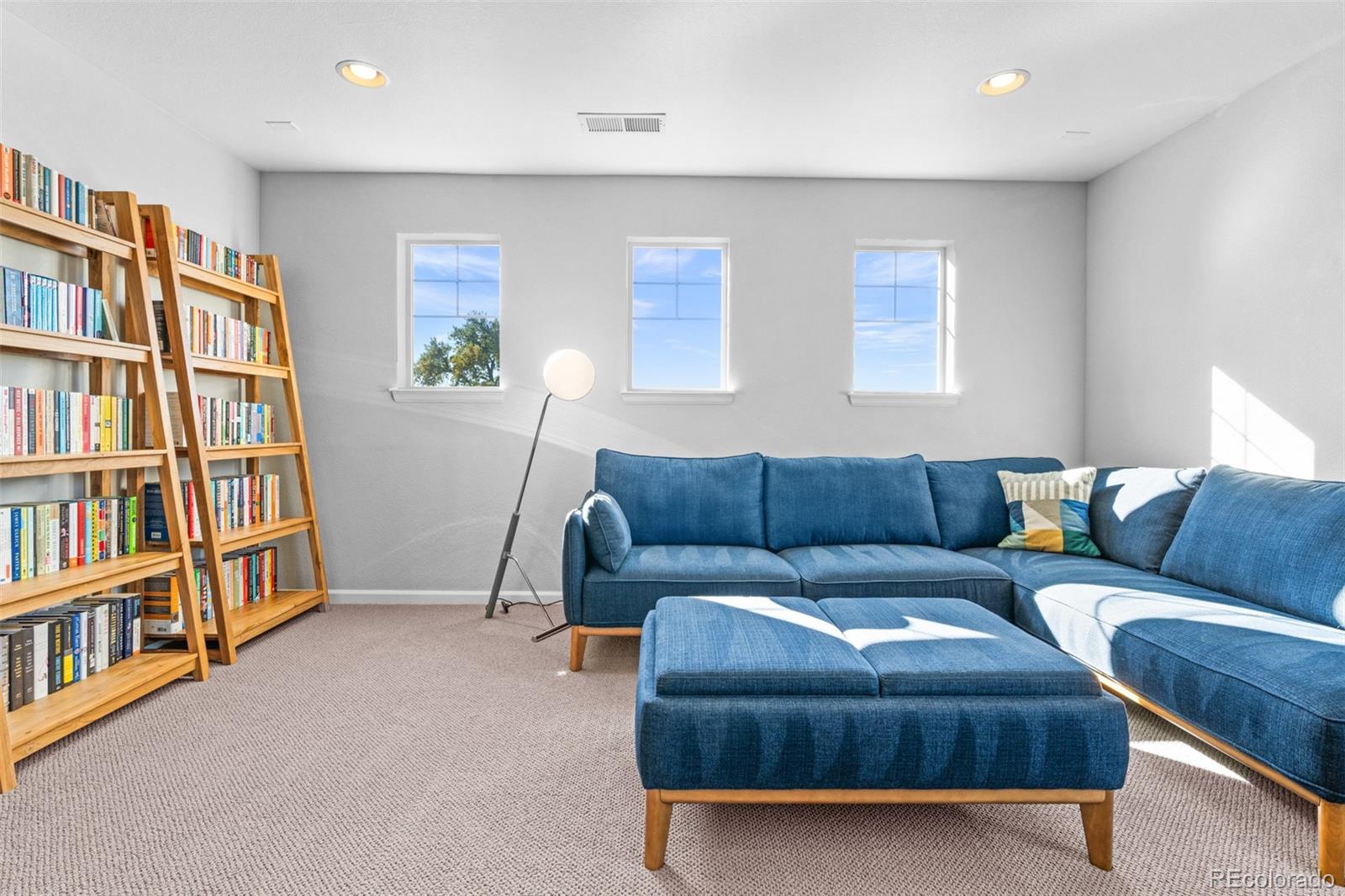 This is your chance to own a stunning move-in-ready home with exceptional views directly across the street from a gorgeous park! The main level of this breathtaking residence is defined by its two-story ceilings, spectacular curved stairwell, ample natural light, mountain views, and fabulous chef's kitchen. The kitchen provides a double oven, quartz countertops, a touch screen smart refrigerator, a large granite island with counter seating, ample prep space, a built-in microwave, a butler's pantry, and a large walk-in pantry. The formal dining room offers easy access to the kitchen, and the casual dining space adjacent to the kitchen is bright and airy-overlooking the backyard and providing easy access to the deck and living room. The living room is light and bright with two stories of windows and a fireplace to keep you warm on cold winter days. A spacious guest bedroom with custom closets, a bathroom with a large walk-in shower, and a beautiful office are all also conveniently located on the main level. The second level is home to the primary suite with its huge custom walk-in closet and 5-piece en suite bathroom. Two additional bedrooms, a shared full bathroom, a laundry room (washer/dryer included), and a bonus loft room (perfect as another living room or a flex space) complete the second level. A large unfinished basement offers endless potential for additional functional living space and/or storage. Two attached garages with a total of three garage bays ensure that all of your vehicles and equipment stay dry on wet days! Outside, the rear deck is the perfect place for meals and entertaining, and the corner lot is exceptional with a bonus grass space to the west and a beautiful park across the street to the south with its trails, playground, and more! This amazing home offers easy access to Denver International Airport, downtown Denver, Boulder, and so much more. Don't miss the opportunity to make this incredible home your own! Buyer to verify all information.