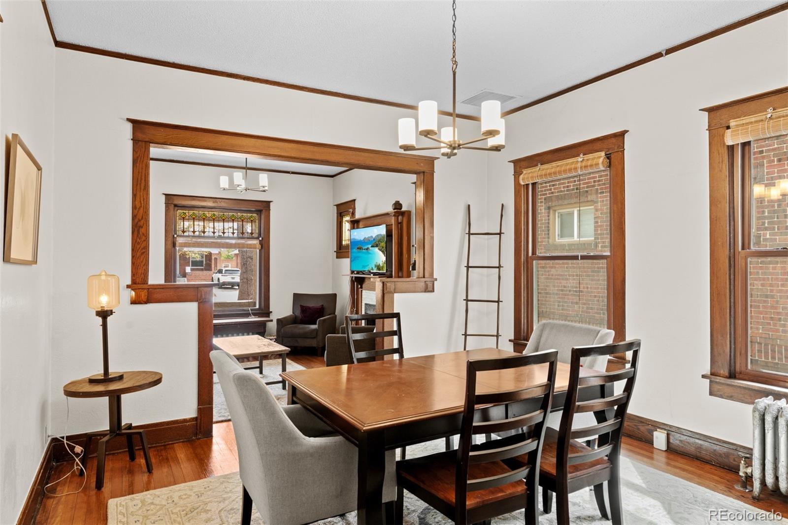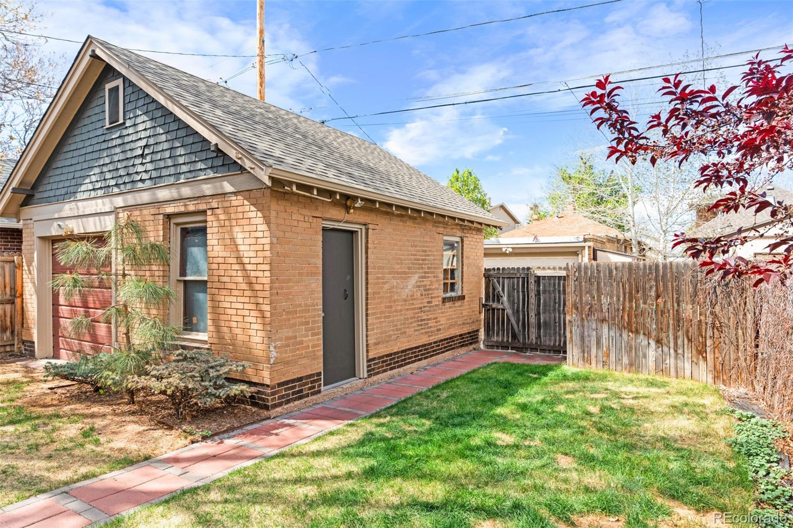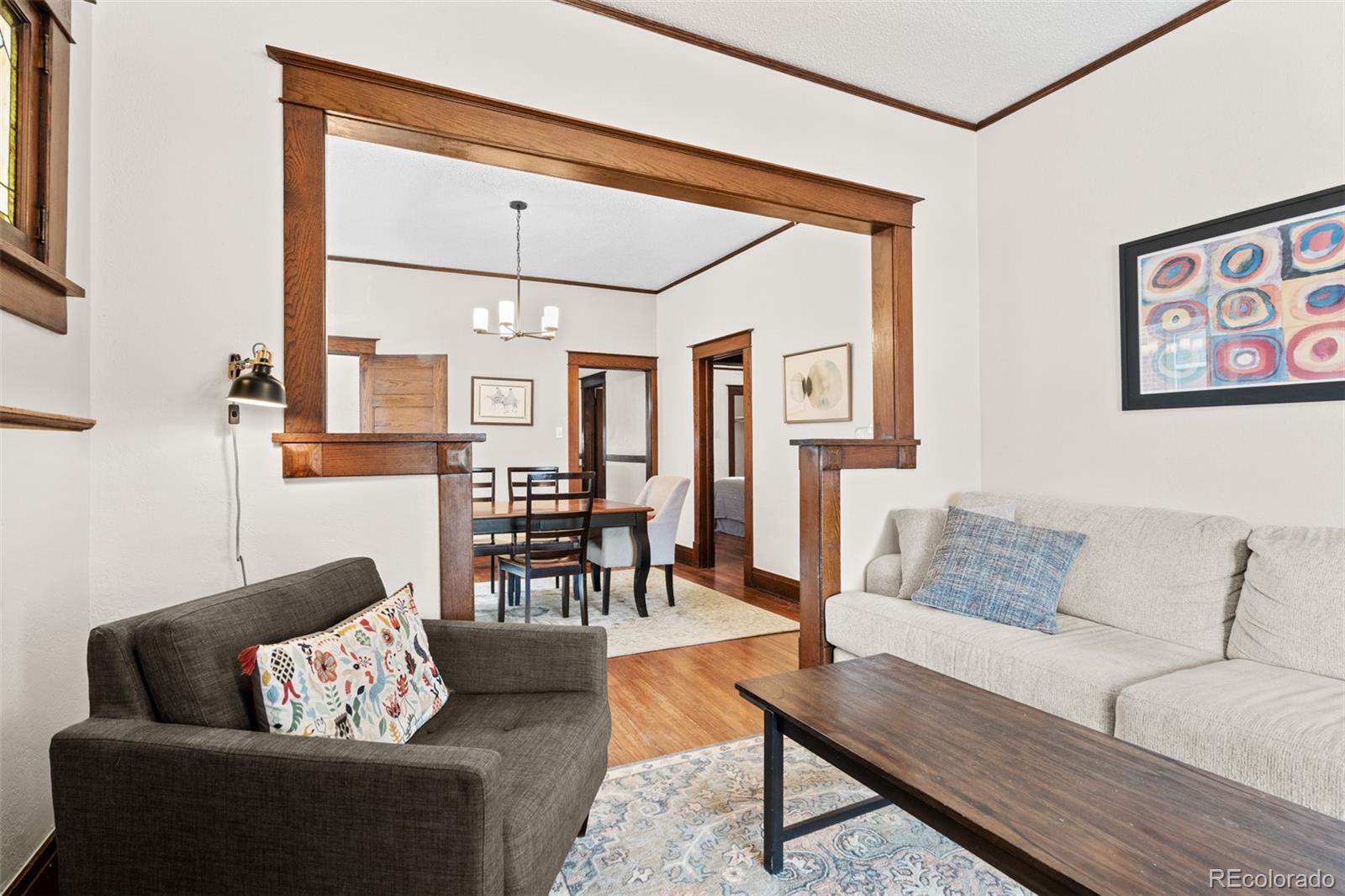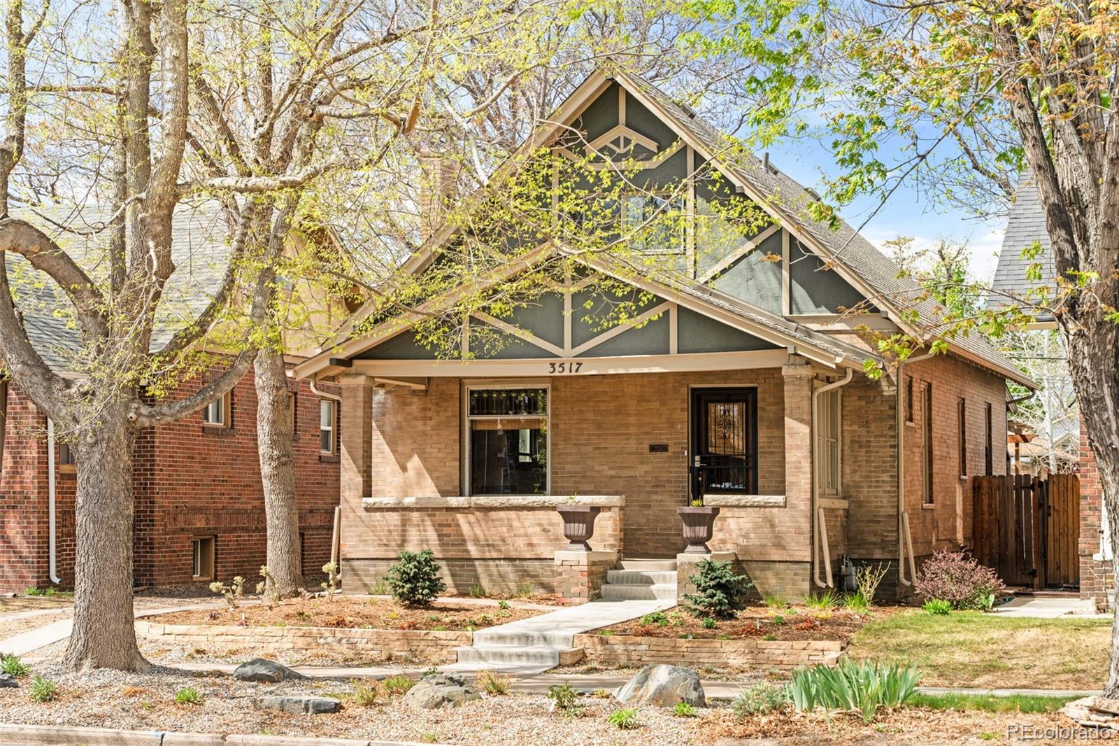 This classic Craftsman bungalow, located in one of Denver's oldest neighborhoods, Cole, is a perfect architectural example of the one-and-one-half-story bungalows the area is known for: from the low-pitched roofline with overhanging eaves to the exposed rafter ends and false half-timbering. Built in 1912 and framed by mature trees, this 4-bedroom, 4-bathroom home welcomes you in with its recently updated xeriscaped front yard and charming front porch. The main level features an entry foyer, a front-facing living room anchored by a wood-burning fireplace flanked by leadlights, a dining room, original millwork and hardwood floors, timeless single hung windows, and a large front window with a stained glass transom. The kitchen offers ample prep and storage space with its walk-in pantry, and the mud room features more shelving and a desk. Unlike similar homes in the area, the main level also includes a primary suite with a full bathroom and a walk-through closet, a second bedroom with a walk-in closet, and a 3/4 hallway bathroom. Upstairs, two additional bedrooms and a 3/4 bathroom provide flexibility, whether used as distinct bedrooms or combined to create a more private primary suite. The finished lock-off basement offers even more flexibility and income potential with its galley kitchenette (cooktop/refrigerator/sink), a family room, and a sleeping den with a custom reach-in closet. The basement laundry room can be locked off and accessed via a separate stairway through the kitchen. The back yard is perfect for outdoor entertaining and features a Trex deck, a pergola with string lighting, new sod, and access to the detached two-car garage. The location is phenomenal, with close proximity to City Park, great restaurants and coffee shops (Yacht Club, Brasserie Brixton, Nola Voodoo Tavern, and Rivers and Roads Coffee), Russell Square Park, York Street Yards, and RiNo. Easy access to downtown Denver, the light rail, I-25, and I-70. Buyer to verify all information.