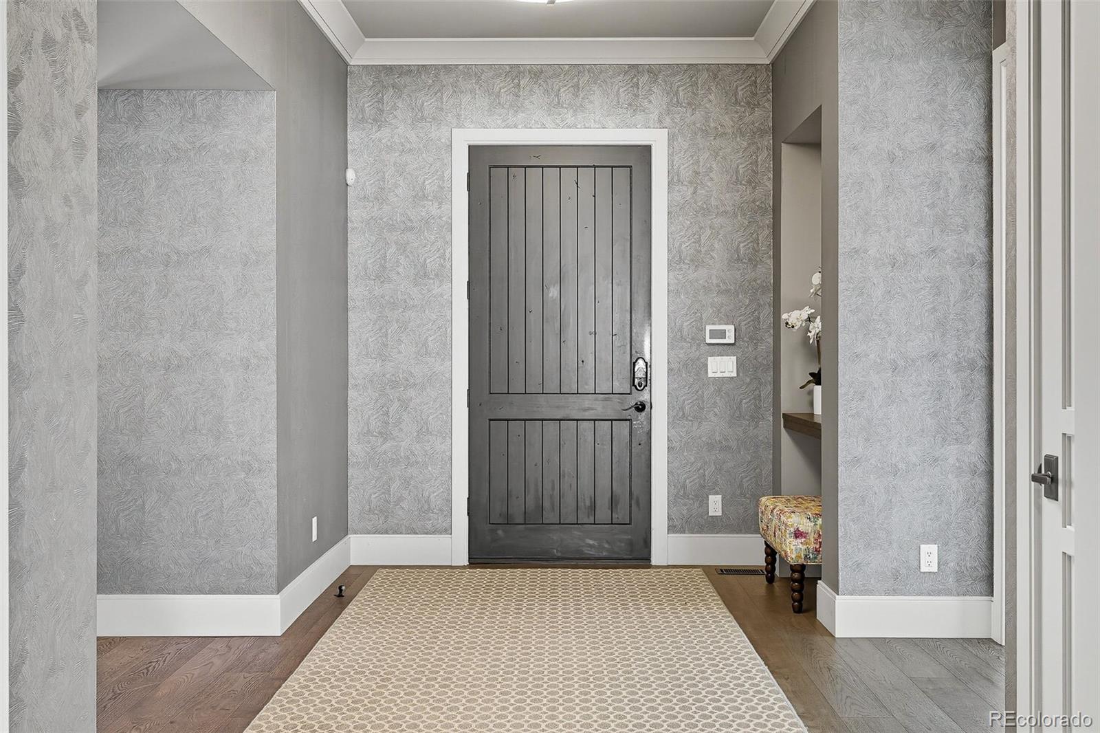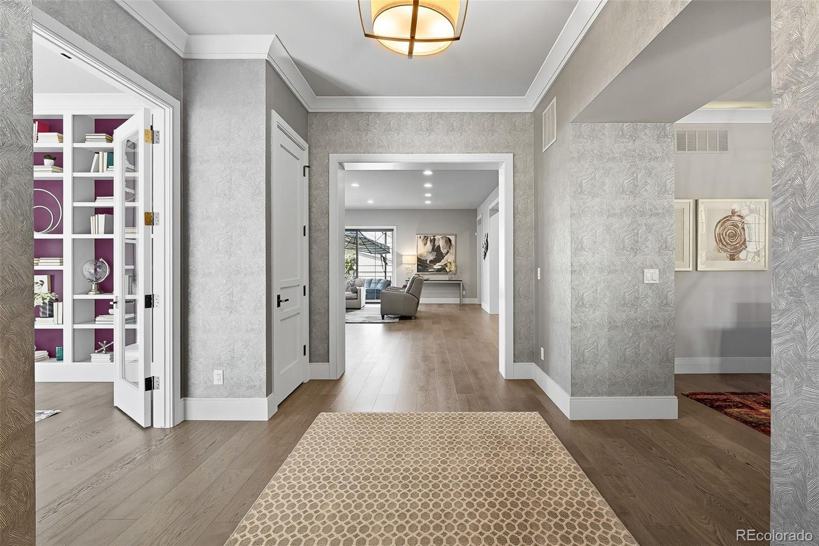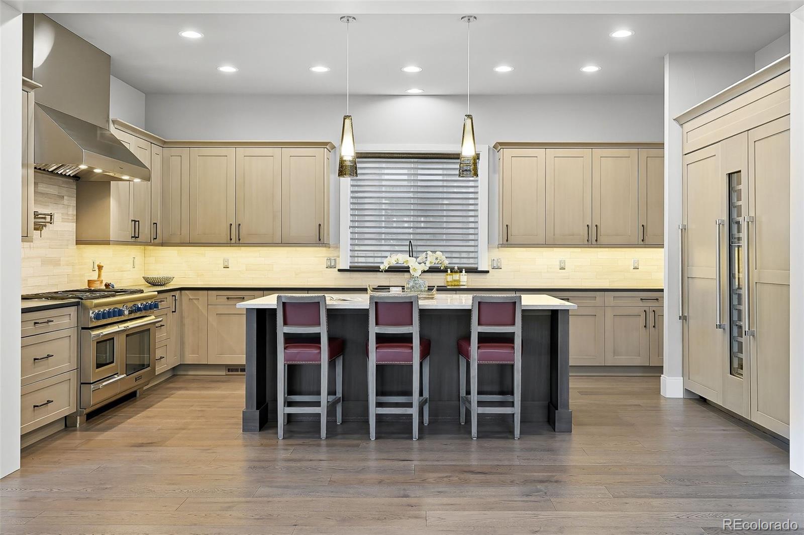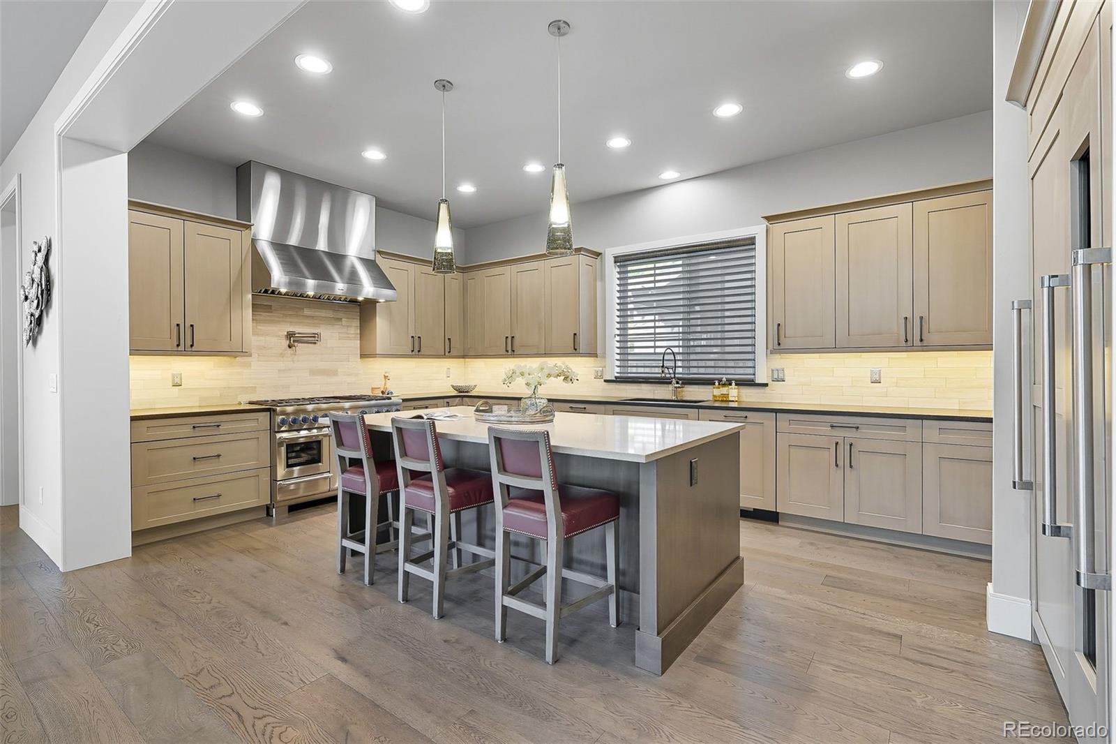 The main floor is designed with both everyday living and entertaining in mind. At its center, the chef's kitchen features an oversized island, built-in Thermador refrigerator and freezer, wine refrigerator, 48-inch Thermador range with water spout, and two dishwashers. The pantry provides added storage, while the adjacent formal dining area is ideal for gatherings. The open-concept family room with gas fireplace flows into a private office with custom built-ins, a stylish powder bath, and a functional mudroom with laundry and utility sink.