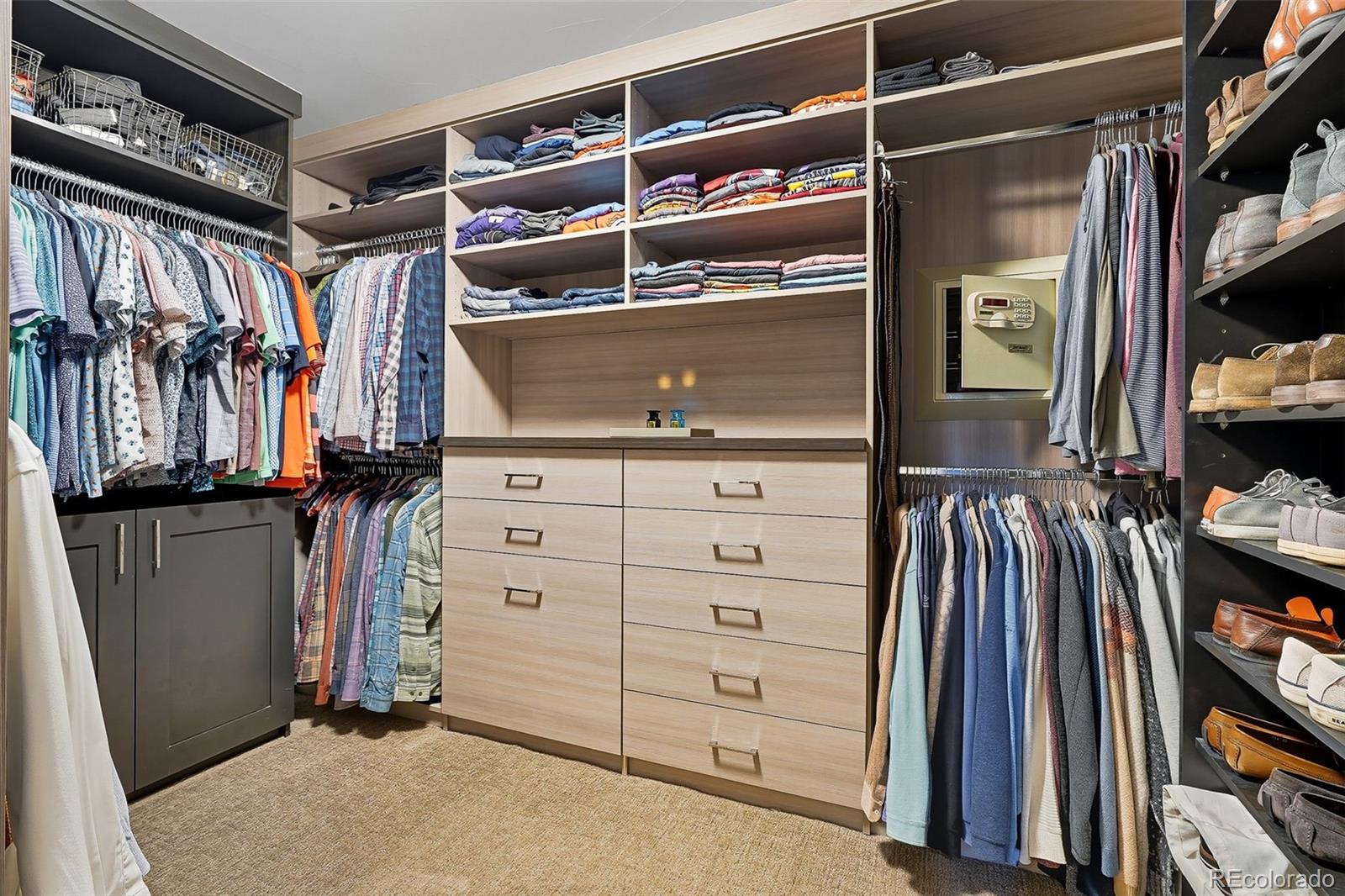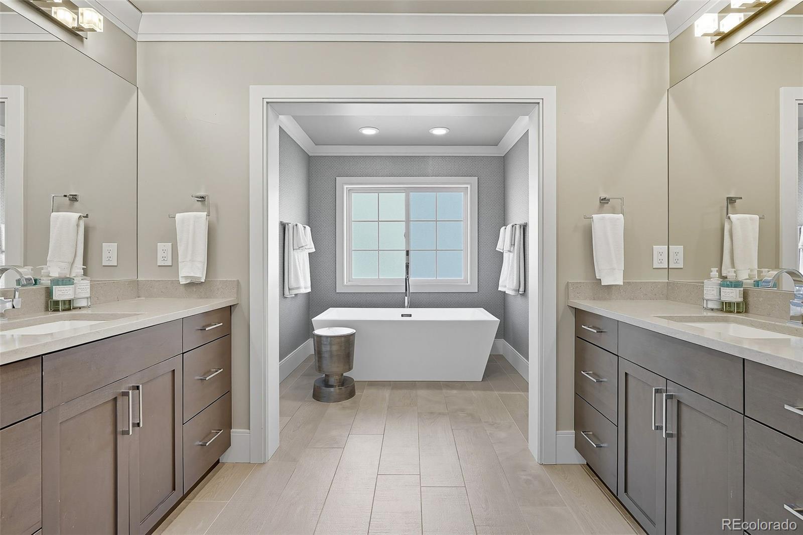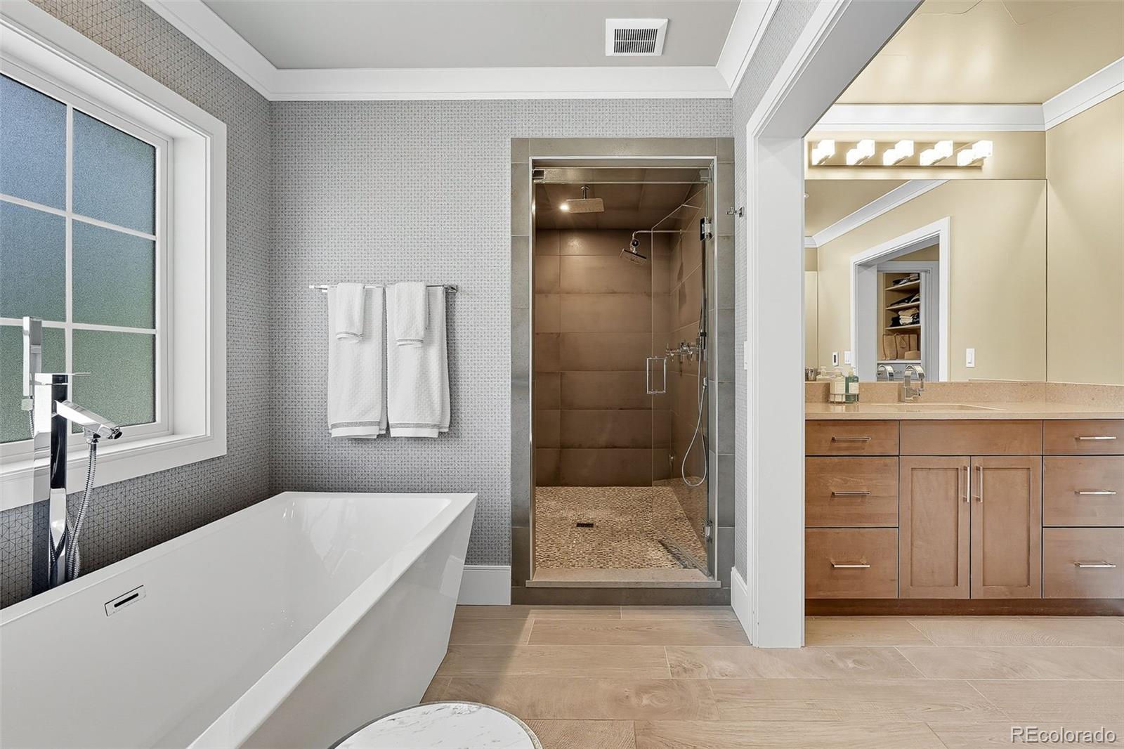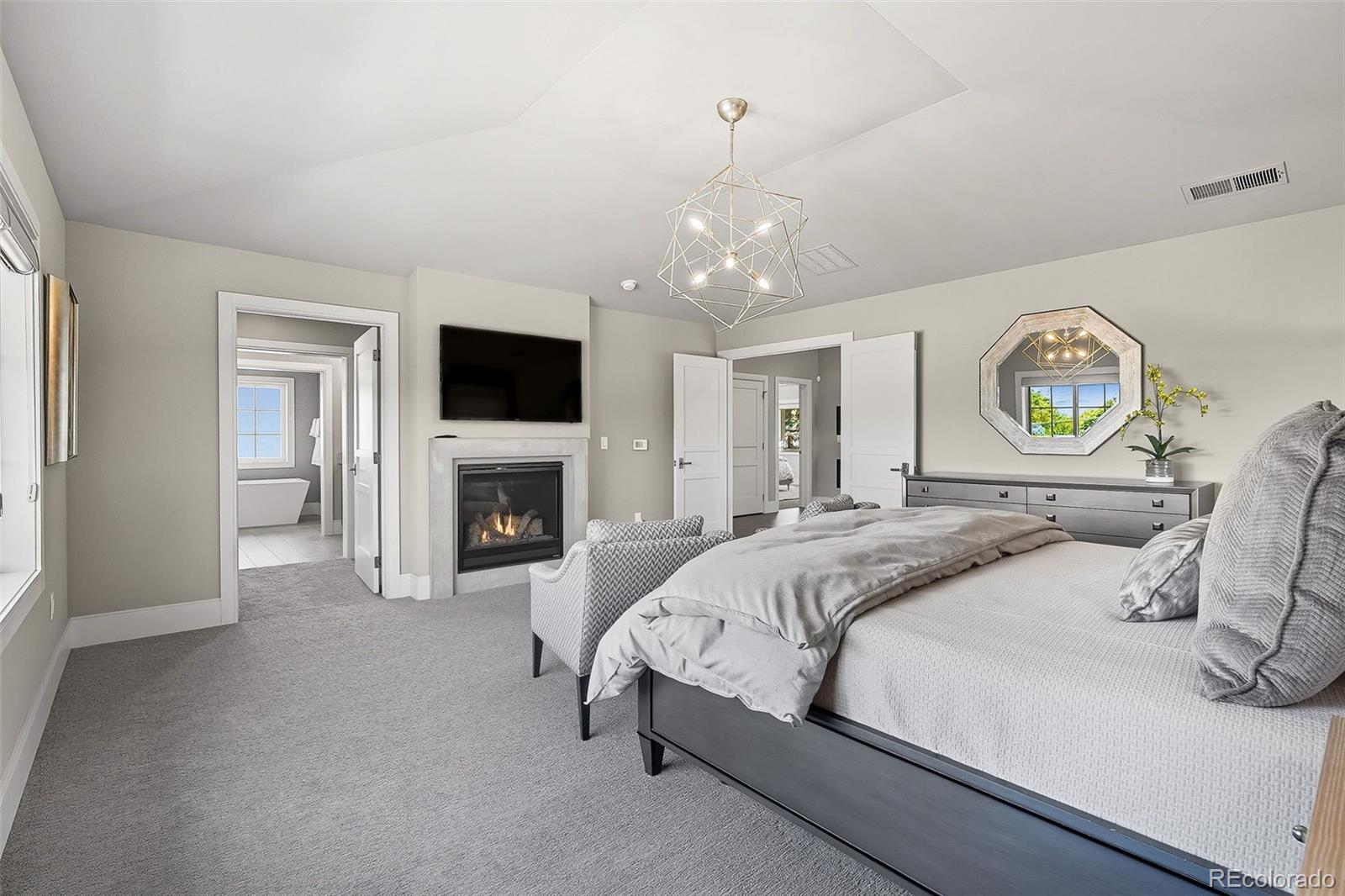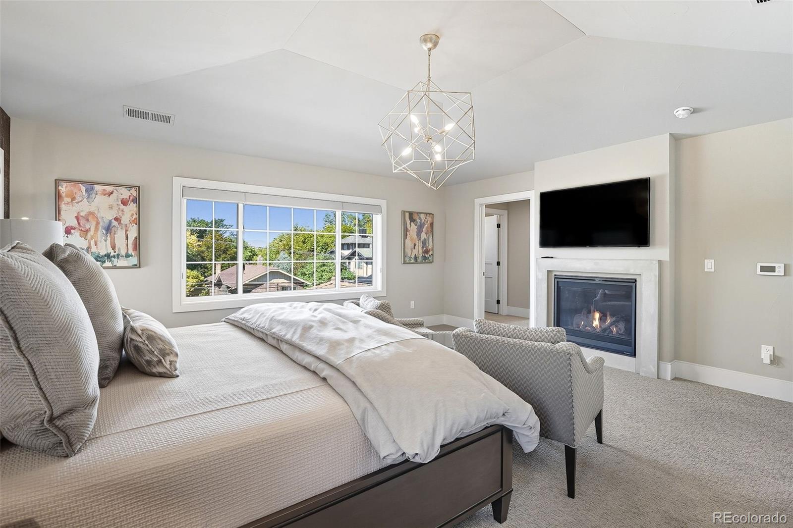 Upstairs, the spacious primary suite offers a retreat with a gas fireplace, two custom walk-in closets, and a spa-like five-piece bath complete with a steam shower and heated floors. Two additional bedrooms each feature their own custom closets and ensuite baths for comfort and privacy.
