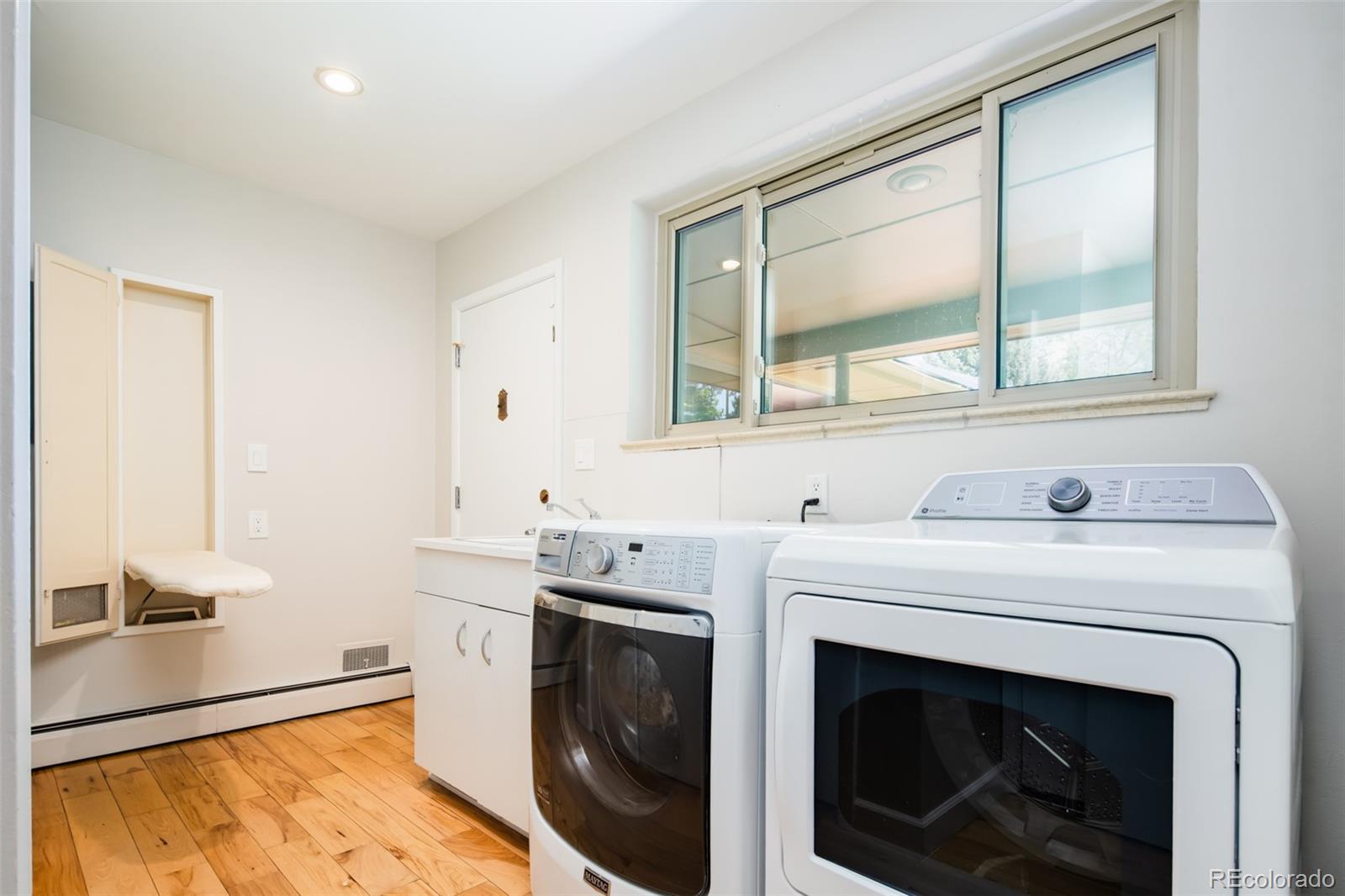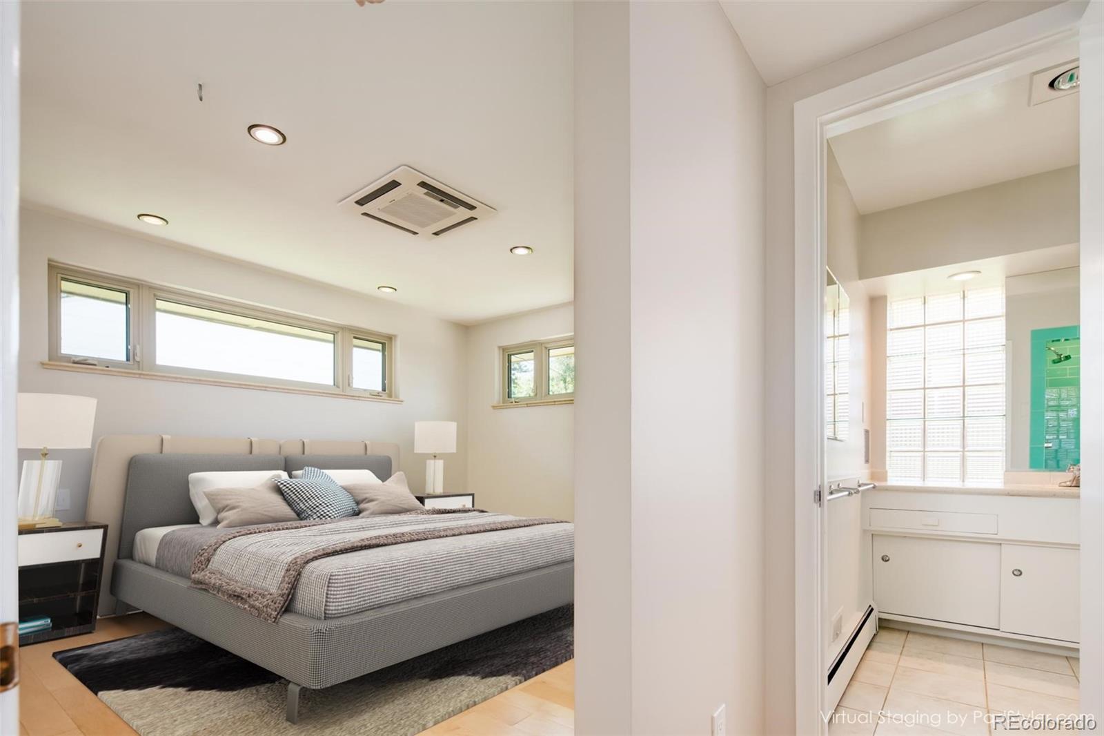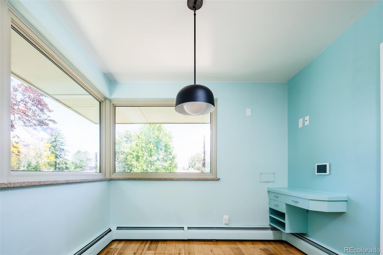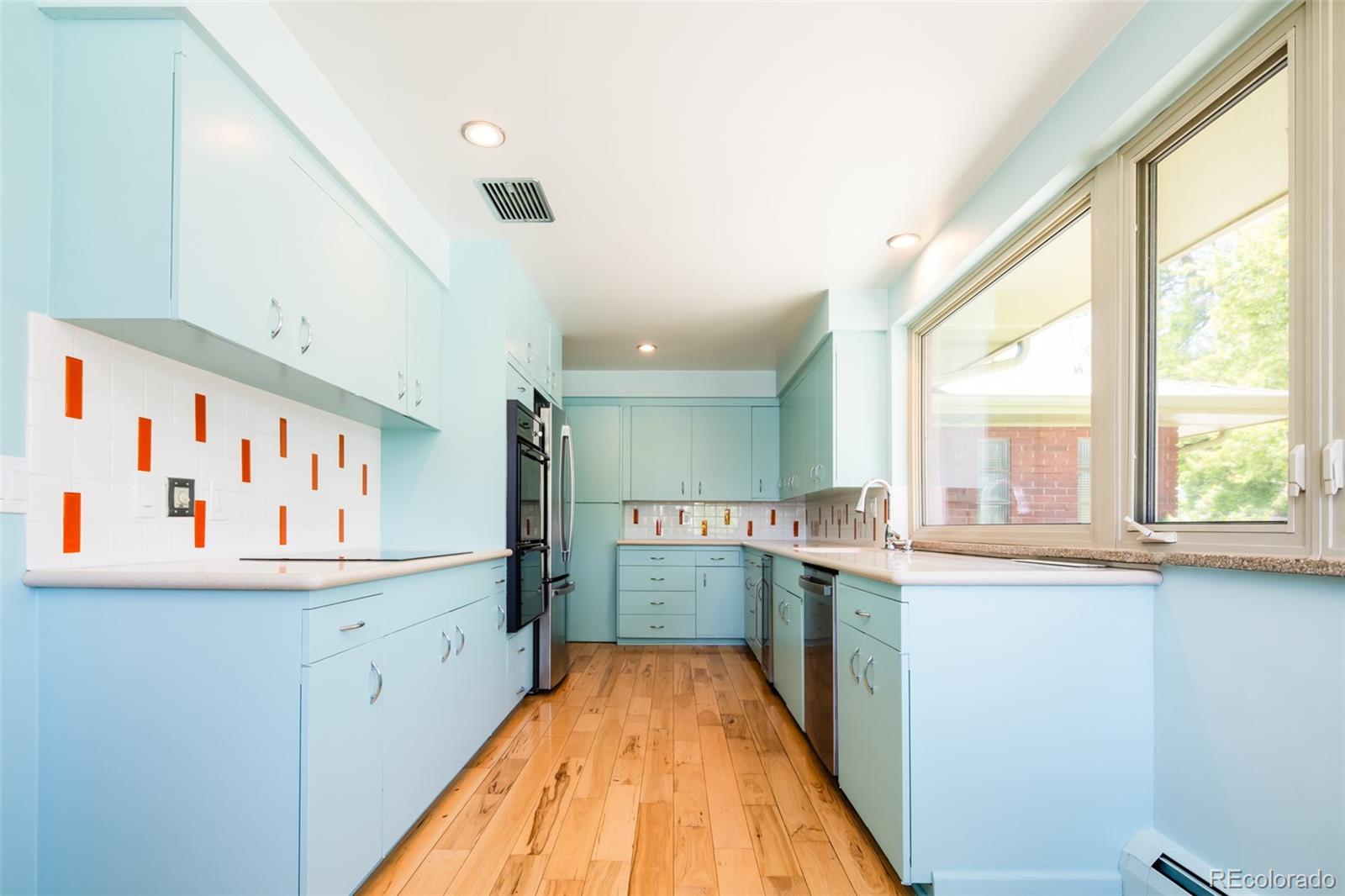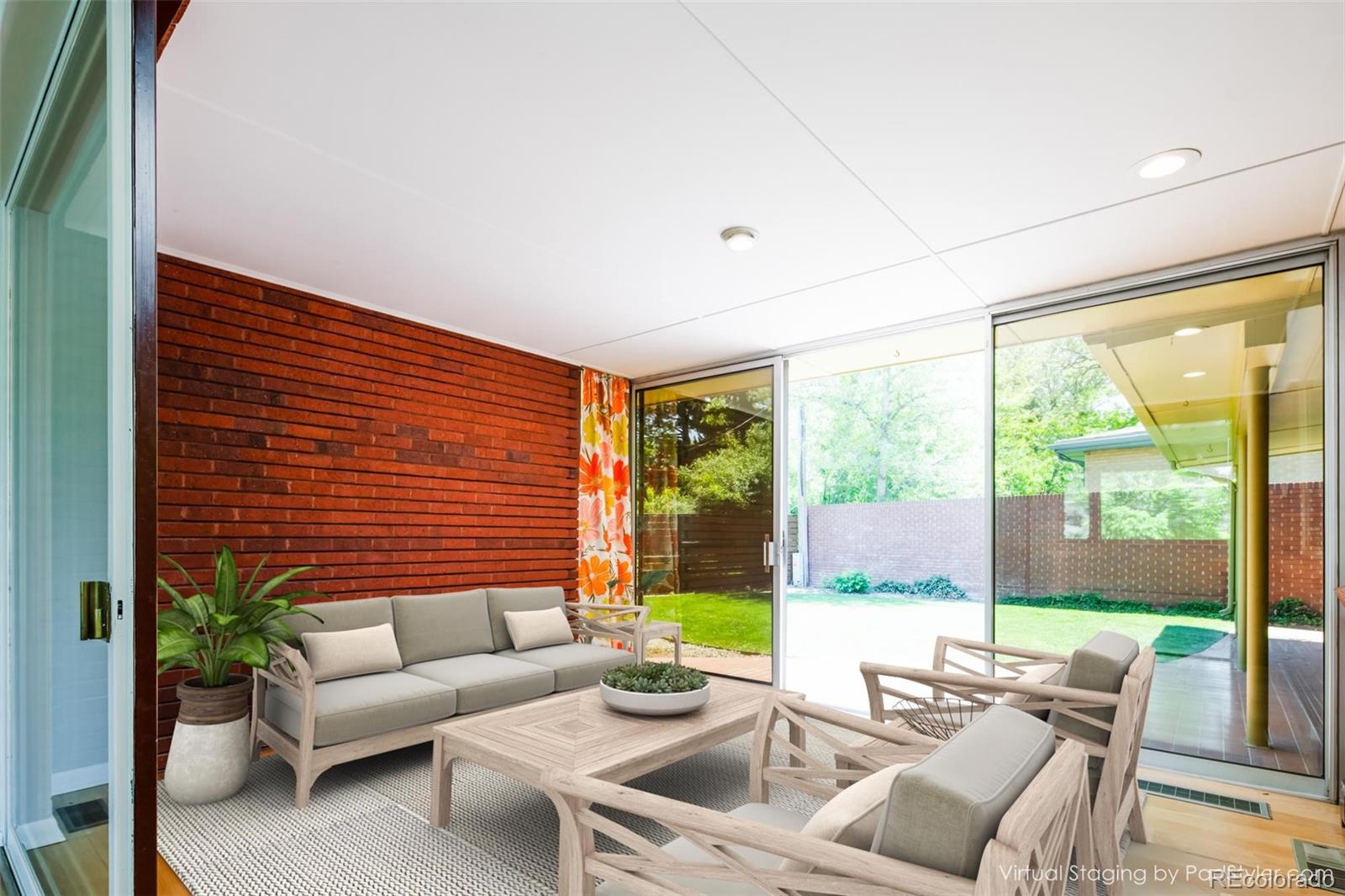 Mid-Century Marvel on a Prime Corner Lot in Mayfair Park. Perfectly positioned on a lush corner lot, this striking Mid-Century Modern residence stands as a true gem in one of Denver's most desirable neighborhoods. From the moment you step through the front door, you'll feel the timeless charm and thoughtful design that define this home. Main-floor living is yours in this beautifully maintained property where original architectural details remain intact. The spacious living room, complete with a cozy gas fireplace, joins seamlessly into a light-filled sunroom and an elegant formal dining space--perfect for both relaxing and entertaining. The vintage kitchen is a delight, with two walls of windows that bathe the space in natural light and a casual dining nook ideal for morning coffee. Down the hall, discover three generously sized bedrooms, including a primary suite with an en-suite 3/4 bathroom. Two additional bedrooms share a full bath that adds a playful touch with its original tile featuring whimsical penguins. Function meets style with a dedicated laundry/mudroom, a convenient half-bath, and access to the oversized two-car garage. Comfort is key here, with individual A/C units for the living room and all bedrooms, baseboard hot water heat, and an active solar system to help keep utility costs low year-round.